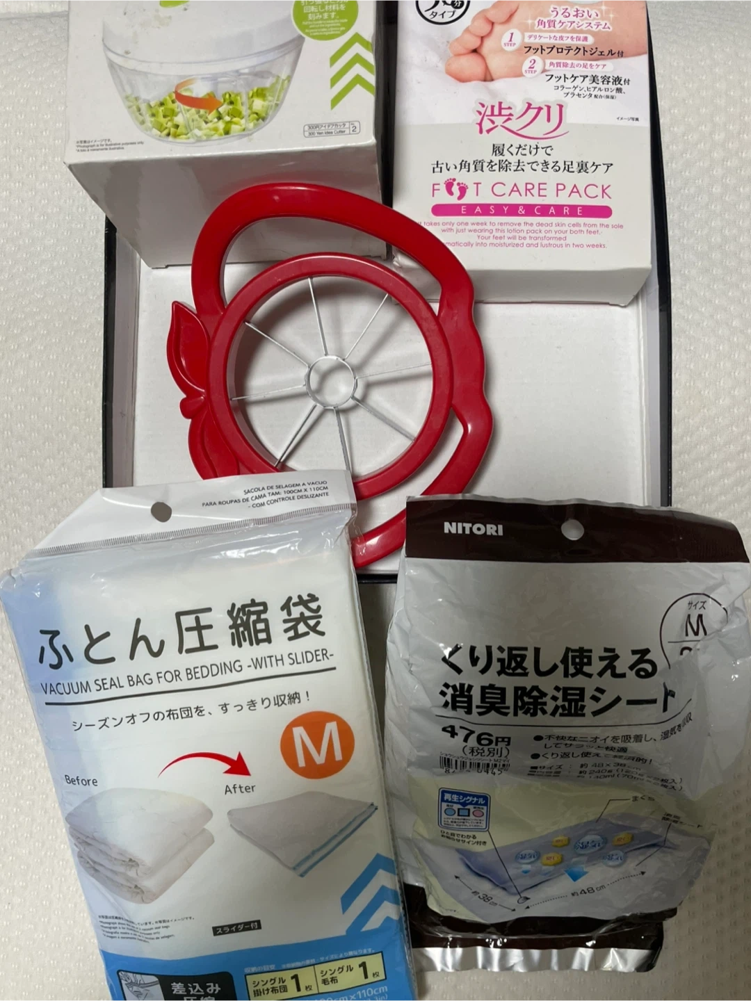 雑貨ふとん圧縮袋、消臭除湿シート、野菜カッターなど