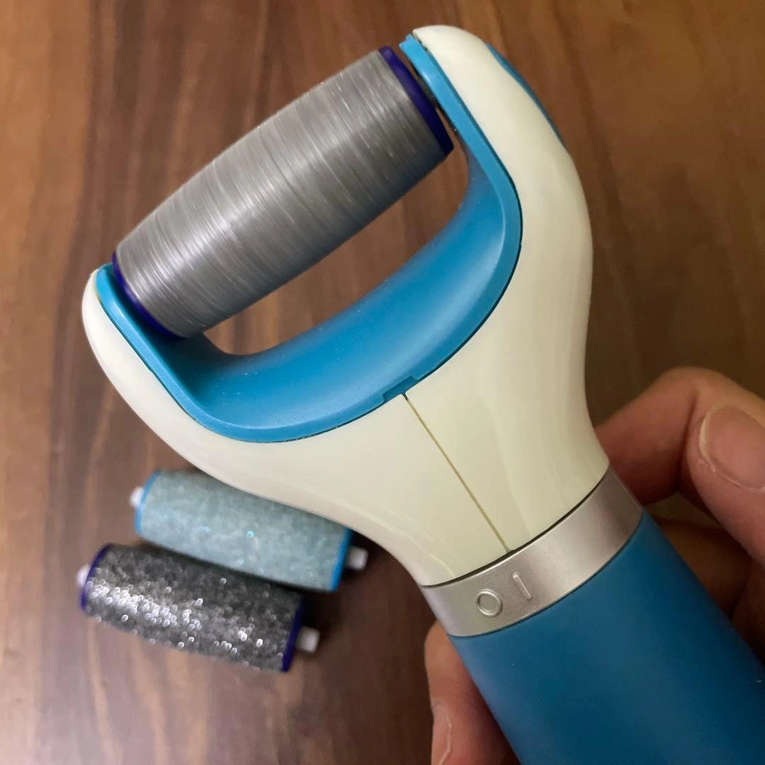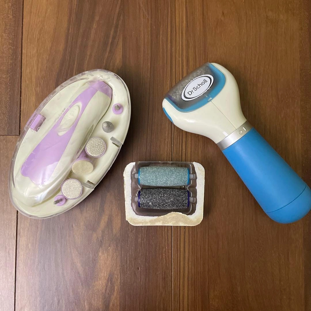 電動フットケアセット、交換用ローラー付きです。 ①細かい部分もケアできるパープル。 ②かかと用ブルー。と、その付属品の2点セットです。 - 機能: 電動フットケア、角質除去 - 付属品: 収納ケース - ローラータイプ: 粗目、細目 パープルの方はケースあり。ケースに少しキズはありますが、未使用品です。 ブルーの方はケースありません。付属品はあります。 電池を入れて動く確認はしました。 ご理解のある方のみ、よろしくお願いします。 ご覧いただきありがとうございます。 ご希望の方はお気軽にご連絡ください。