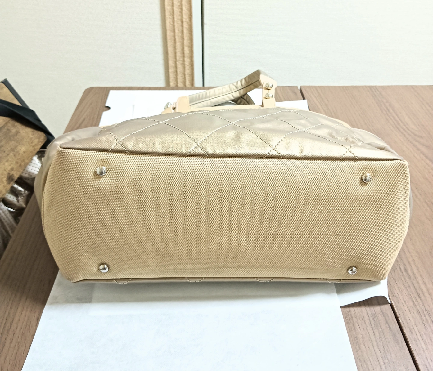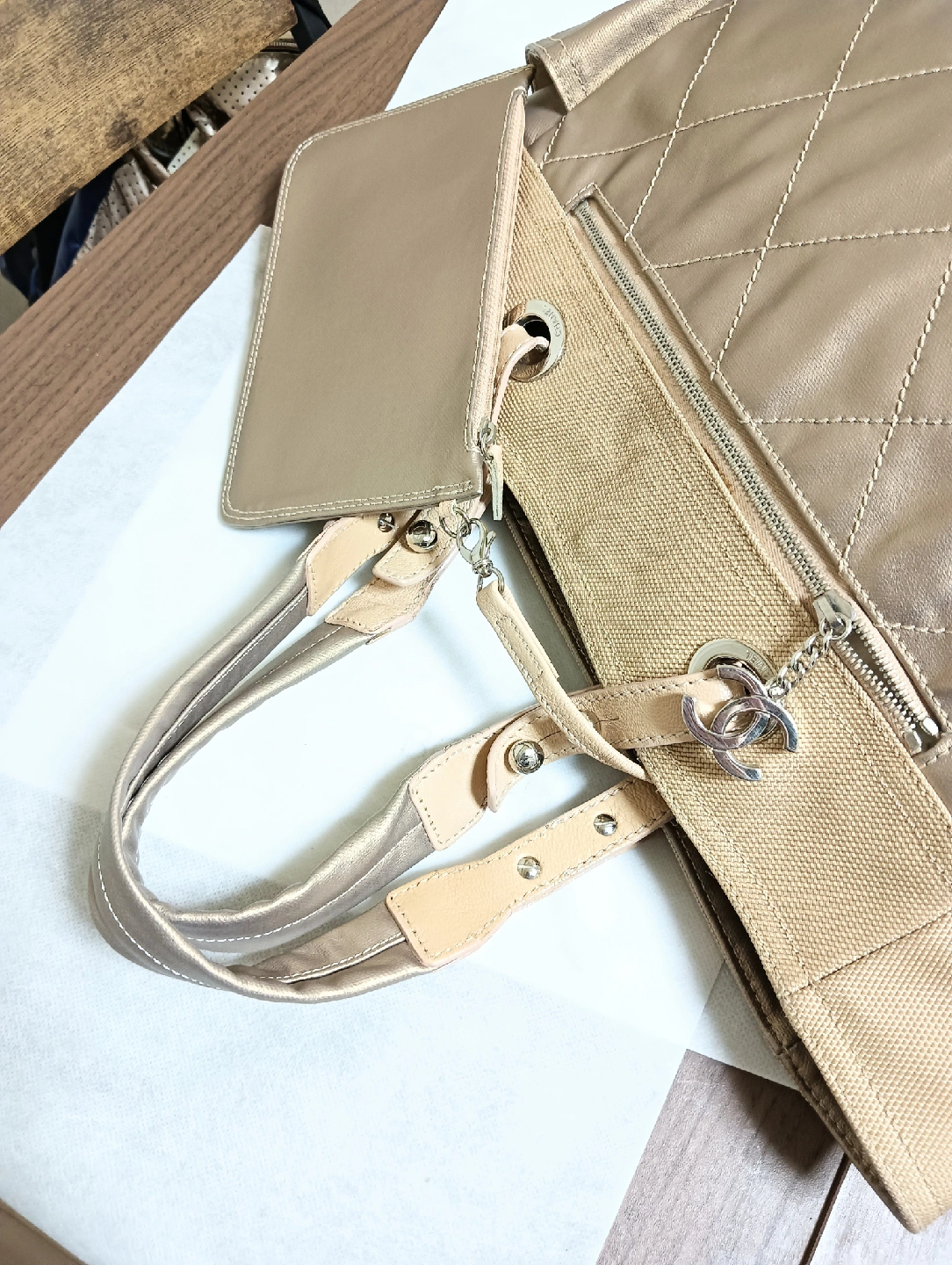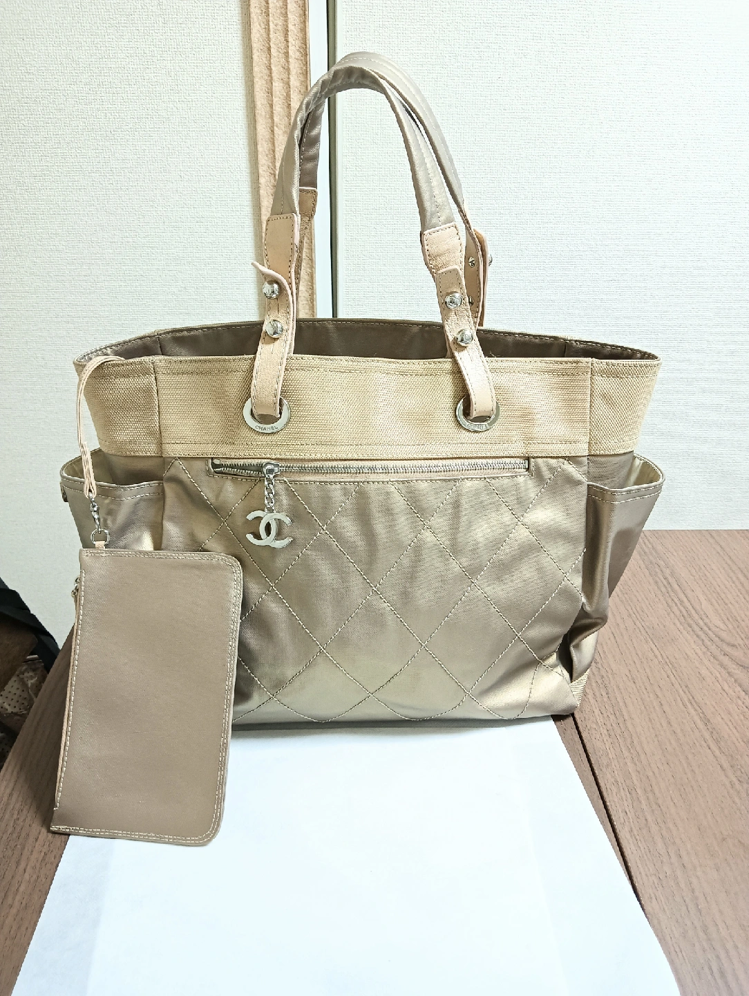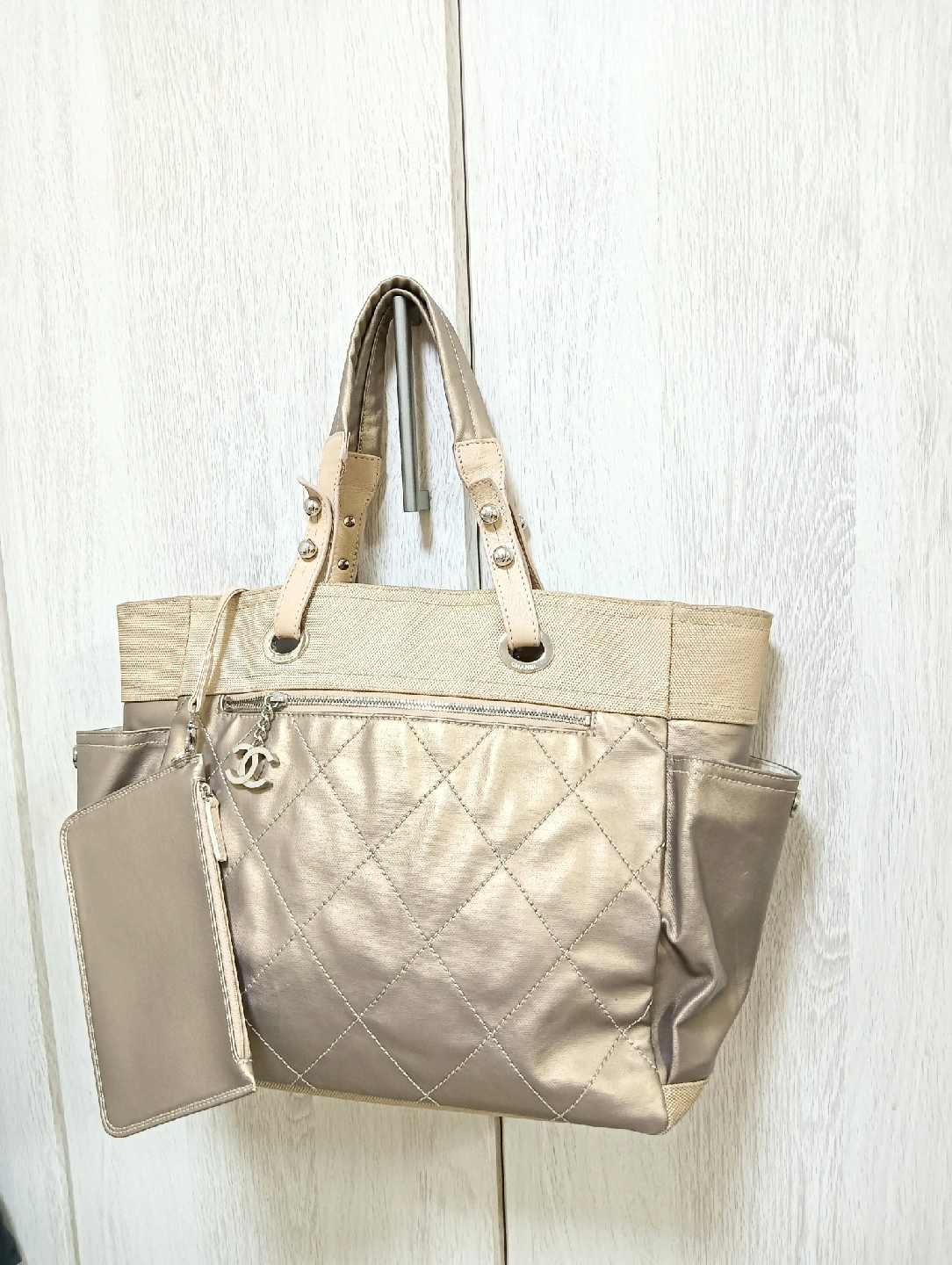 ★★ CHANEL シャネル パリビアリッツGM コーティングキャンバス ポーチ付 き トートバッグ ★★ 相変わらず人気なCHANELのパリビアリッツです。 こちらはサイドポケット&ポーチ付きのGMで使い勝手も非常に良いバッグだと思います。 ★★ 写真の通り全体的にも非常に良い綺麗な状態ですが、 内側の小さな汚れを拭き取る時のシミが少し感じますのでご容赦。 ★★ size 約 35×30cm マチ約14cm color ゴールド 取り外し出来るポーチ付き ★★ キルティングデザインのゴールドトートバッグ、ポーチ付き。 - ブランド: CHANEL - カラー: ゴールド - スタイル: トートバッグ - 付属品: ポーチ - デザイン: キルティング