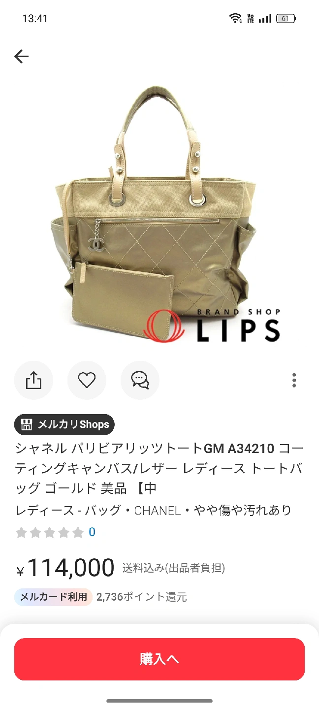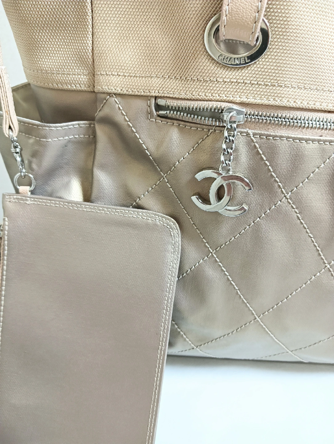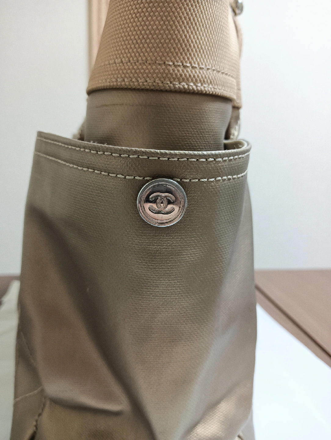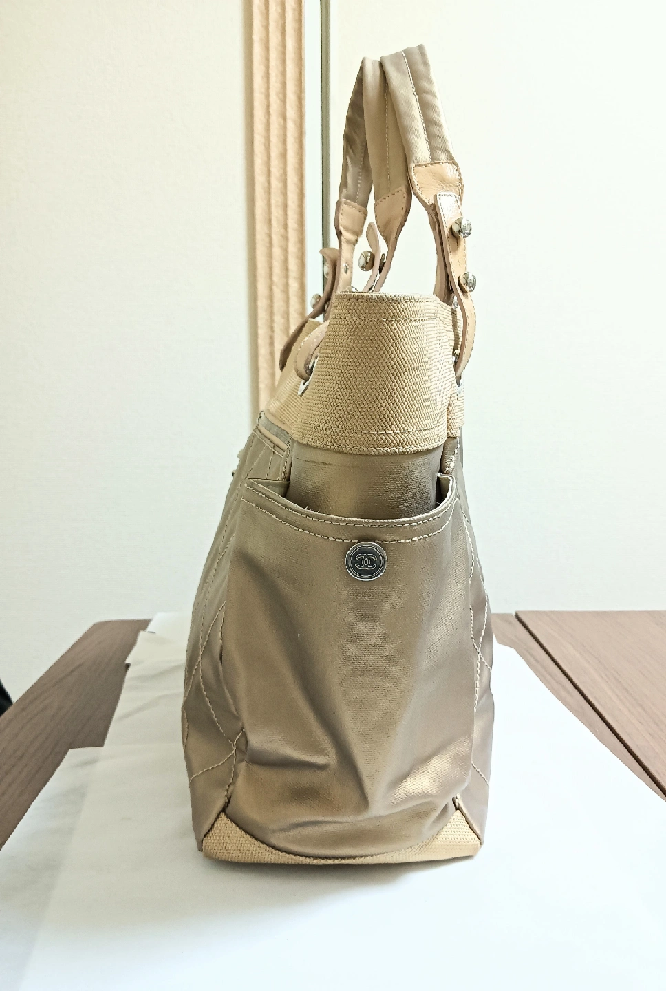 ★★ CHANEL シャネル パリビアリッツGM コーティングキャンバス ポーチ付 き トートバッグ ★★ 相変わらず人気なCHANELのパリビアリッツです。 こちらはサイドポケット&ポーチ付きのGMで使い勝手も非常に良いバッグだと思います。 ★★ 写真の通り全体的にも非常に良い綺麗な状態ですが、 内側の小さな汚れを拭き取る時のシミが少し感じますのでご容赦。 ★★ size 約 35×30cm マチ約14cm color ゴールド 取り外し出来るポーチ付き ★★ キルティングデザインのゴールドトートバッグ、ポーチ付き。 - ブランド: CHANEL - カラー: ゴールド - スタイル: トートバッグ - 付属品: ポーチ - デザイン: キルティング