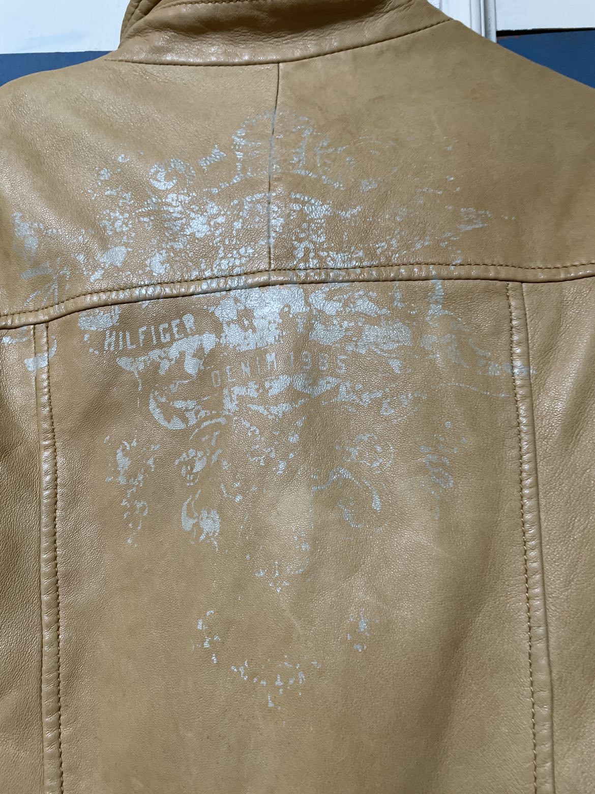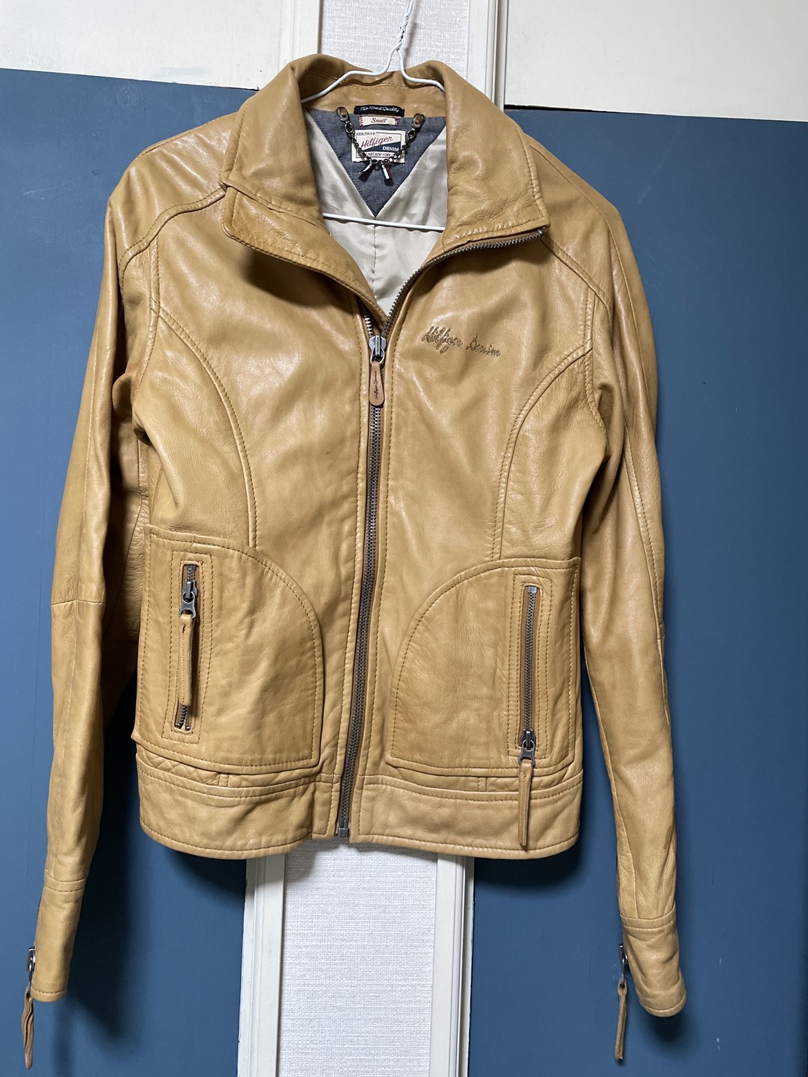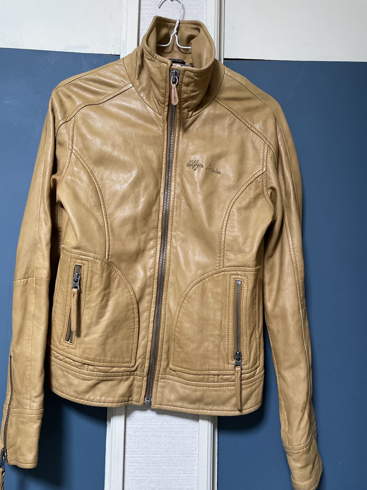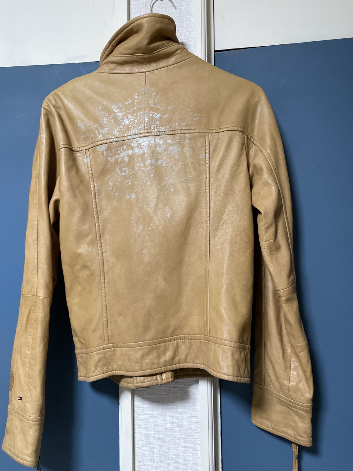 本革のジャンパーです。年代物で、メーカーは不明。古着ならではの柔らかい革ジャン。後ろに プリントされていた部分ははがれて、いますが、革には影響ありません。着たかったのですが、後ろのプリント部分、着るには若くありませんでした。古着好きな方、お若い方にお譲りしたく 出品します。メンズですが、女性の方でも、着こなせるデザインです。実物をごらんになって、試着してみていただいた上で、検討して下さい。お値段もお安くしています。色は、黄色に近い薄茶色?です。 状態が悪いとしたのは、年代物でプリントの剥がれがあるためです。