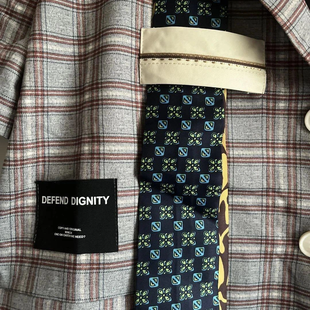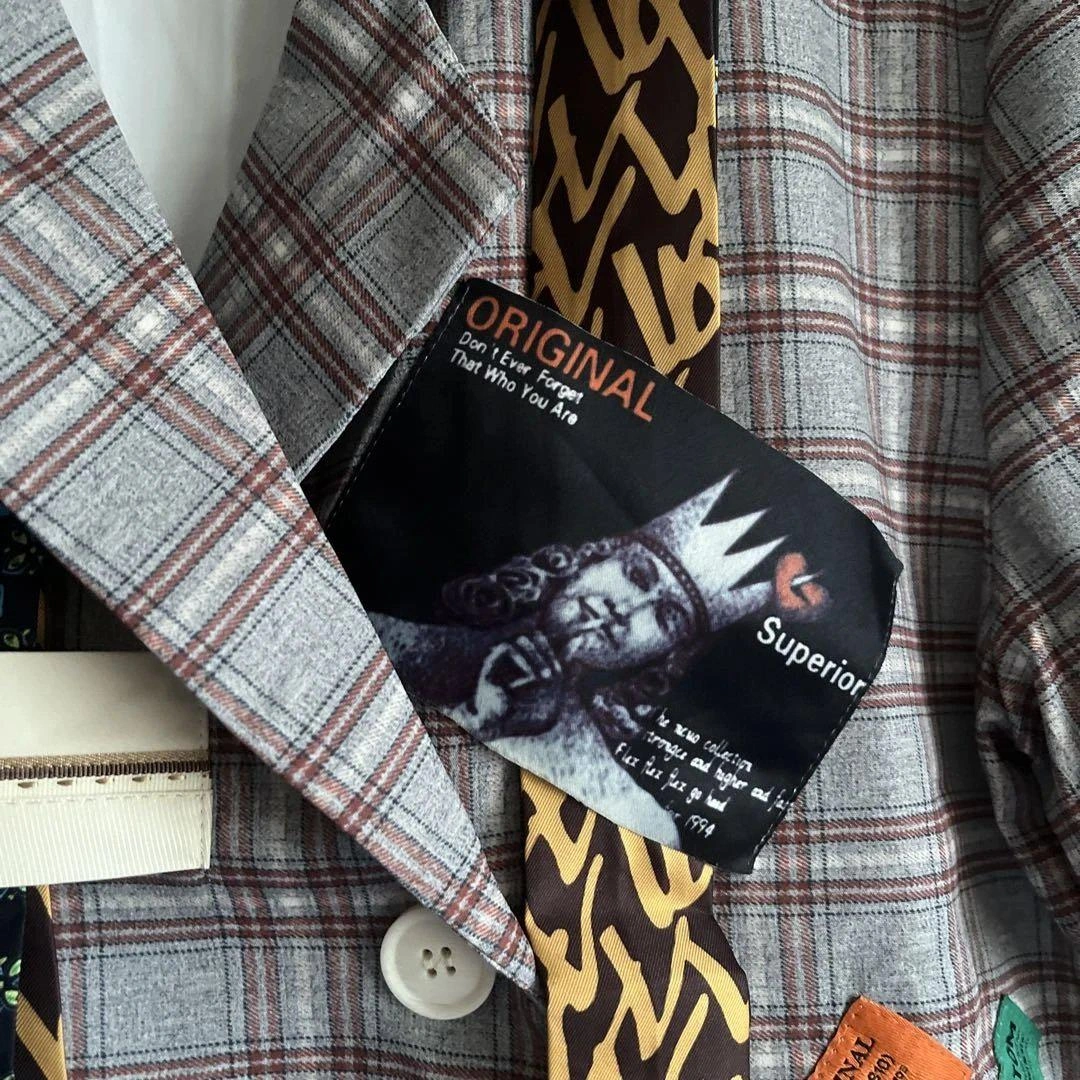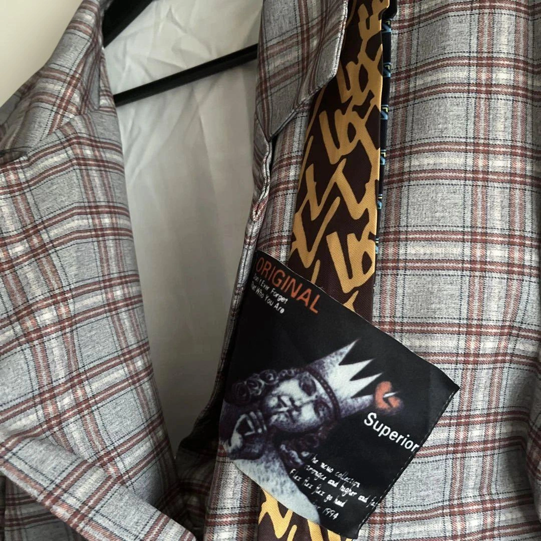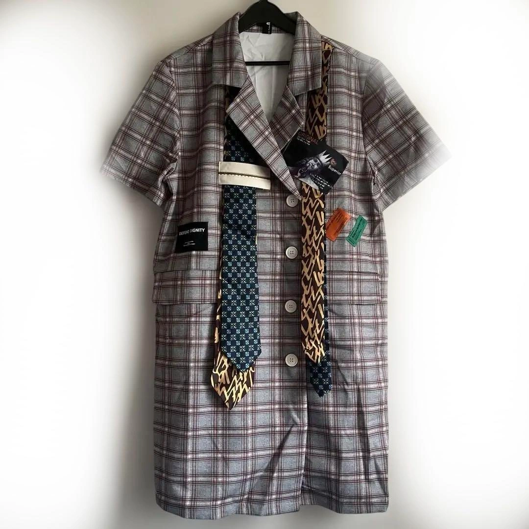 韓国のセレクトショップで購入し2〜3度着用しました。 ユニークなネクタイ付きテーラードジャケット、アートプリントデザイン。 裏地が無く夏にサラッと着れます(^ ^) またストレッチ生地なので、肩凝りなどの体に負担無く着れてしまいます。 前を開けTシャツの上に羽織るだけでファッションが完成するデザインです。MサイズですがゆったりデザインなのでLサイズ方でもピチッと感なく着ることが出来ます - 色: グレー系チェック - スタイル: テーラードジャケット - デザイン特徴: ネクタイ付き、アートプリントあり ご覧いただきありがとうございます。