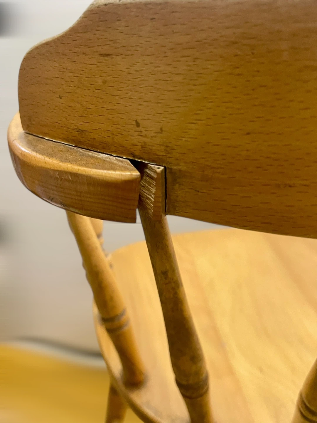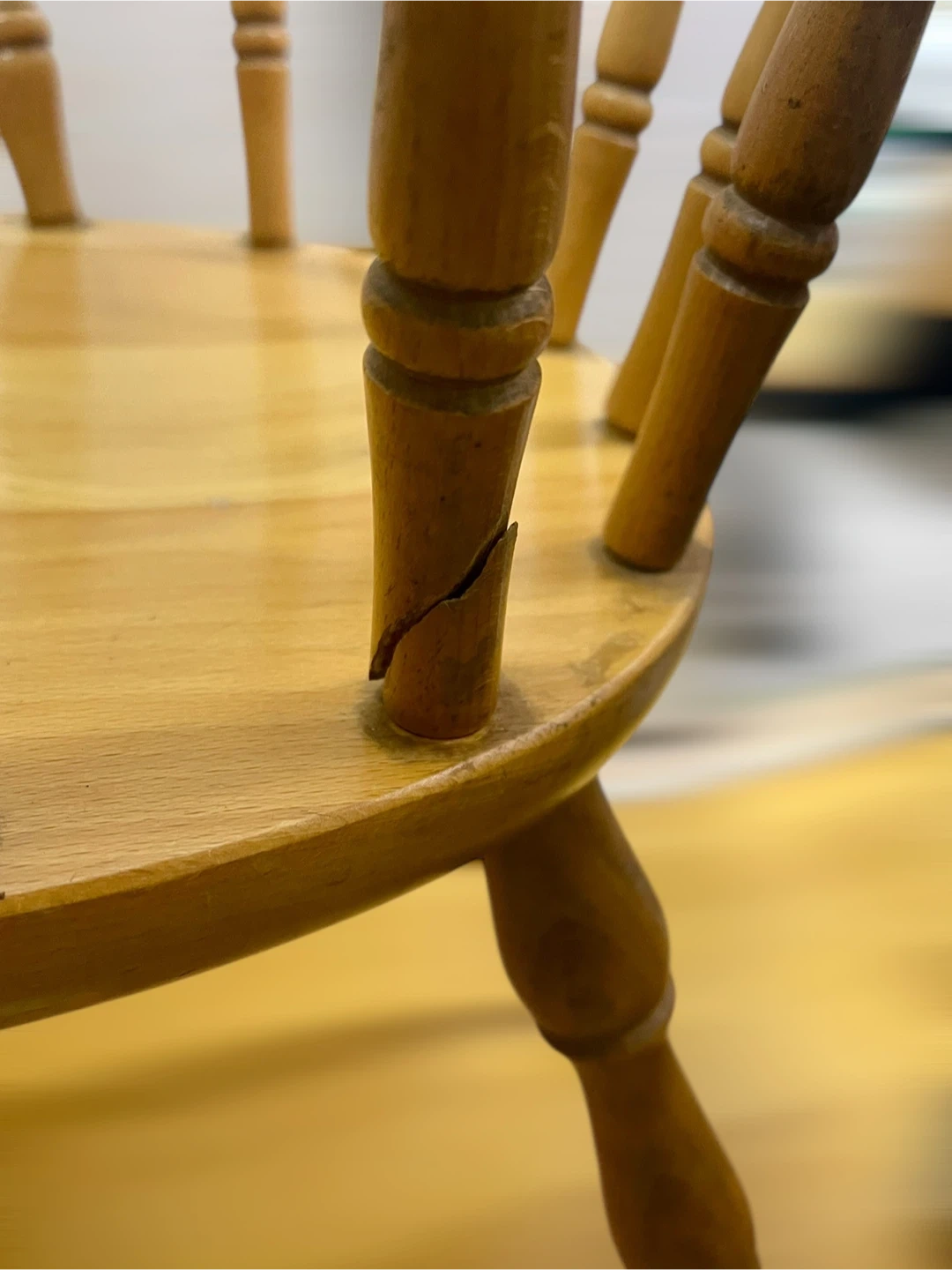 キツツキマーク 飛騨産業 ベビーチェア 子供椅子 ウィンザーチェア 背もたれの肘掛け部分の割れと小柱が 割れてしまいました。 背もたれと座面を一度分離して、接着修理すれば充分使用できます。 中古でも¥15000前後するものなので 器用な方如何でしょうか? 自分で修理しようと思ってましたが、 面倒になったので、どなたか修理して使って頂きたいです。