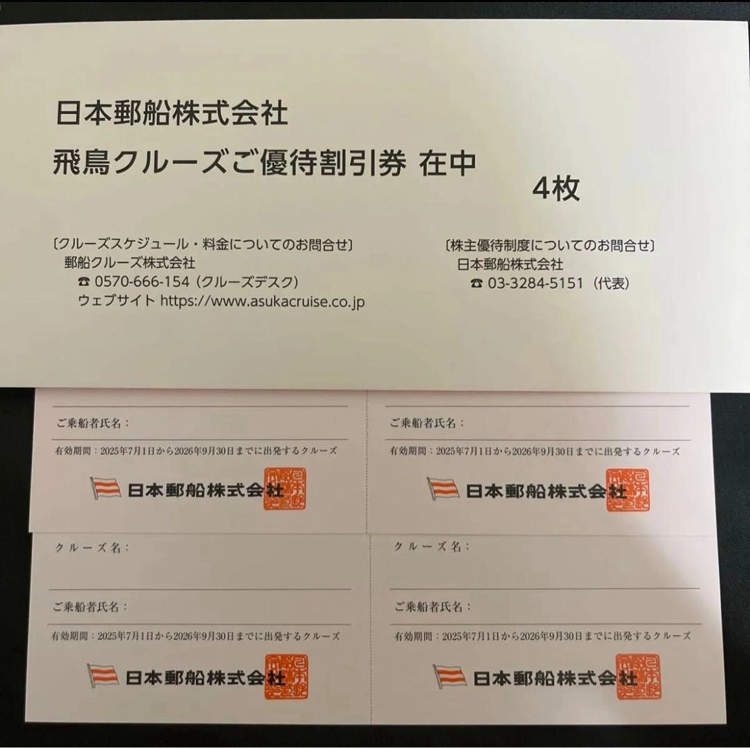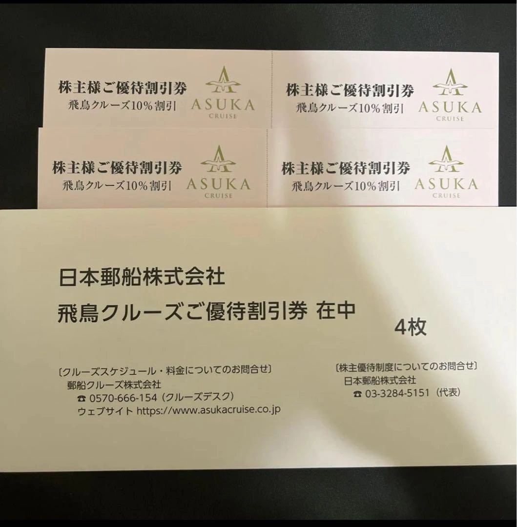 飛鳥クルーズの10%割引優待券、4枚セットです。 - 券種: 優待割引券 - 割引率: 10% - 枚数: 4枚 - 有効期限: 在中 ご覧いただきありがとうございます。 ご希望の方はお気軽にご連絡ください。