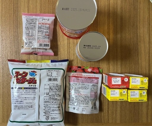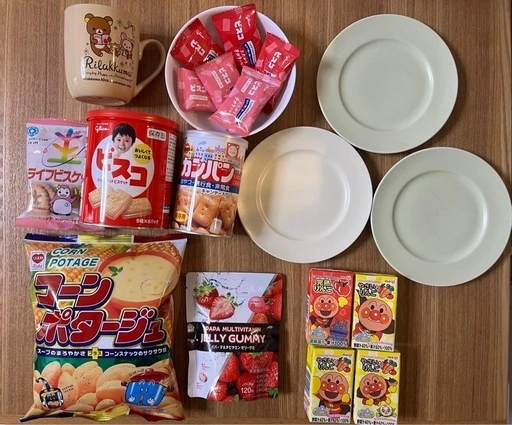 コーンポタージュスナック75g 2026.02 マルチビタミンゼリーグミ120粒 2027.5 ライフビスケット35g 2026.01.16 ビスコ保存缶30枚 2025.10 保存用カンパン 2025.10 アンパンマンやさいとりんご125ml×3 2026.01.14 アンパンマン完熟りんご125ml 2026.02.02 ビスコ2枚入り×6 リラックマのマグカップ 白いボウル 黄緑のプレート×2 クリーム色のプレート ご希望の方はお気軽にご連絡ください。