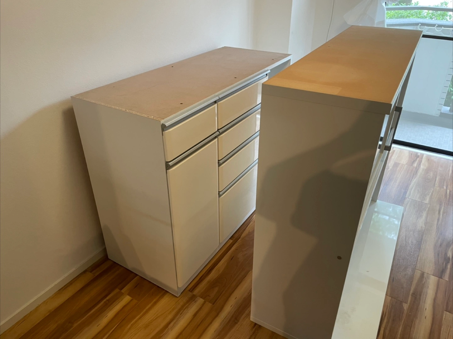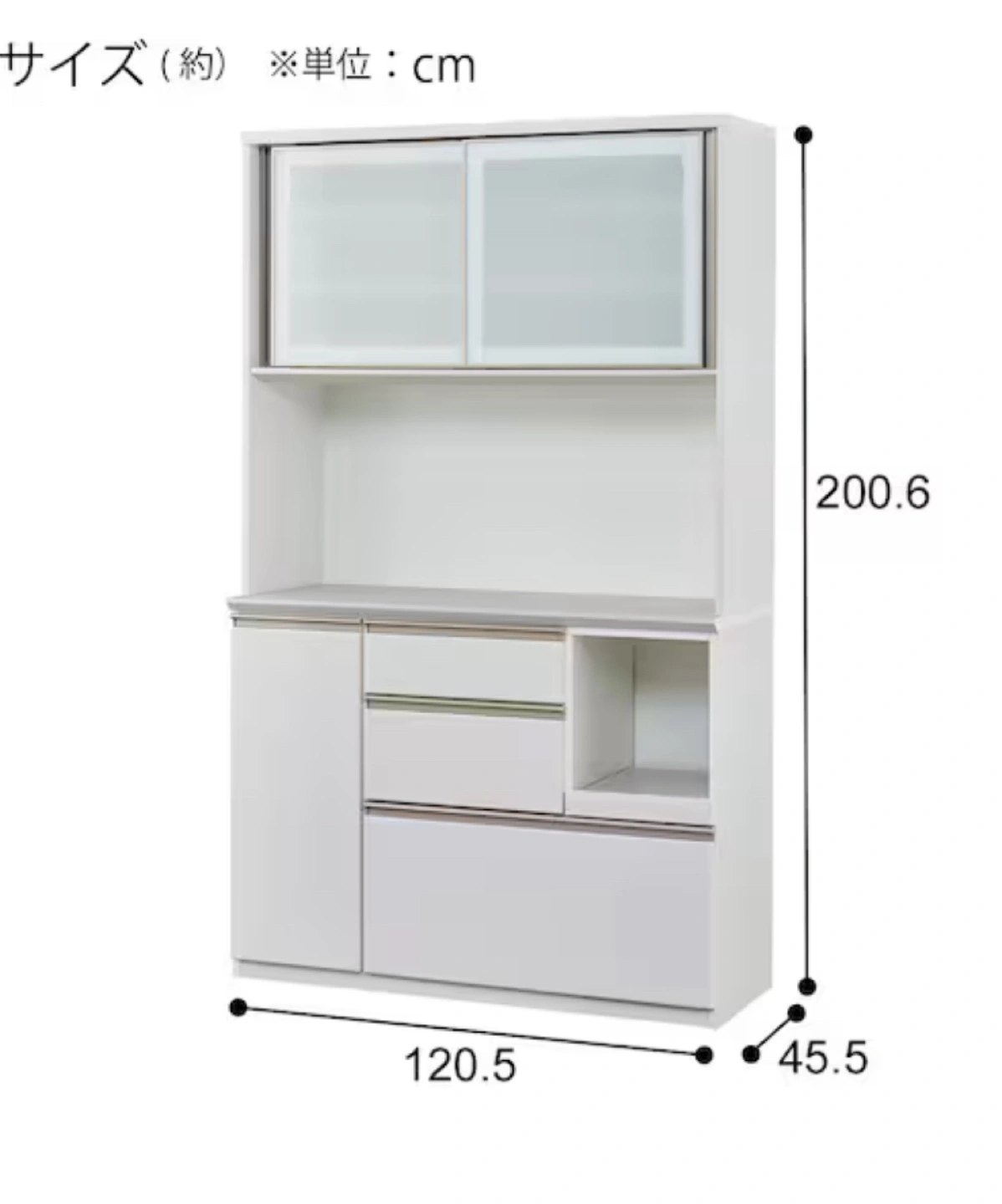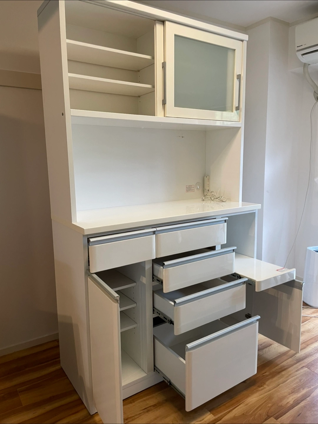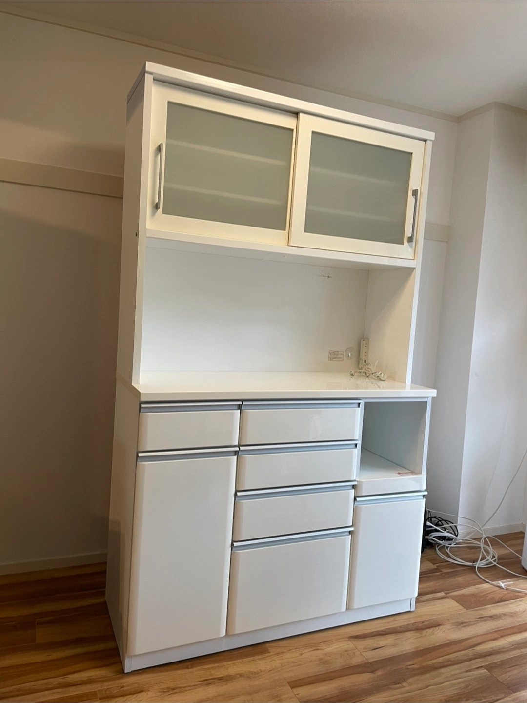 【サイズ】 高さ:約200cm 幅:約120cm 奥行:約50cm ニトリ アルミナ120KBーWH ・スライドドア ・引き出し付き ・棚付き ニトリで2018年ごろに購入しました。 現行モデルは下記リンク先のものです。 https://www.nitori-net.jp/ec/product/2190200003869/?utm_source=google&utm_medium=cpc&utm_campaign=listing&utm_content=01_pla-02&utm_term=google_cpc_listing_01_pla-02_21_hfu_cyberagent&gad_source=1&gad_campaignid=16157945272&gbraid=0AAAAADHmk9T1O3FgyGkCCuVTVm5l3rqlm 状態について、 ボード奥のコンセント付近に塗装の剥がれがありま。また炊飯器を置くところの「ご注意下さい」シールが剥がれかかっています。 それ以外については、比較的綺麗に使われていると思います。 運搬について、 上下半分(下から92セセンチのところで上下にわかれます)に分かれていているのでそれぞれを運ぶ必要があります。 上下一体化するには、ネジで留めるような仕組みになっていますが難しいものではないです。 上下分割した状態でもそれなりに重量があるので、 運搬には2名(男性2名推奨です)が必要だと思います。 引き渡し場所は受け渡し場所付近のマンションで、詳細の場所はチャットにてお知らせ致します。 部屋の玄関まで引き取りをおねがいします。 なお、マンション内の移動については、当方で男性1名が一緒に行う事が可能です。 ご不明点ありましたらお気軽におといあわせ下さい。 なお中古品ですので、その点にご理解ある方のお取引をお願い致します。