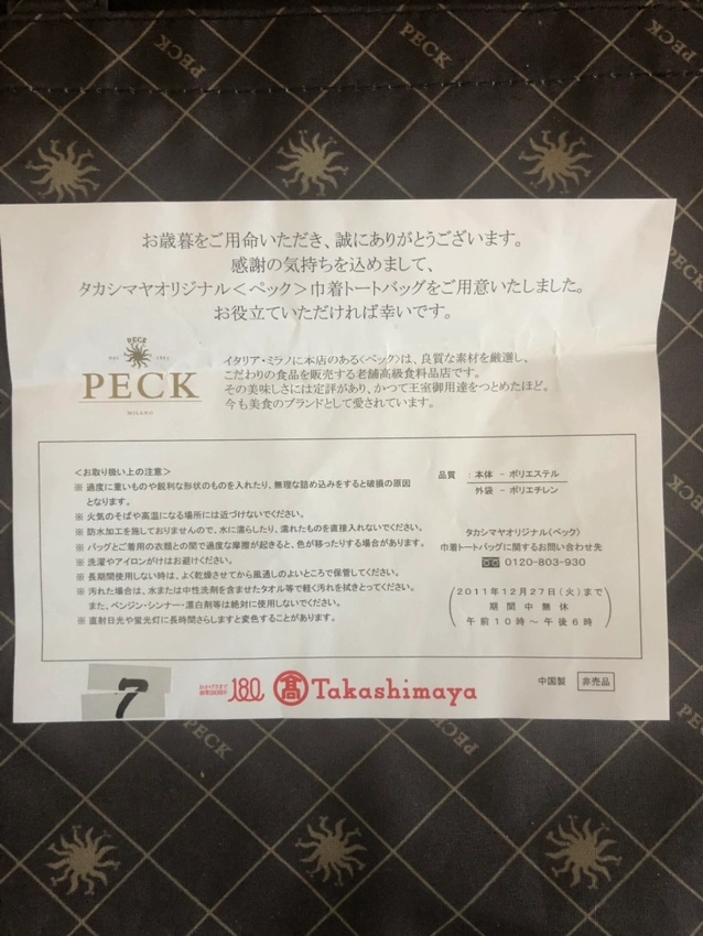 あたたかさ高島屋オリジナル巾着トートバッグ ペック イタリア 高島屋とイタリアペックのコラボ商品 非売品 未使用 写真撮るので初開封 内ポケット1個 高さ27センチ 取っ手含まず 幅36センチ マチ11センチ 宜しくお願います