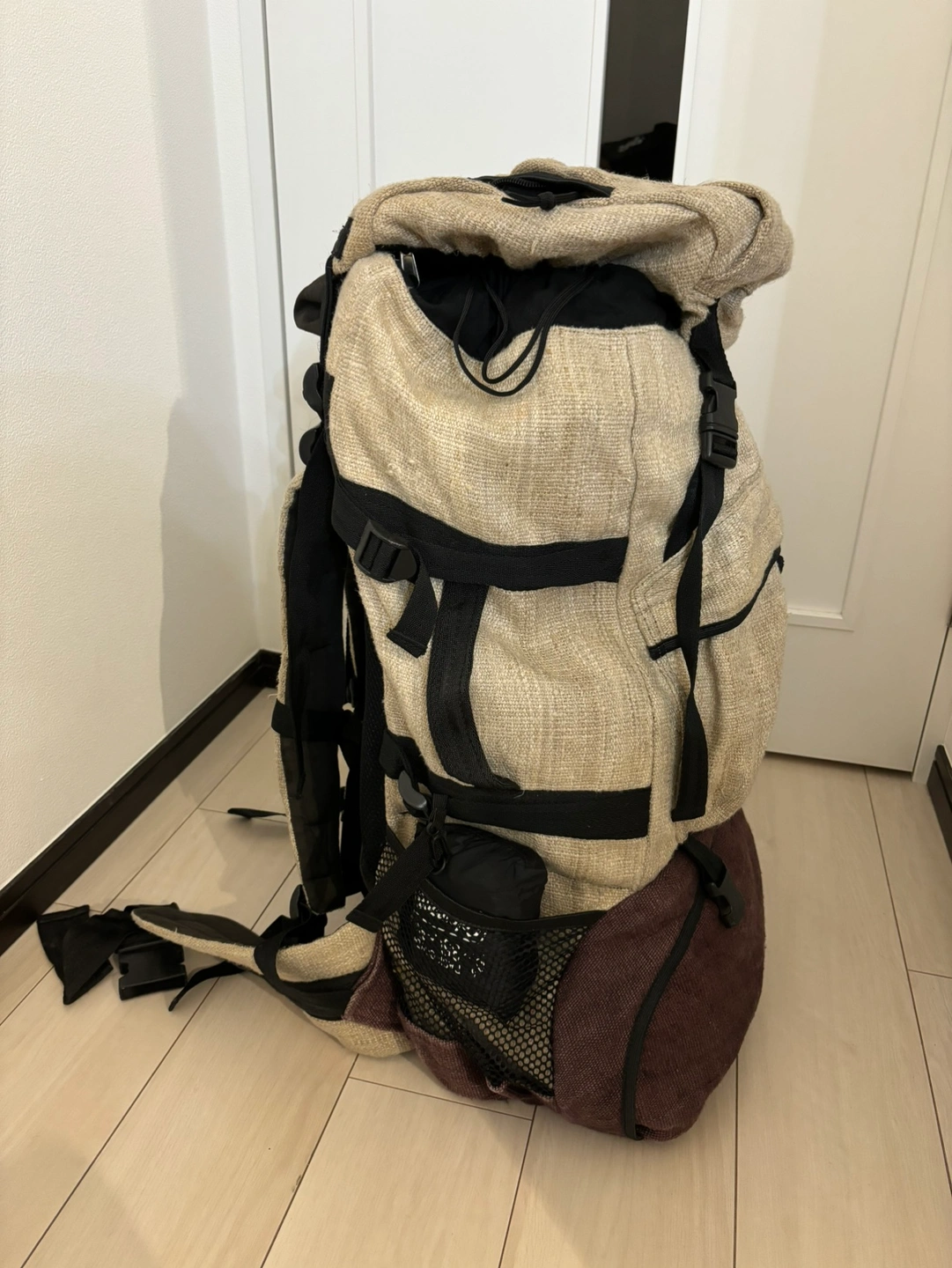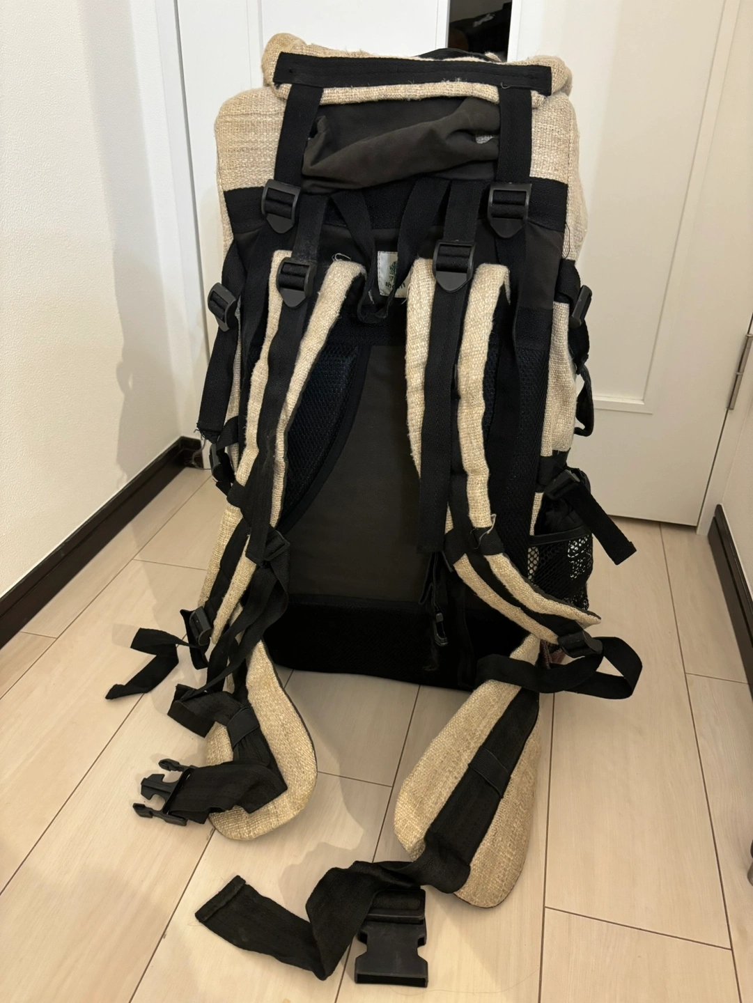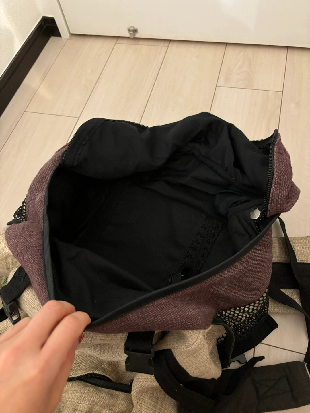 麻素材のリュックです。 作りは丁寧で、肩や腰のパッド、背中部分もしっかりしています。 アジア圏でバックパッカーしていた時に、かわいいけどしっかりしたバックパックが欲しくて、めちゃくちゃ一生懸命探して購入して何回か使っていましたが、着る服の系統や趣味が変わったので出品します。 本体部分はファスナー付きで中身が見えないようになっているのと、両ファスナーなので南京錠などの取り付けも出来るので盗難対策も安心です。 本体のふた部分にも、表も裏も個別でポケットが付いているので、大事なものは内側にしまっておけます。 下部の濃い茶色の部分は、仕切りがついているので靴など入れることも出来ますし、仕切り部分のファスナーを開けて繋げて使うことも出来ます。 なお、靴を入れて使用はしていませんので中は綺麗です。 Colemanのレインカバーもお付けします。 約30×23×60cm よろしくお願いします。