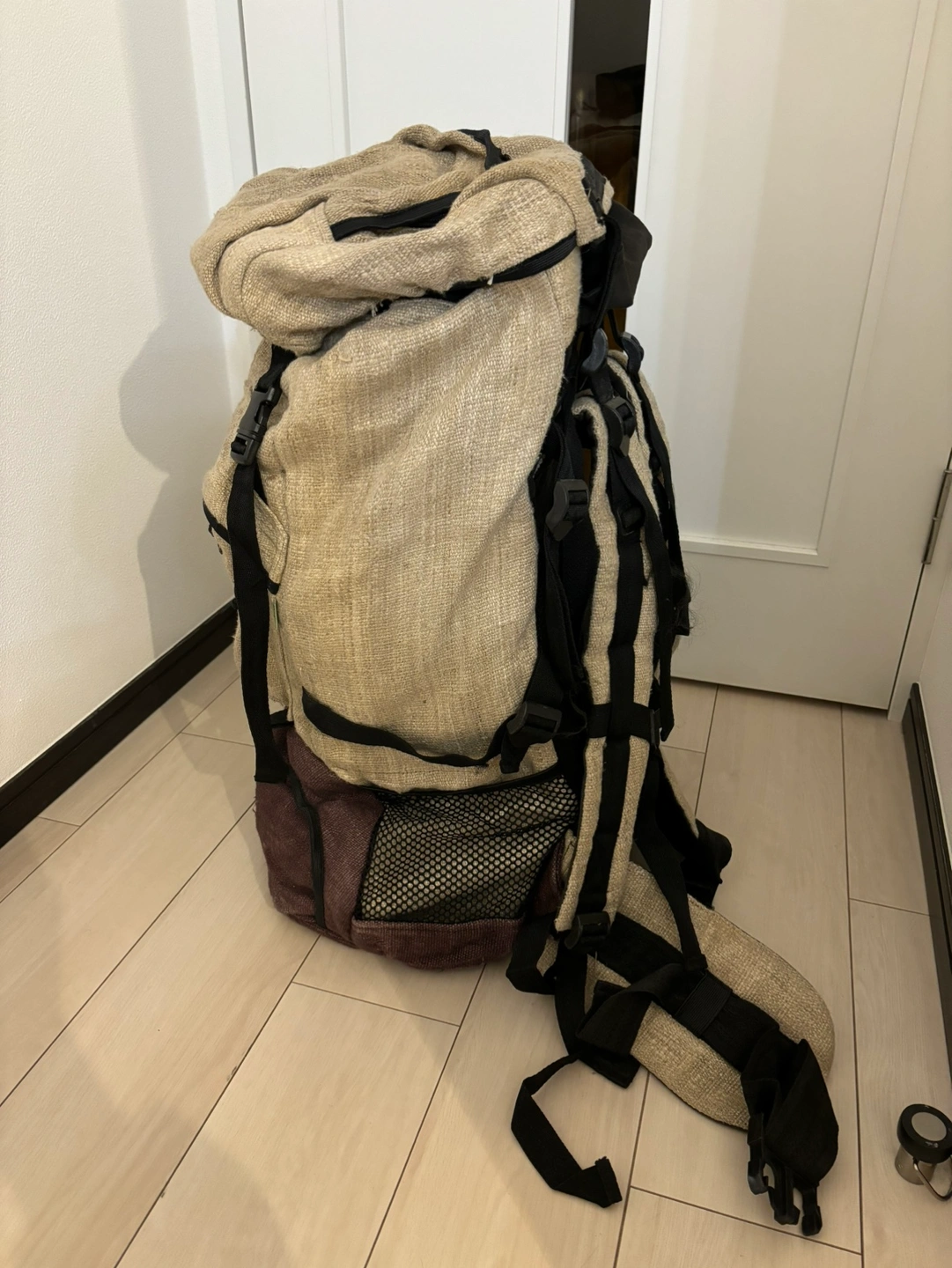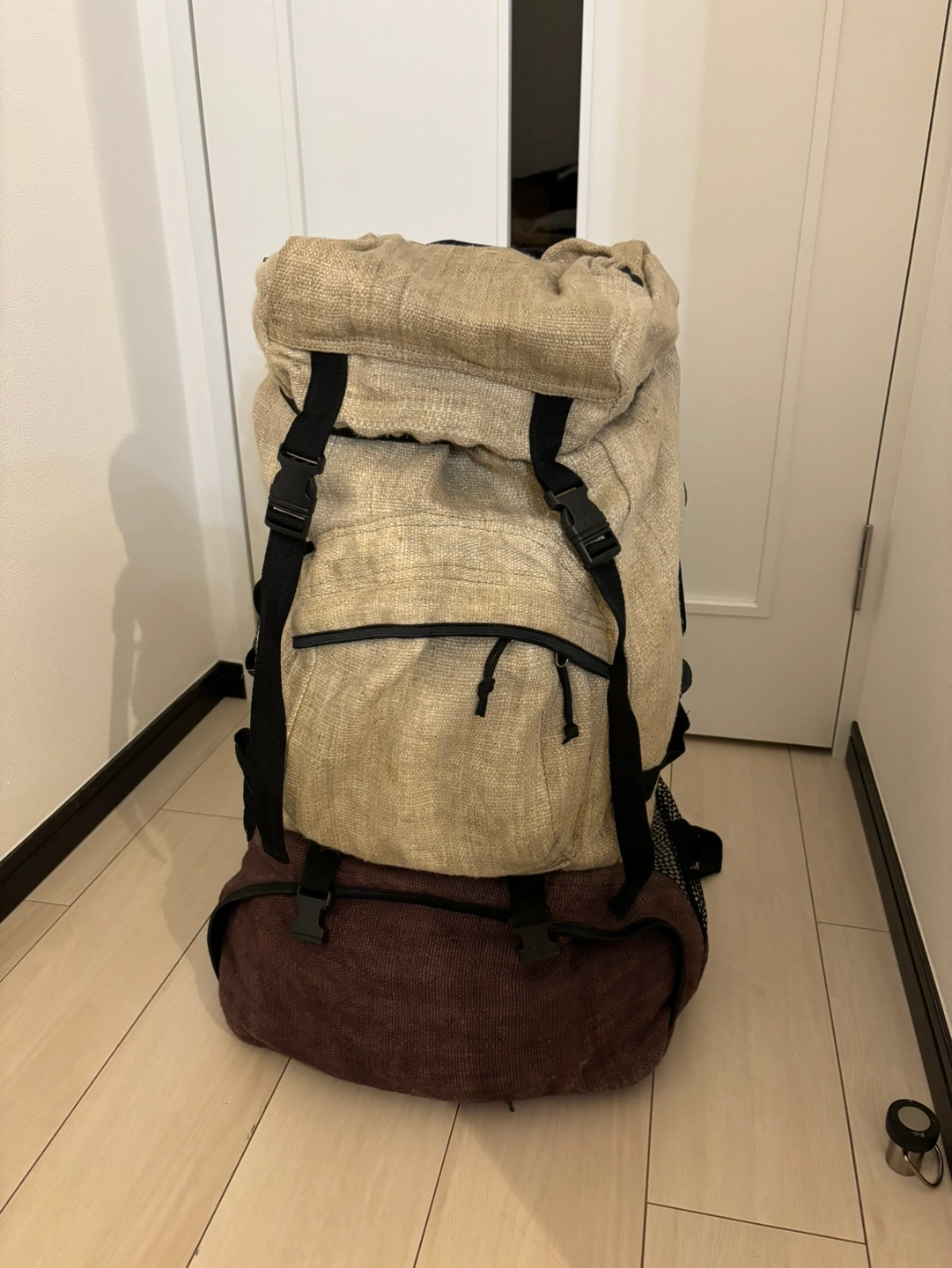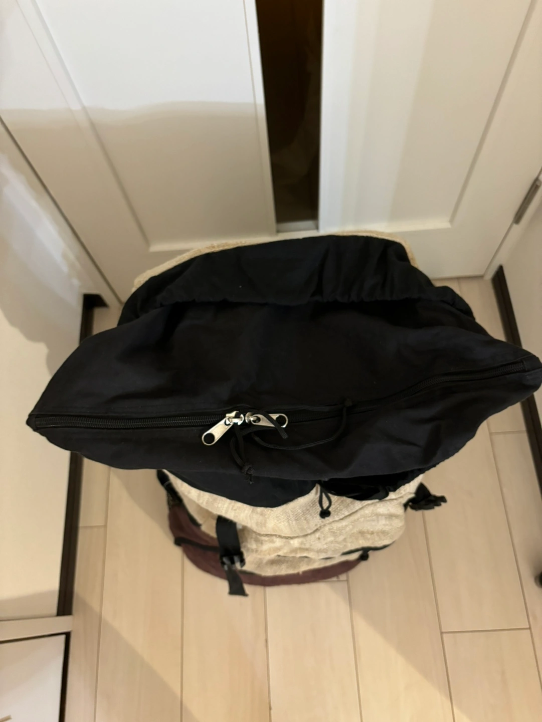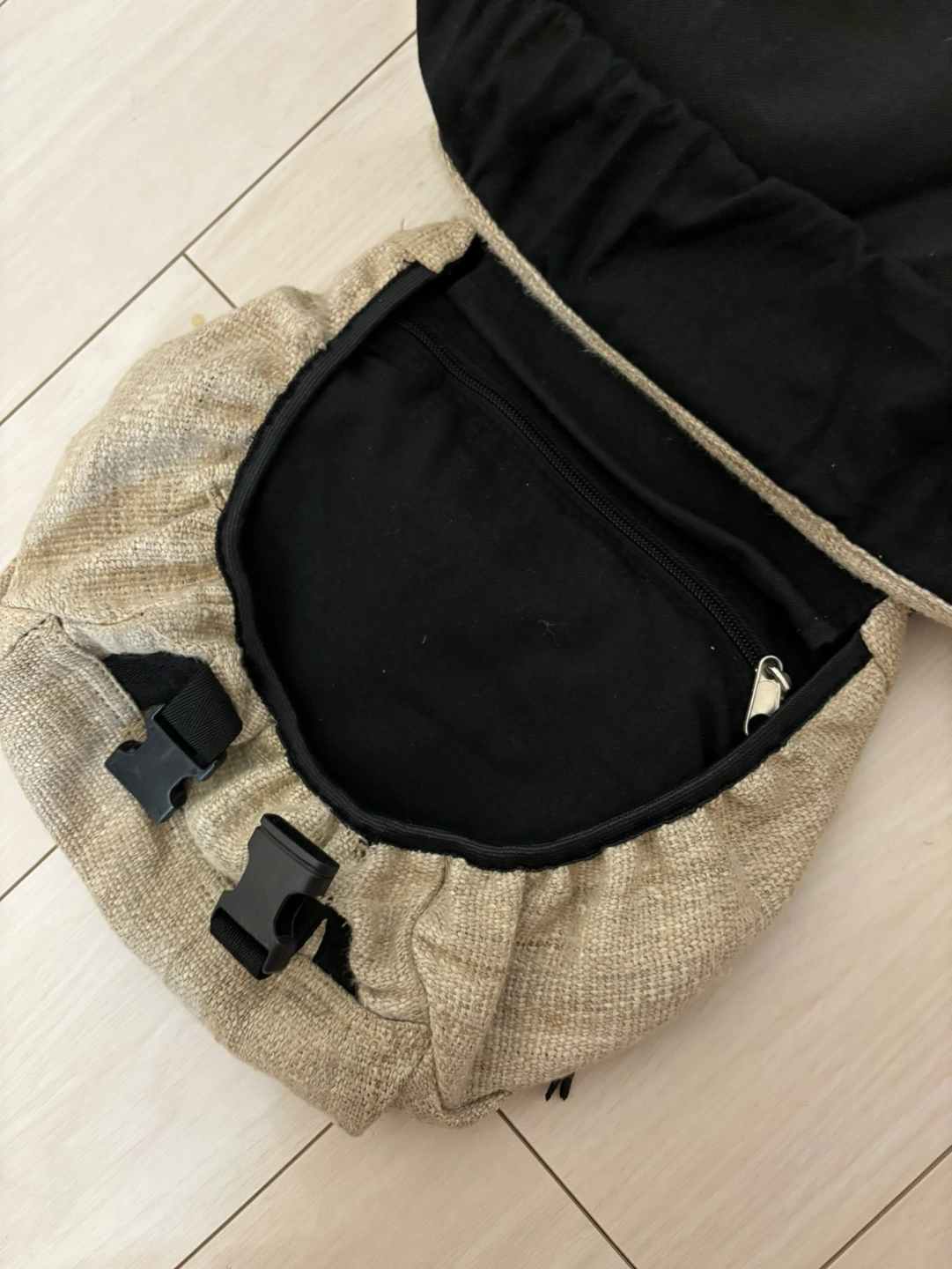 麻素材のリュックです。 作りは丁寧で、肩や腰のパッド、背中部分もしっかりしています。 アジア圏でバックパッカーしていた時に、かわいいけどしっかりしたバックパックが欲しくて、めちゃくちゃ一生懸命探して購入して何回か使っていましたが、着る服の系統や趣味が変わったので出品します。 本体部分はファスナー付きで中身が見えないようになっているのと、両ファスナーなので南京錠などの取り付けも出来るので盗難対策も安心です。 本体のふた部分にも、表も裏も個別でポケットが付いているので、大事なものは内側にしまっておけます。 下部の濃い茶色の部分は、仕切りがついているので靴など入れることも出来ますし、仕切り部分のファスナーを開けて繋げて使うことも出来ます。 なお、靴を入れて使用はしていませんので中は綺麗です。 Colemanのレインカバーもお付けします。 約30×23×60cm よろしくお願いします。