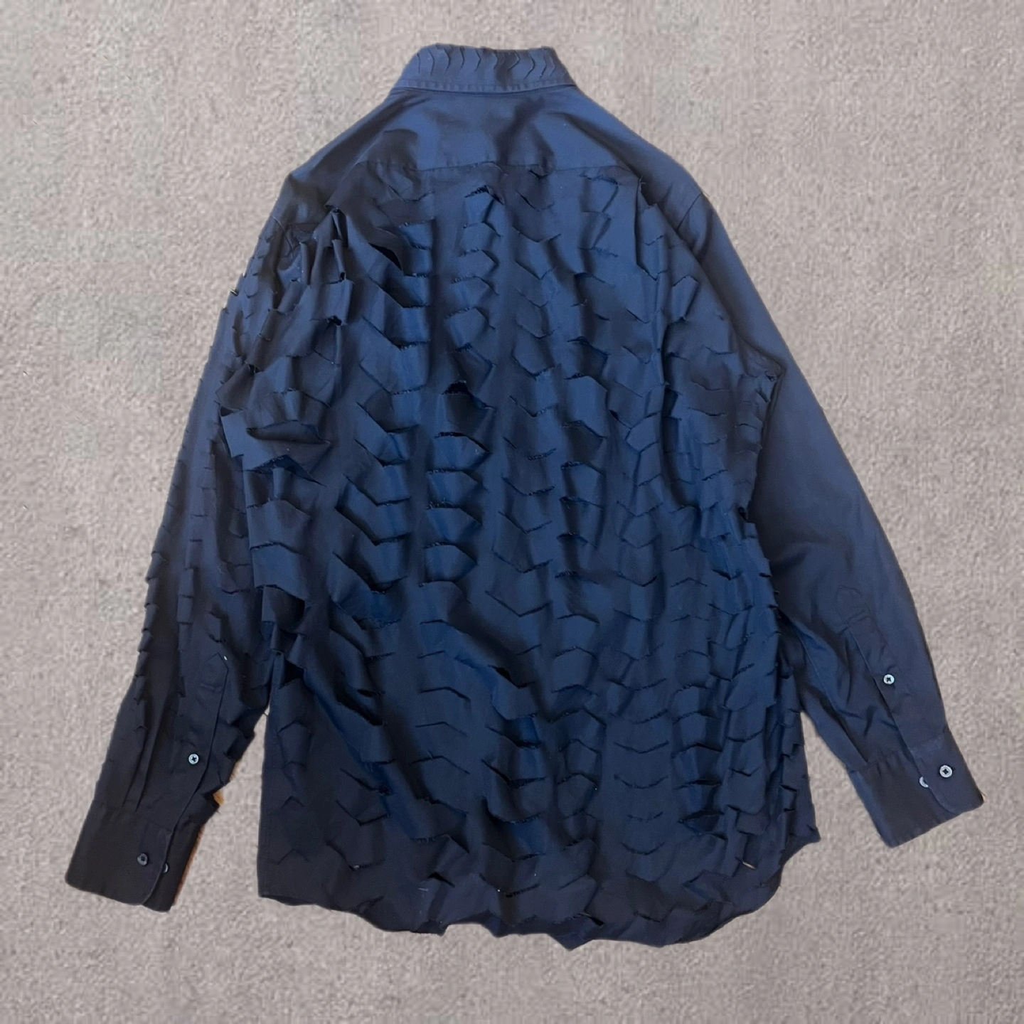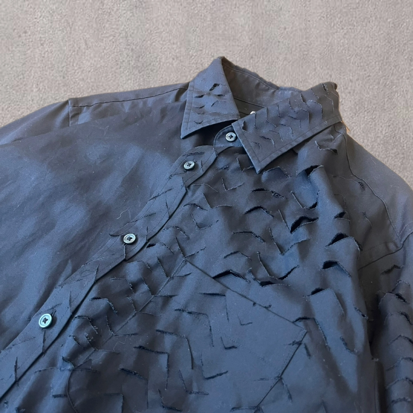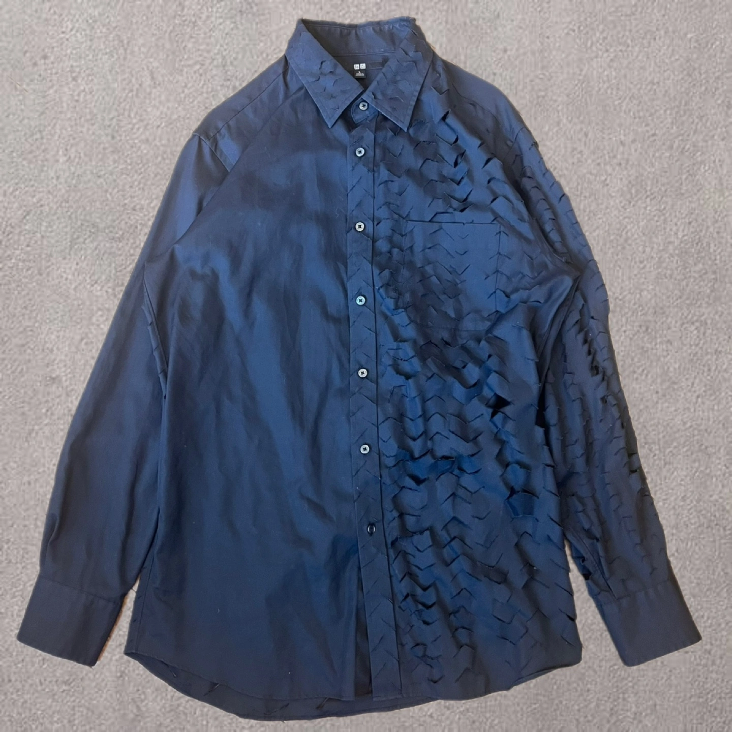 あたたかさ【ユニークなデザイン】 このシャツは、片側に装飾的なフリルが施されており、個性的なスタイルを演出します。ファッションにこだわる方にぴったりです。 【素材の特性】 光沢のある生地が使用されており、特別な場面でも映える一着です。柔らかさと着心地の良さが特徴です。 【多様なコーディネート】 このシャツは、カジュアルからフォーマルまで幅広いスタイルに合わせやすく、様々なシーンで活躍します。 - 色: 黒 - デザイン: 片側に装飾的なフリルがあるシャツ - 素材: 不明だが、光沢のある生地 - スタイル: 長袖シャツ ご覧いただきありがとうございます。