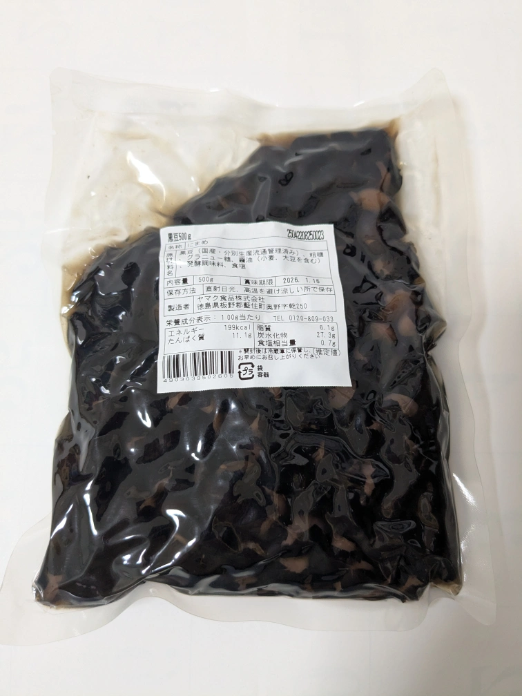 あたたかさ・ご飯のおかずにいかがでしょうか? ・原材料名 黒豆 (国産)、他 (商品の品質表示を参照) ・賞味期限 2026.1.16 ・製造者 ヤマク食品 ・紙袋またはビニール袋でのお渡し