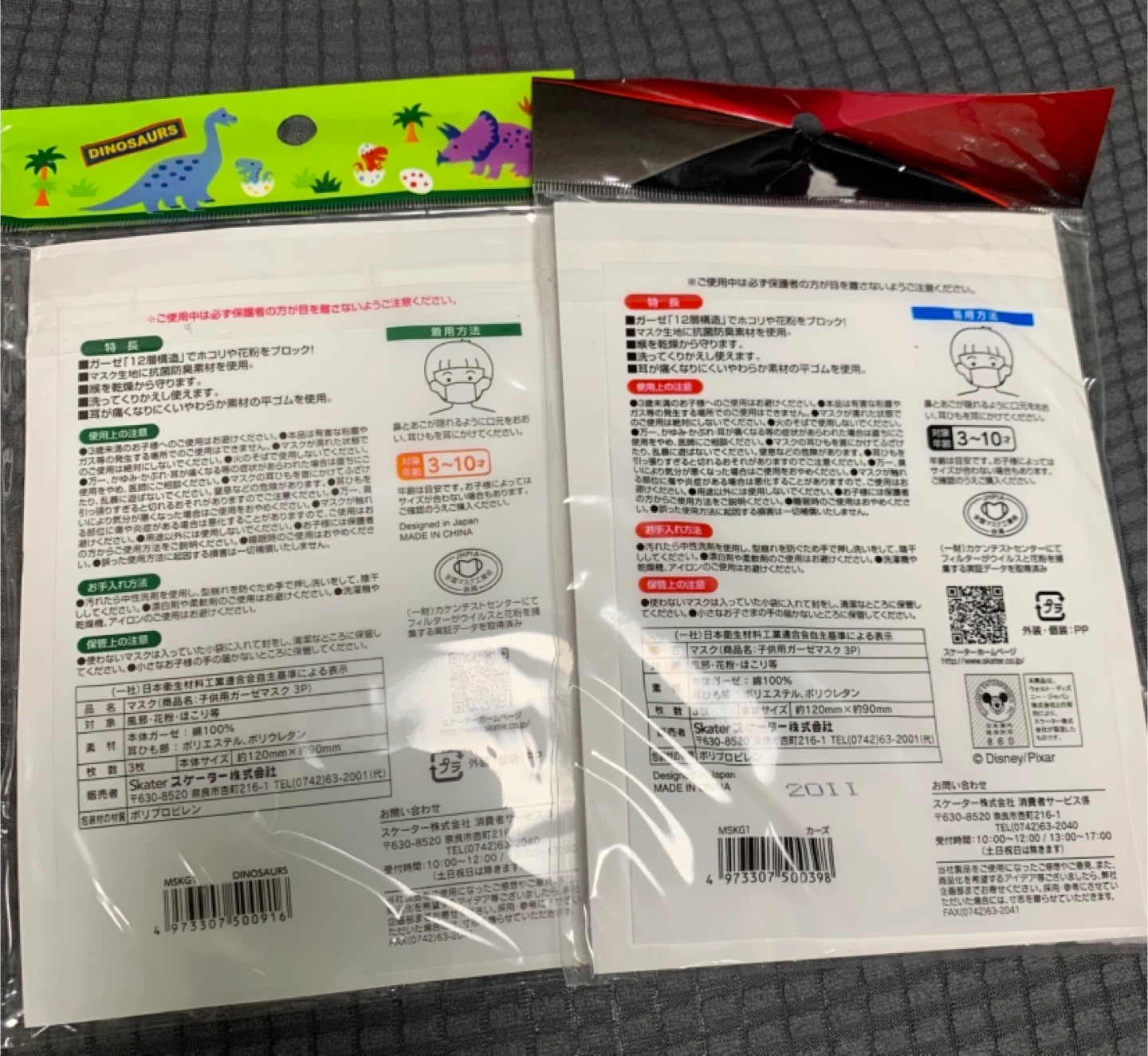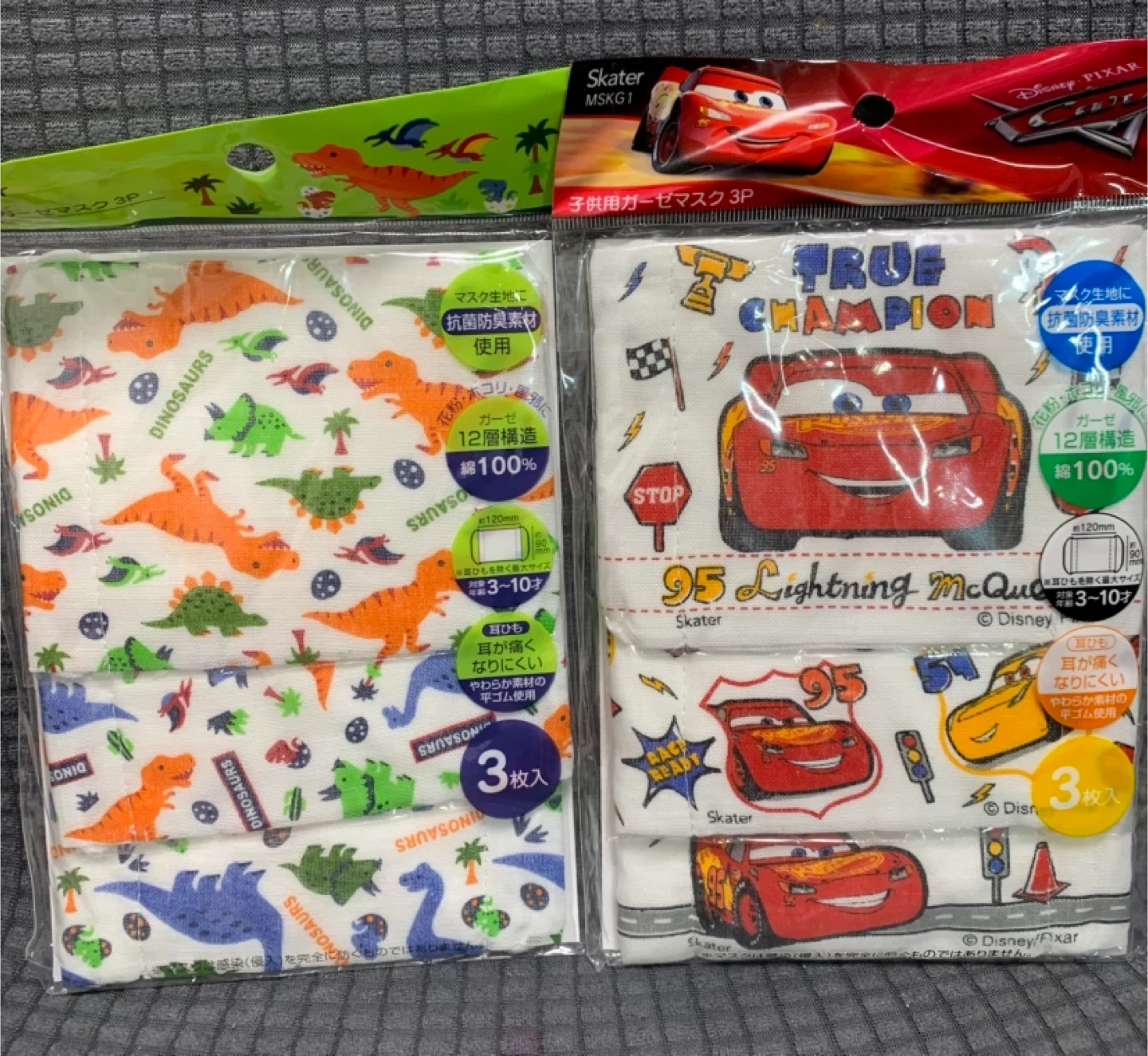 新品未使用 子供用ガーゼマスク3Pセット なるべく多くの方にお譲りしたいので1セットのみのお譲りです。どちらかお好きなキャラクターをお選びいただけます。 【情報】 ブランド:スケーター キャラクター:どちらかご希望のものお選びください。 恐竜 または カーズ 対象年齢:3〜10才 内容量:各3枚入り 新品未使用ですが自宅保管品であることご了承ください。