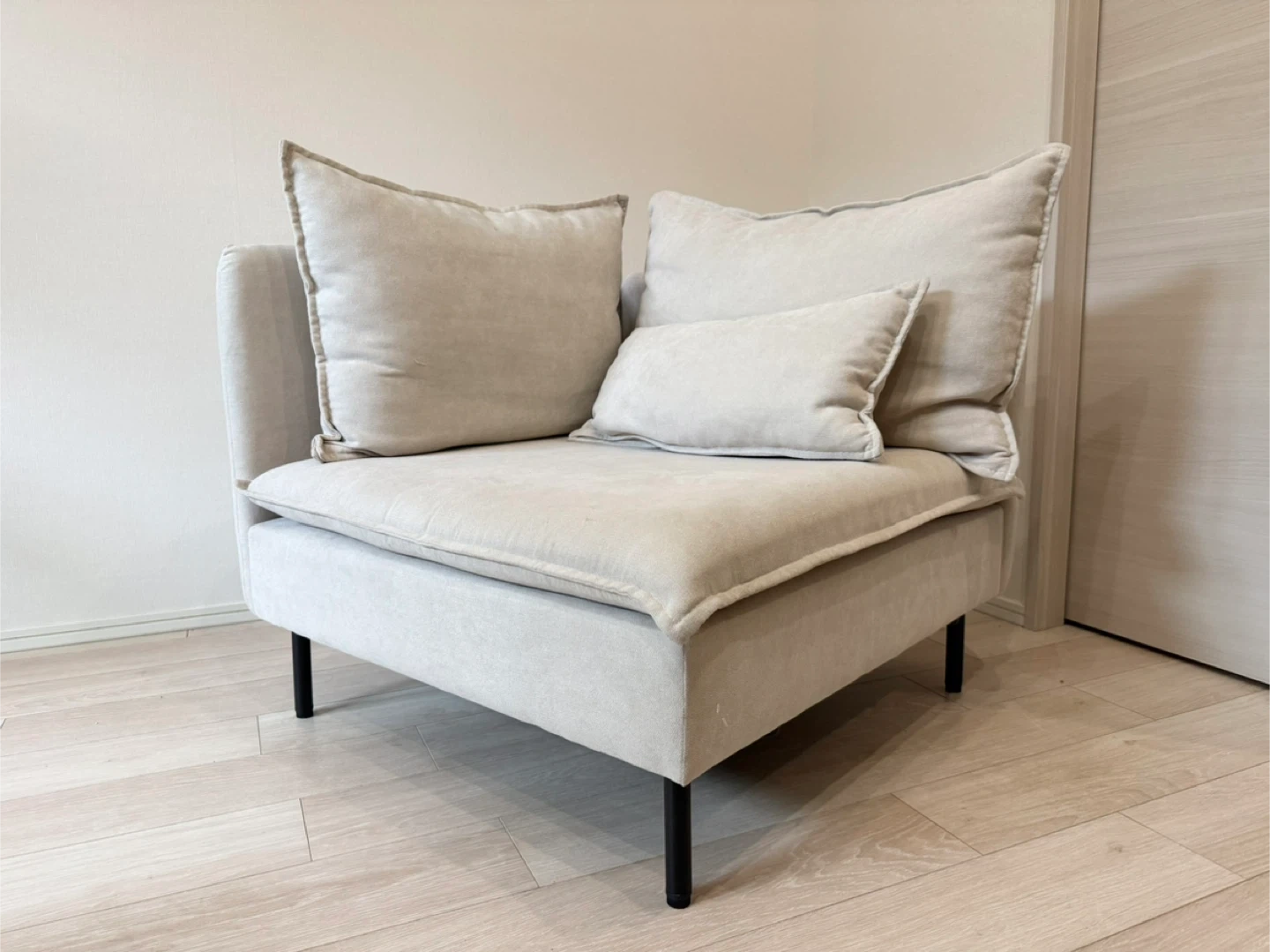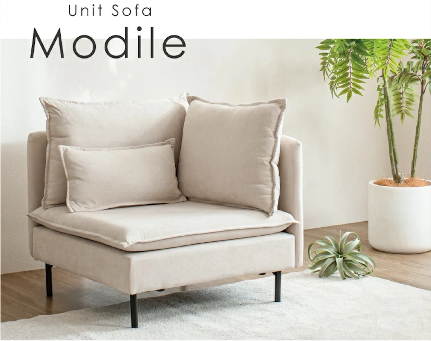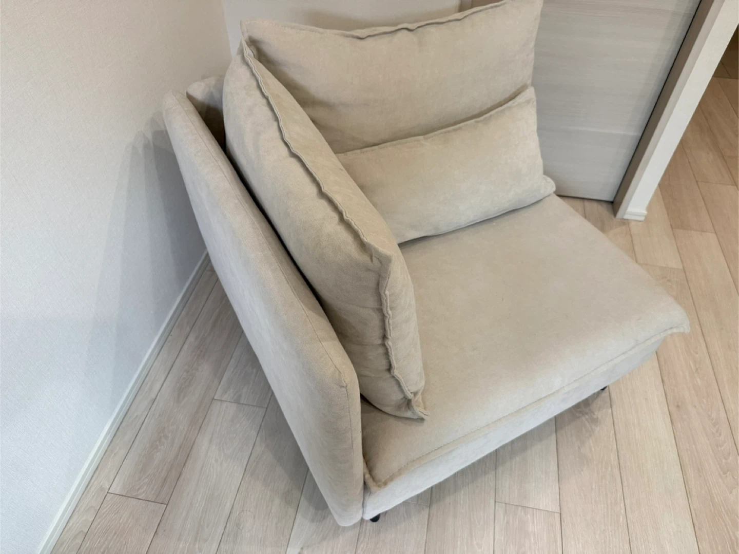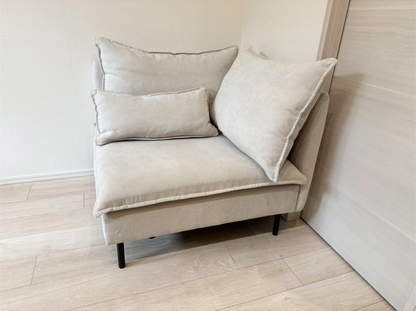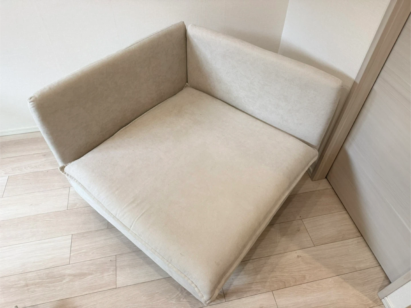 Modileの1人掛けコーナーソファ、色はライトベージュです。2024年の12月に24,000円で購入しました。ほとんど使用感はありません。汚れや傷もないです。 脚を取り外しても使用できます。 【情報】 ブランド:モディーレ 種類:コーナーソファ カラー:ライトベージュ サイズ:約86cm x 86cm x 83cm 【状態】 使用感少なめ 取りに来ていただけると助かります。分解できますが、脚とクッションを取れば、このままでも普通車に乗せられると思います。