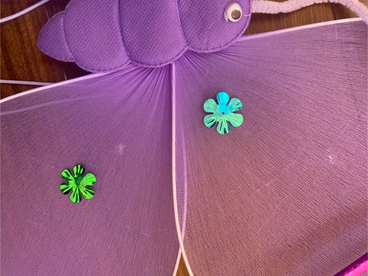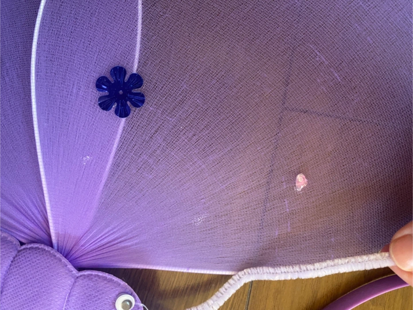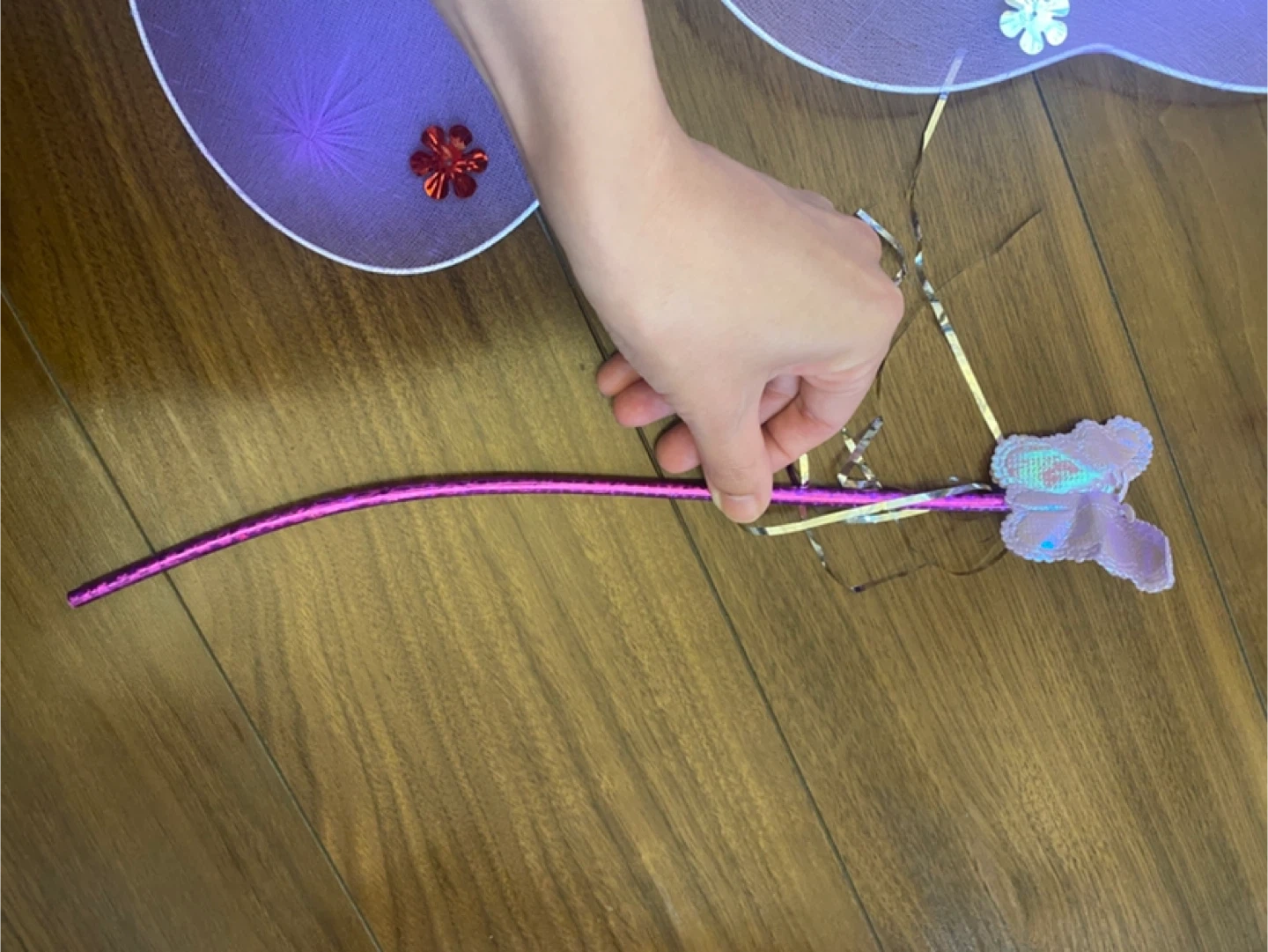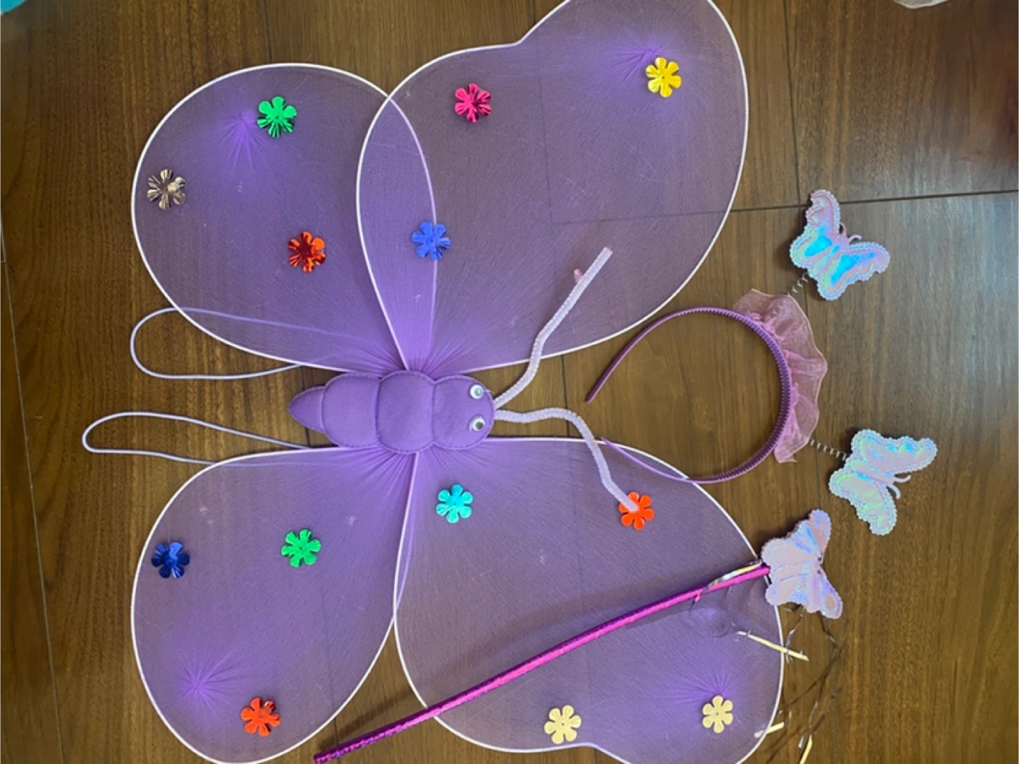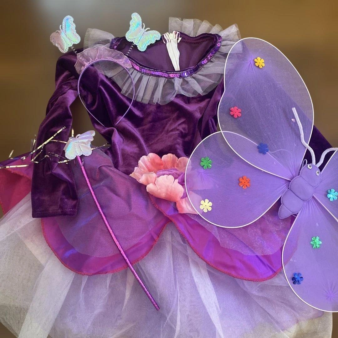 妖精のコスチュームドレスと装飾品のセットです。 メルカリで購入し、ハロウィンの撮影会で一度(室内で3時間程度)着用しました。 ▷ドレス真ん中のお花にほつれ(3枚目参照) ▷蝶の装飾が取れた跡があります(6-7枚目参照) ▷蝶の目は元々このようになっていました(9枚目参照) ▷ステッキが少々曲がっております(8枚目参照) ドレスはベロア素材です。 130と記載されていますが少し小さめかもしれません。スカートにボリュームがあり、とても可愛いです♪ 蝶にはゴムがついており、背負う形になります。 目立った汚れ、破れ、シミ等は見当たりません。 素人検品のためご了承ください。 ご希望の方はお気軽にご連絡ください。