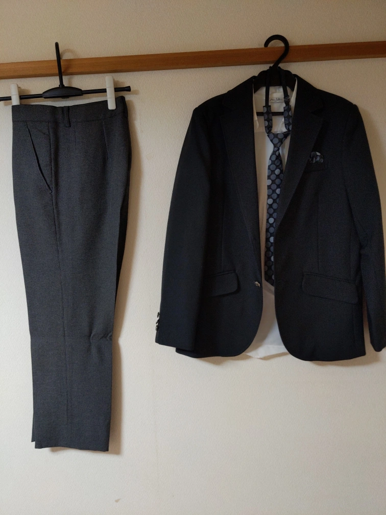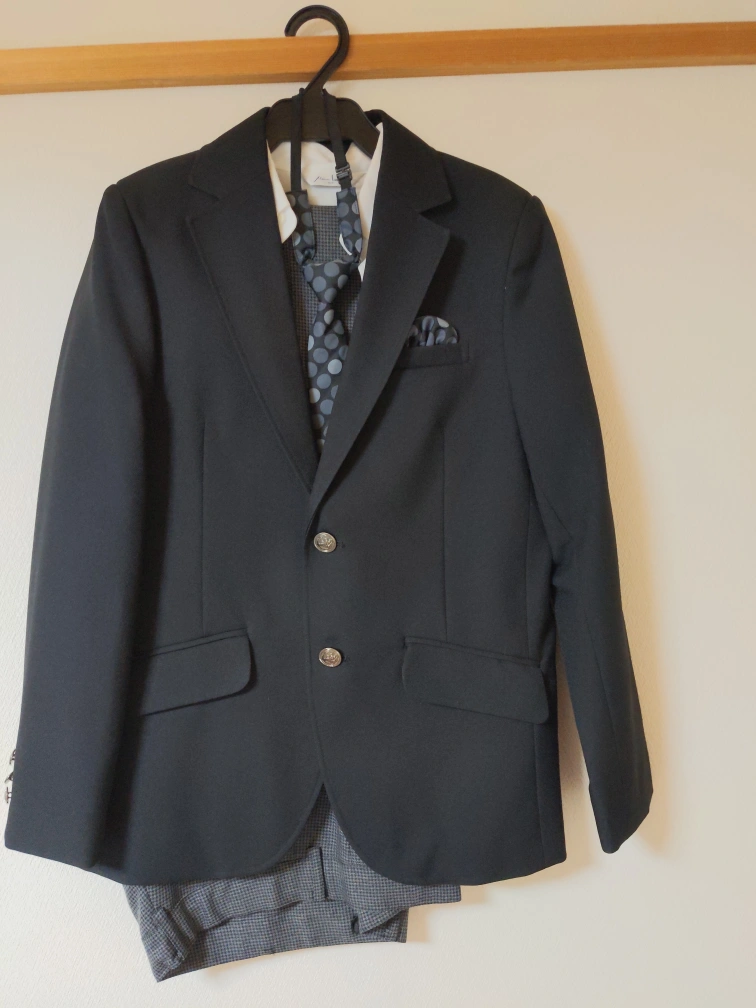 9年くらい前にライフで購入しました。 ジャケット(ネクタイと同柄のポケットチーフ) 白シャツ(襟先にボタンが付いてるデザイン) ズボン ネクタイ(結ばずにすむゴムで着脱するタイプ) 4点セットです 5年生の時に法事で購入、その時は袖が長かったのでボタン1個分袖上げしましたが今はもどしてあります。 全部で3回着ました。最後に着たのは7年前の小学校卒業式です。その後クローゼットで保管してありました。クリーニングはだしていませんが、シャツは自宅で洗濯しました。ズボンとシャツはお渡し前にアイロンかけはする予定でいます。 目立った汚れなどはみつかりませんが、中古品であることをご理解ください。 取り引き場所は田園都市線、小田急線、世田谷線が可能です。