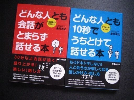 会話を盛り上げるためのテクニックを学べる2冊セットです。 著者:金井英之 - タイトル: どんな人とも会話がとまらず話せる本 - タイトル: どんな人とも10秒でうちとけて話せる本
