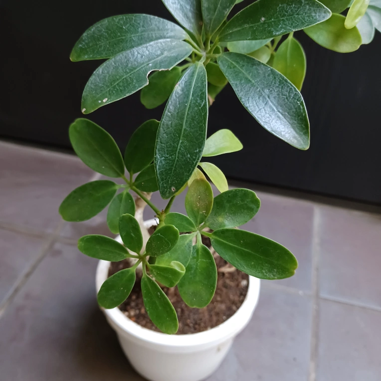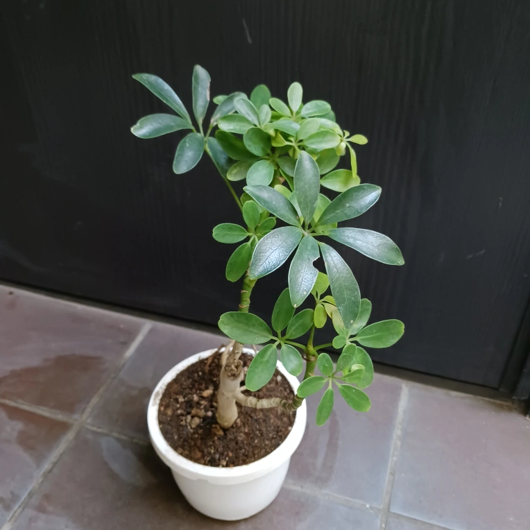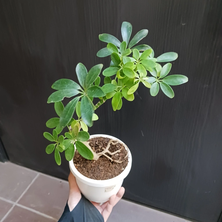 あたたかさ手のひらを広げたような小さな葉が可愛らしい、シェフレラの小型品種のコンパクタです。曲がりのある樹形を愛でる楽しさがあります 《鉢サイズ》 4号鉢(直径12cm × 高さ10.5cm) 《植物サイズ目安(鉢込み)》 横幅:約22cm × 高さ:約36cm 《撮影日》 2025年10月2日 《置き場所》 ・室内または屋外の明るい場所 ・電気をつけなくても本が読める程度の明るさ ・まだ子株なので、初めての冬越しは室内がおすすめ 《水やり》 ・土の中まで乾いてからたっぷりと与えてください ・冬場に置く場所の温度が15℃以下になる場合は、水やり回数を減らし、乾燥気味に管理します