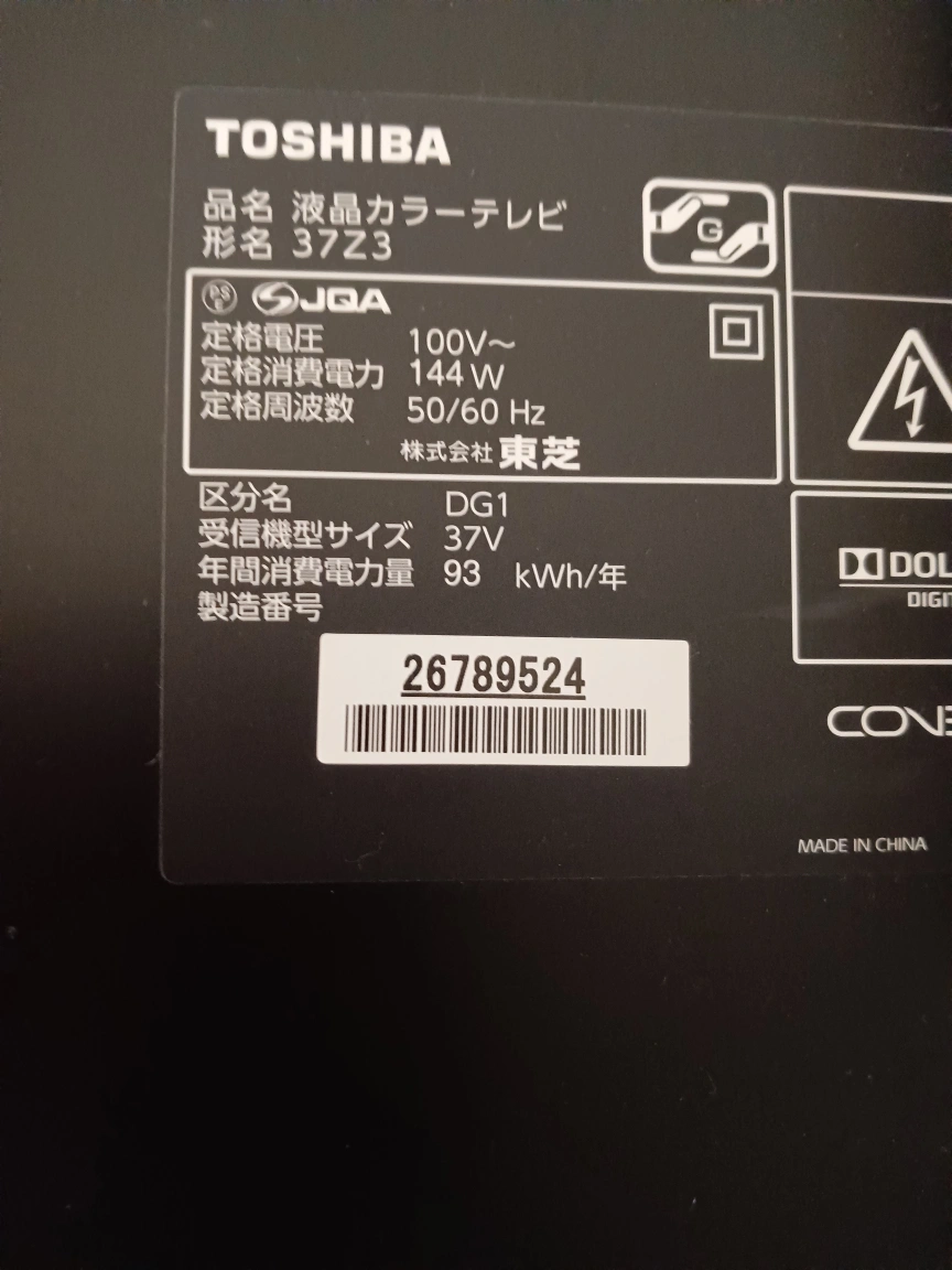 ★★★37インチ液晶テレビ 東芝REGZA 型式 37Z3 ★壁寄せスタンドセット。 ★ 37インチ液晶テレビ。TOSHIBA東芝 REGZA 型式 37Z3。 ※テレビ本体と専用リモコン、壁寄せスタンド一式のセット販売です。 ◆37インチの大画面。 ◆地上・BS・110度CSデジタルチューナー内蔵。 ◆デジタルフルハイビジョン放送。 ◆レグザリンク搭載(アクトビラ・ベーシック対応) ◆USB・LAN接続。 ◆HDD接続録画。 ■ 壁寄せスタンド一式 のセット付きです。 ※テレビに金具を取り付けテレビを引っ掛けるタイプで簡単取り付け、取り外しも簡単に出来ます。 ◆リビングに調和する木目(ウッド)柄の丈夫な壁寄せテレビスタンドです。高さ調節もできます。 ■本体画面と本体スピーカーの映像と音質は良好です。 ■使用期間は約2年位でその後は自宅保管中です。 ☆壁置きスタンドは約2万円で購入した丈夫なスタンドです。☆壁置きスタンドは約2万円で購入した丈夫なスタンドです。現在、同等の壁置きスタンドは約30000円位で大手家電店で販売されています。 ◆付属品◆ ☆電源コード付属。 ☆専用リモコン付属。 ☆B-CASカード付属。 ★購入時のご注意★ ※テレビと壁置きスタンドの取扱説明書とアンテナコード&ビデオへの接続コード類は付属しません。 ※テレビ本体と付属品は専用リモコン、B-CASカード、電源コード、壁置きテレビスタンド一式となります。 ※通常のテレビスタンドも、お渡ししますが、取り付けネジ4個を紛失しております。 ※お車での引き取りは川崎市役所近辺の路上か近隣の駐車場での取り引きとさせていただきます。 ※テレビも大きく重く、壁寄せテレビスタンドも丈夫で重量があり、徒歩での引取りは不可能ですのでご了承ください。 ※テレビとテレビスタンドを分解し組立工具を付け)クッションを敷いた台車に乗せ、お車まで運びます。