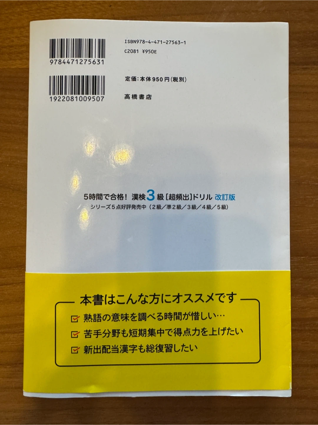 漢字検定3級に特化したドリルです。短時間で合格を目指すための内容が充実しています。 カバーにわずかに使用感がありますが、中はとてもきれいです。 ご希望の方はお気軽にご連絡ください。 日時によってはファミリーマート以外でもお渡し可能です。