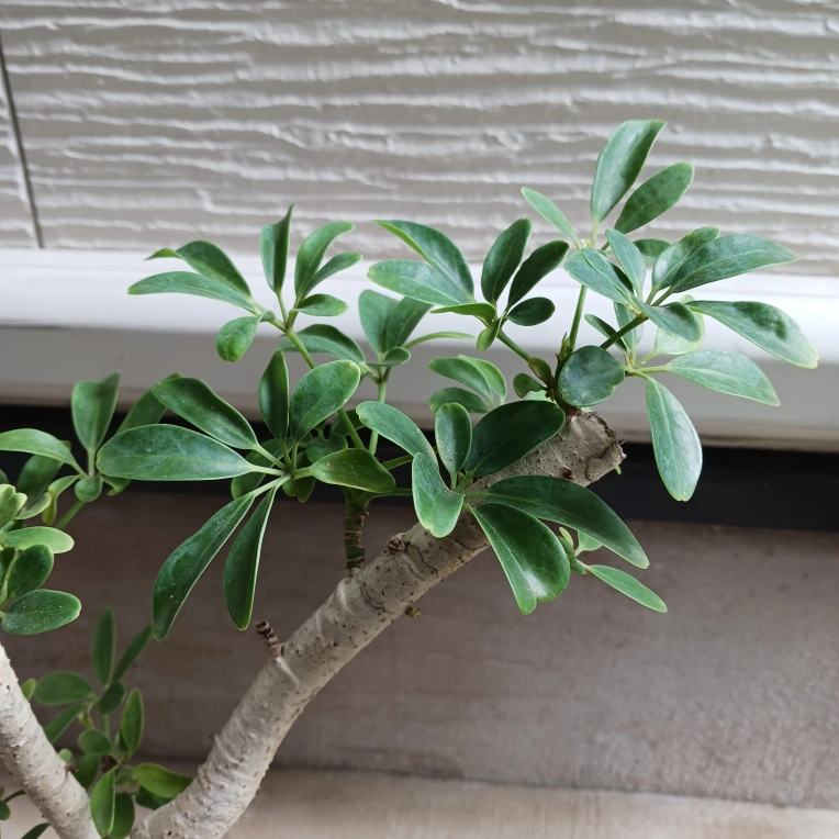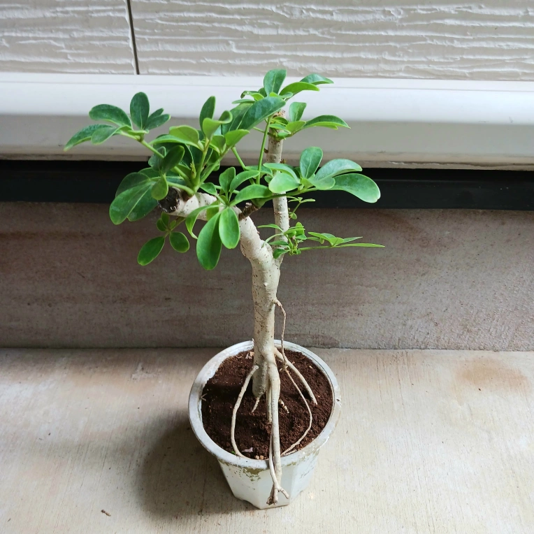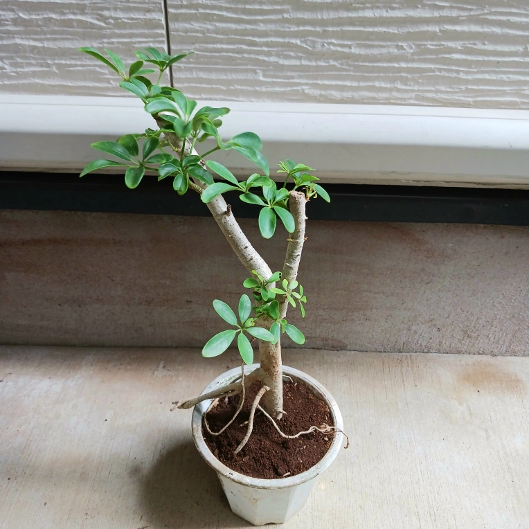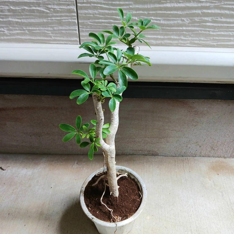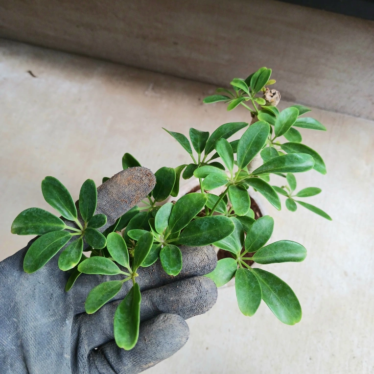 手のひらを広げたようなシェフレラ(ホンコンカポック)の葉をぎゅっと小さくしたコンパクタ 浅鉢に植えて盆栽風にしたり、お気に入りの鉢に入れると見映えがよくなります 《鉢サイズ》 5号鉢(直径15cm × 高さ13cm) 年期のある白のプラ鉢 《植物サイズ(鉢込み)》 横幅:約25cm × 高さ:約50cm 《撮影日》 2025年10月9日 現在の状態を確認したい場合は、購入前にお知らせください。画像追加いたします 《置き場所》 ・風通しのよい室内または屋外の明るい場所 《水やり》 ・土の中まで乾いてからたっぷりと与えてください ・冬場に置く場所の温度が15℃以下になる場合は、水やり回数を減らし、乾燥気味に管理します