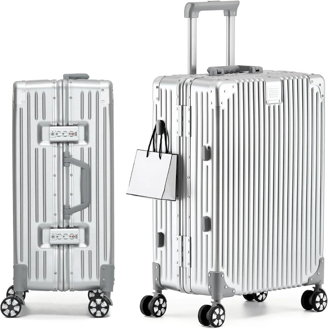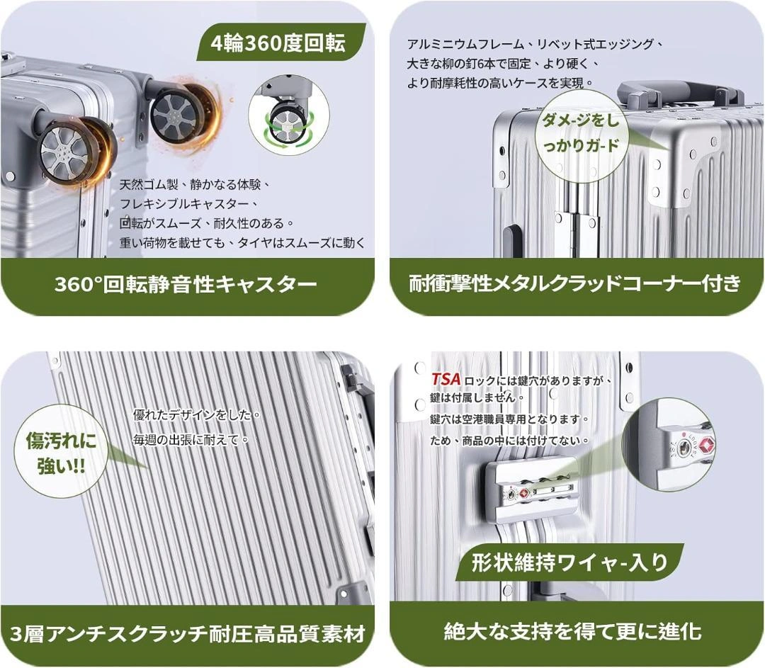 ご覧いただきありがとうございます。 色:シルバー(PC素材) サイズ: M-22inch サイズ(63*42*25.5cm,50L) 3泊4日 【素材】表面素材には三層構造のPCポリカーボネート樹脂+ABS素材を採用しており、軽量なのに耐衝撃性に優れています。長期間使用しても傷が目立ちにくいです。人気のアルミフレー ムを採用しており、ビジネスでもカジュアルでもシーンを選ばずに使用できます。スタイリッシュでありながら、国内旅行や出張には十分な大きさです。 フレーム:アルミ。軽量で持ち運びやすいです。女性でも男性でも持てるカラーとデザイン。 【ロック】国際TSAロック搭載。 (鍵穴は空港職員専用となります。キーは通関用であり、購入者には渡されません。 【360°回転キャスター】全輪360°回転静音性キャスター。 キャスターには耐摩耗性と耐久性に優れた次世代素材TPEを使用。TPEはしなやかで柔らか素材のため、衝撃吸収性にも優れ、走行中の騒音を低減させます。キャスターは360°フル回転し、更に段差や石畳みに強く、軽い力で転がる大判サイズを使用しています。 ご希望の方はお気軽にご連絡ください。