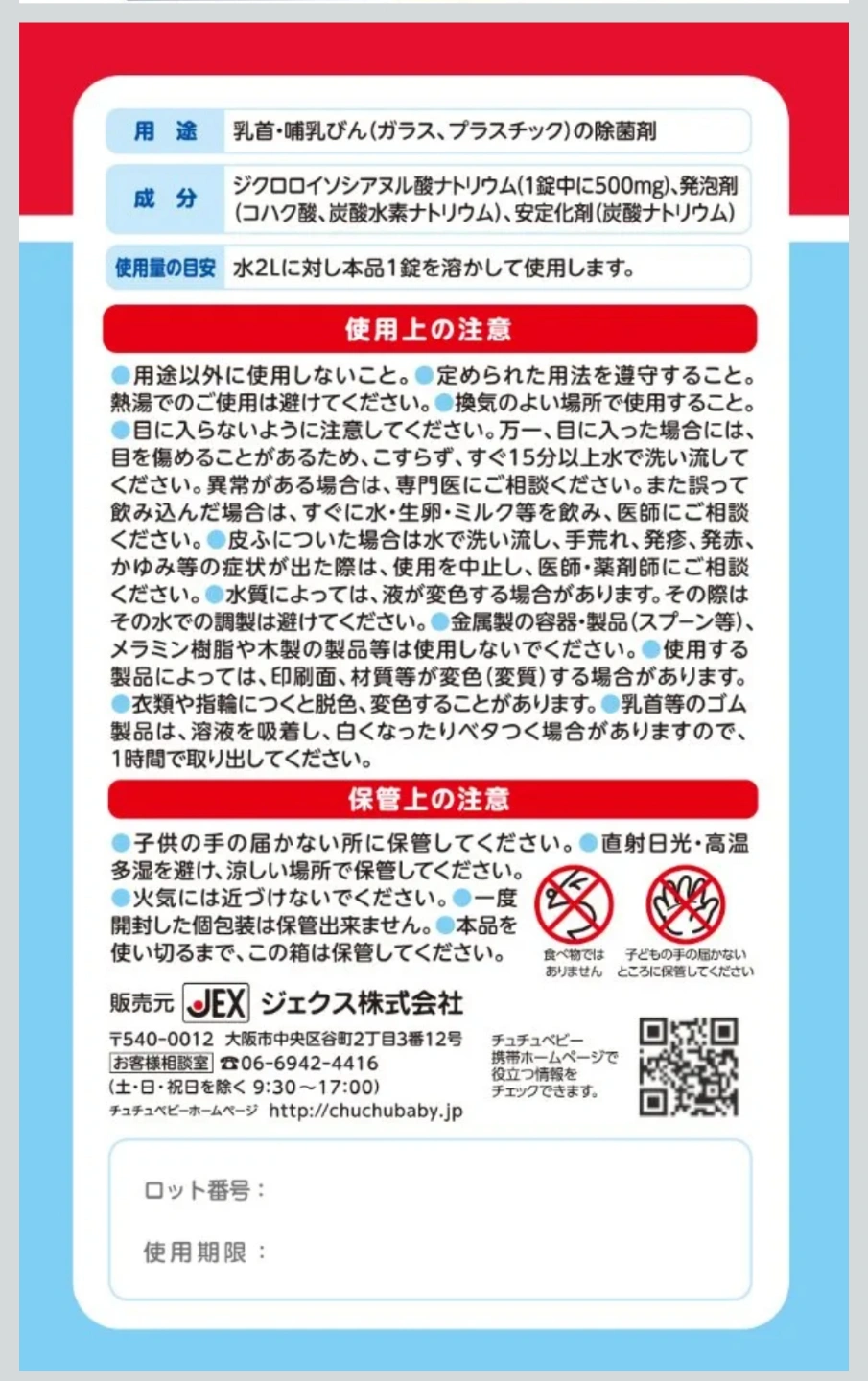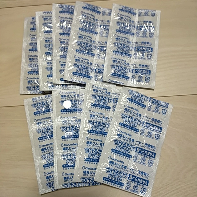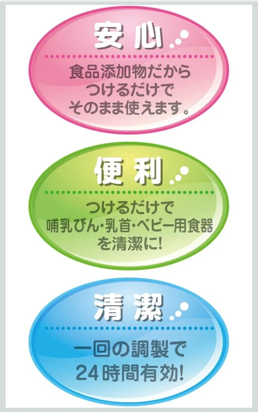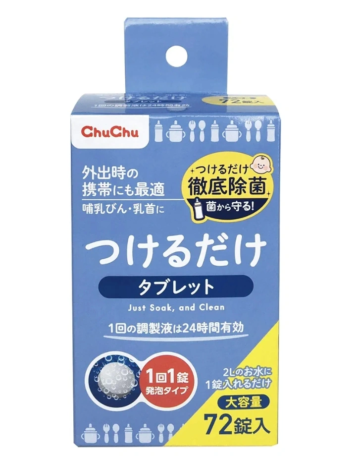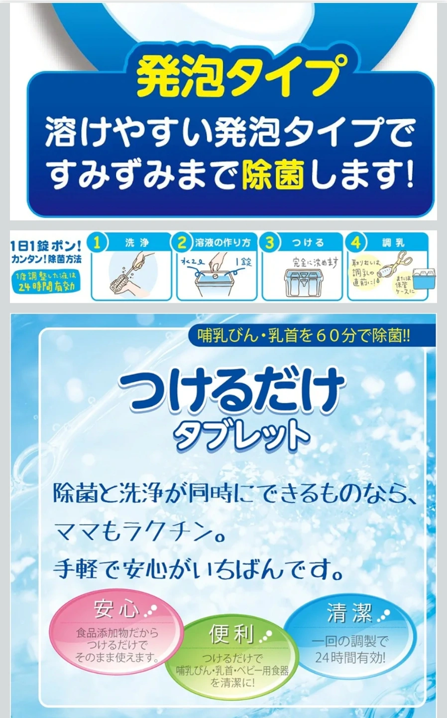 箱なしです 6個入り×9シート 54錠 溶けやすい発泡タイプですみずみまで清潔に。 きれいに洗った乳首や哺乳びん等に溶け残りが少ない発泡タイプのタブレットだから、混ぜなくても均一になる溶液で清潔にできます。 一度調整した液は24時間有効。 また、軽量コンパクトのタブレットだから、旅行や長時間お出かけ先に携帯しやすく、使いたい日の日数分だけ持ち歩けるのでとっても便利。 食品添加物:次亜塩素酸ナトリウム製剤 【使用方法】 1.哺乳びん、乳首は授乳後すぐに食器用洗剤で水洗いします。 2.タブレット1錠に対して水2Lの割合で溶解し、溶液をつくります。※溶液は24時間毎に新しく調整して下さい。 3.溶液によく洗った哺乳びん等を中に空気が残らないように溶液中に完全に沈め、1時間以上つけておきます。 4.調乳の直前に清潔な手で、哺乳びん・乳首を取り出し、水道水ですすいでから調乳して下さい。