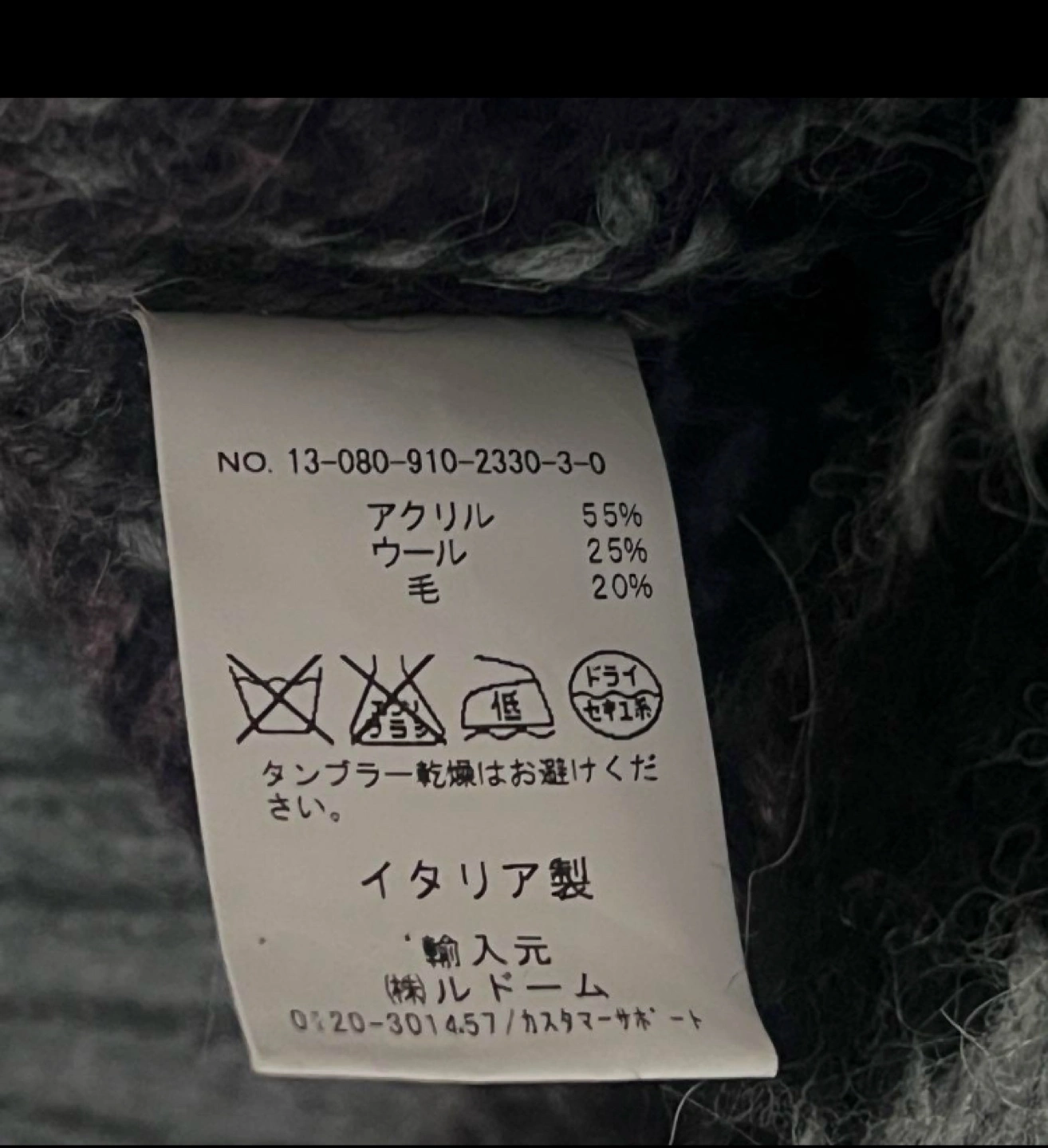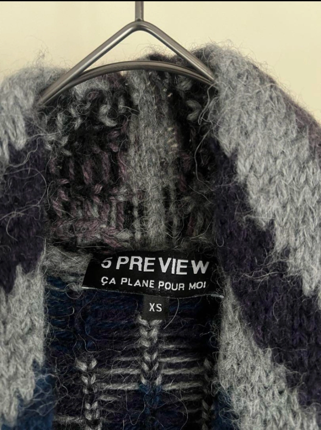 ●ブランド名 5PREVIEW ファイブ プレビュー (スウェーデンのファッションブランド) ●サイズ タグ表記:XSサイズ 肩幅:47cm 身幅:52cm 着丈:76cm 袖丈:75cm 袖幅:15cm ※素人の採寸ですので若干の誤差はご了承ください。 ※サイズはXSですが、身頃はたっぷりとしたシルエット アームホールが細めです(袖幅ご参照ください) ●カラー グレー ネイビー パープル ブラック ●素材 アクリル 55% ウール 25% 毛 20% ●状態 目立つ汚れはありません たっぷりとした着丈 軽い 手ざわり〇 個性的 インパクト イタリア製 ルドーム イエナ ベイクルーズ