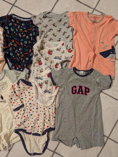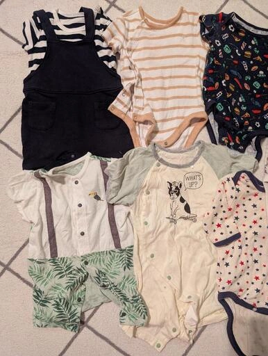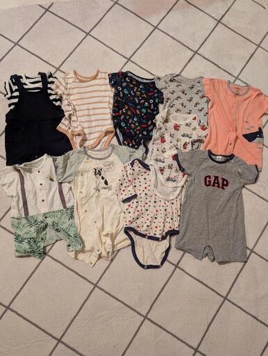 ★バラ売り不可 サイズ60-70です(6m) 半袖9枚(内1枚Tシャツ)長袖2枚 計11枚セット お下がりでもらったものもあるので 綺麗なものから使用感あるものまで混ざっています。 主にお家で着ていました。 目立つ汚れはありませんが、ベビー服なのでご理解ある方ご購入お願いします。 (クマケツロンパースのみ胸元に薄っすらシミあり) たたみじわあり。 細かい写真UPなどコメントください。 ご希望の方はお気軽にご連絡ください。