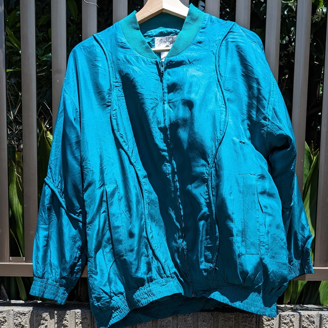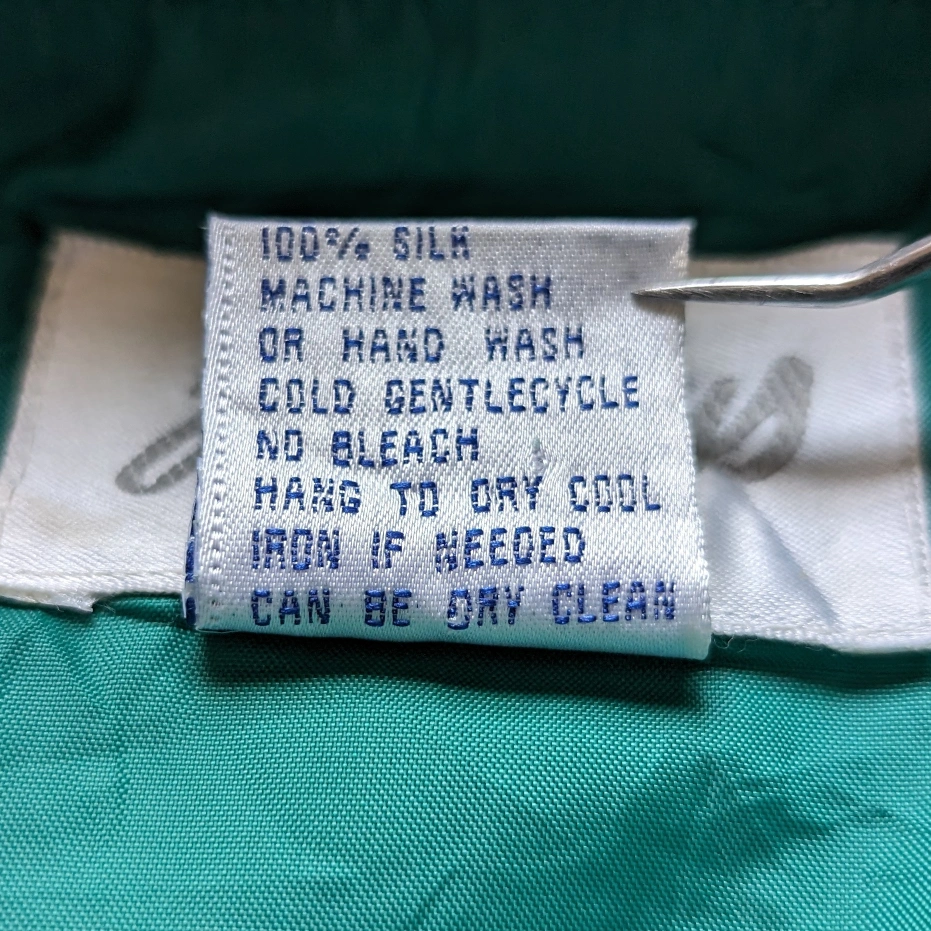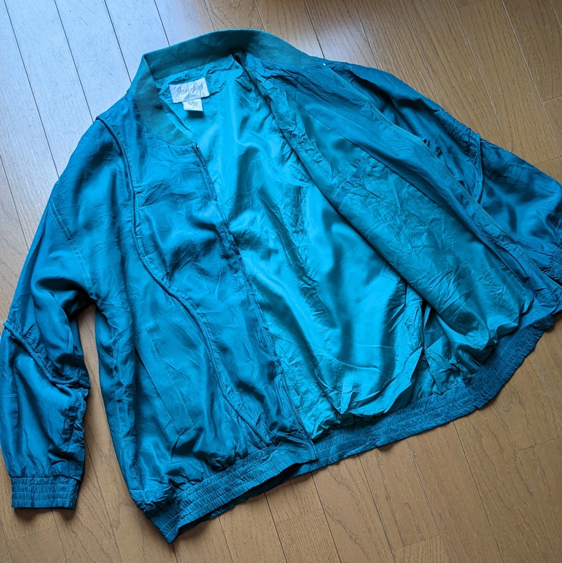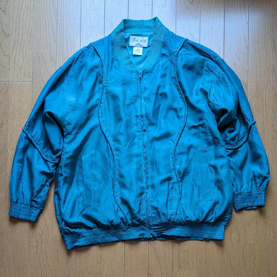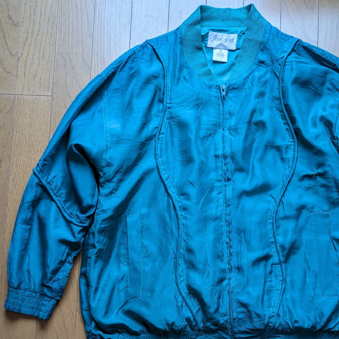 古着店で購入したUSビンテージのシルクブルゾンになります。 鮮やかなエメラルドグリーンと曲線の刺繍がおしゃれです。 軽く羽織れるので寒暖差ある時期に一着あると便利です。 左胸、脇に穴がありましたので簡単に縫って補修しております。 ブランド名∶Jennys CALIFORNIA 肩幅...53cm 身幅...52cm 袖丈...48cm 着丈...66cm カラー...グリーン