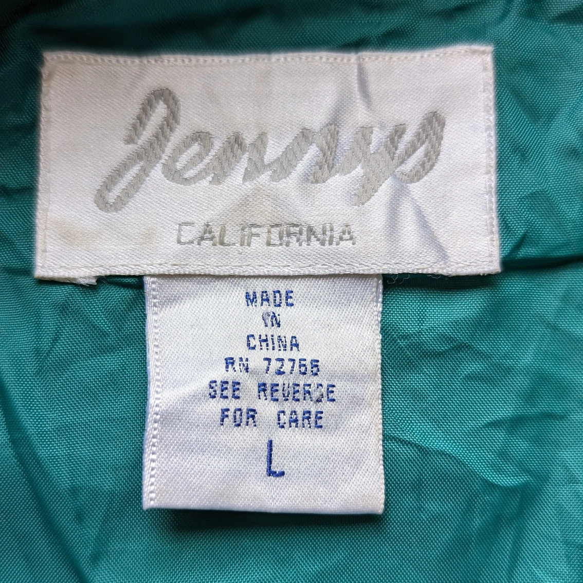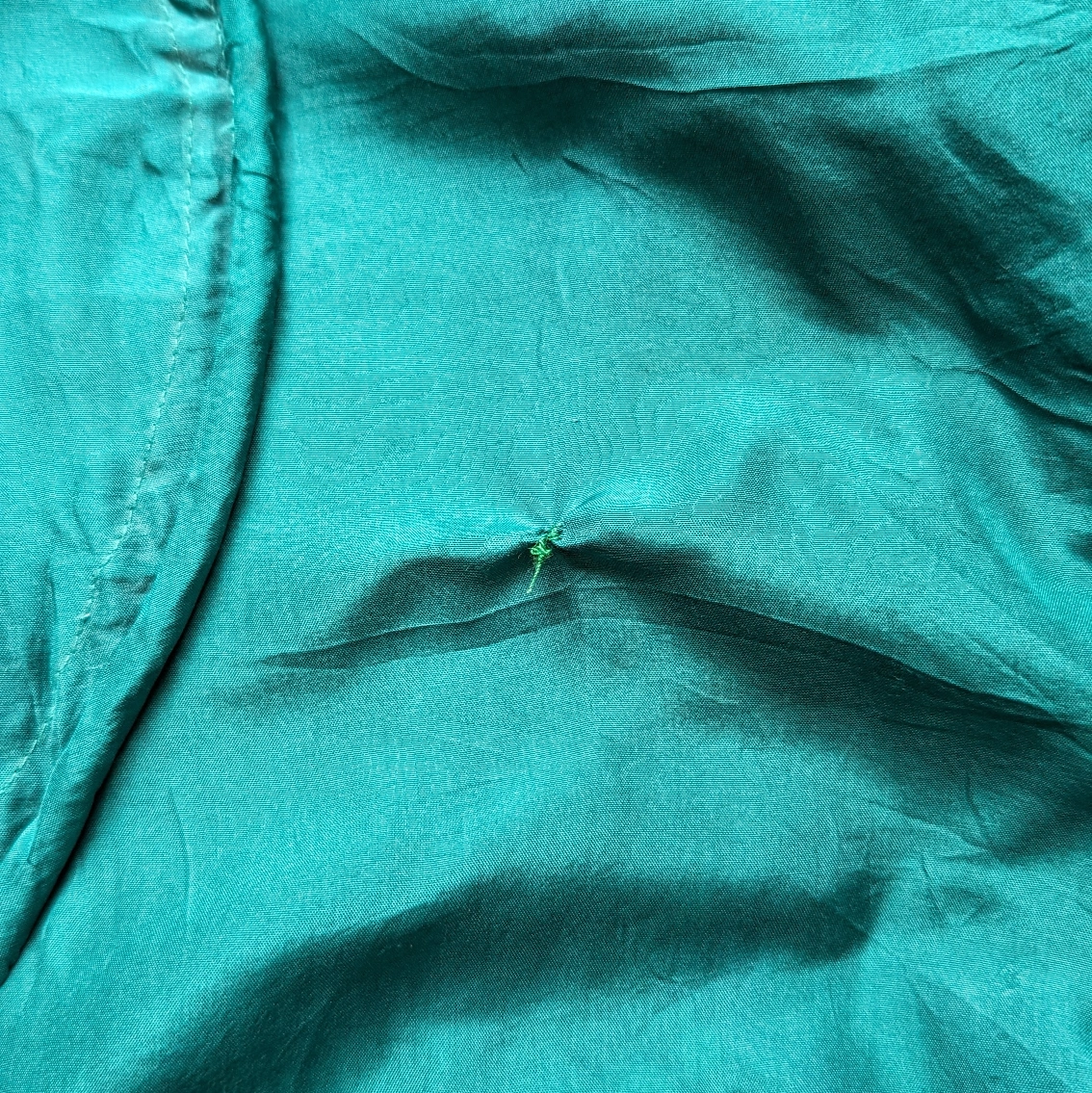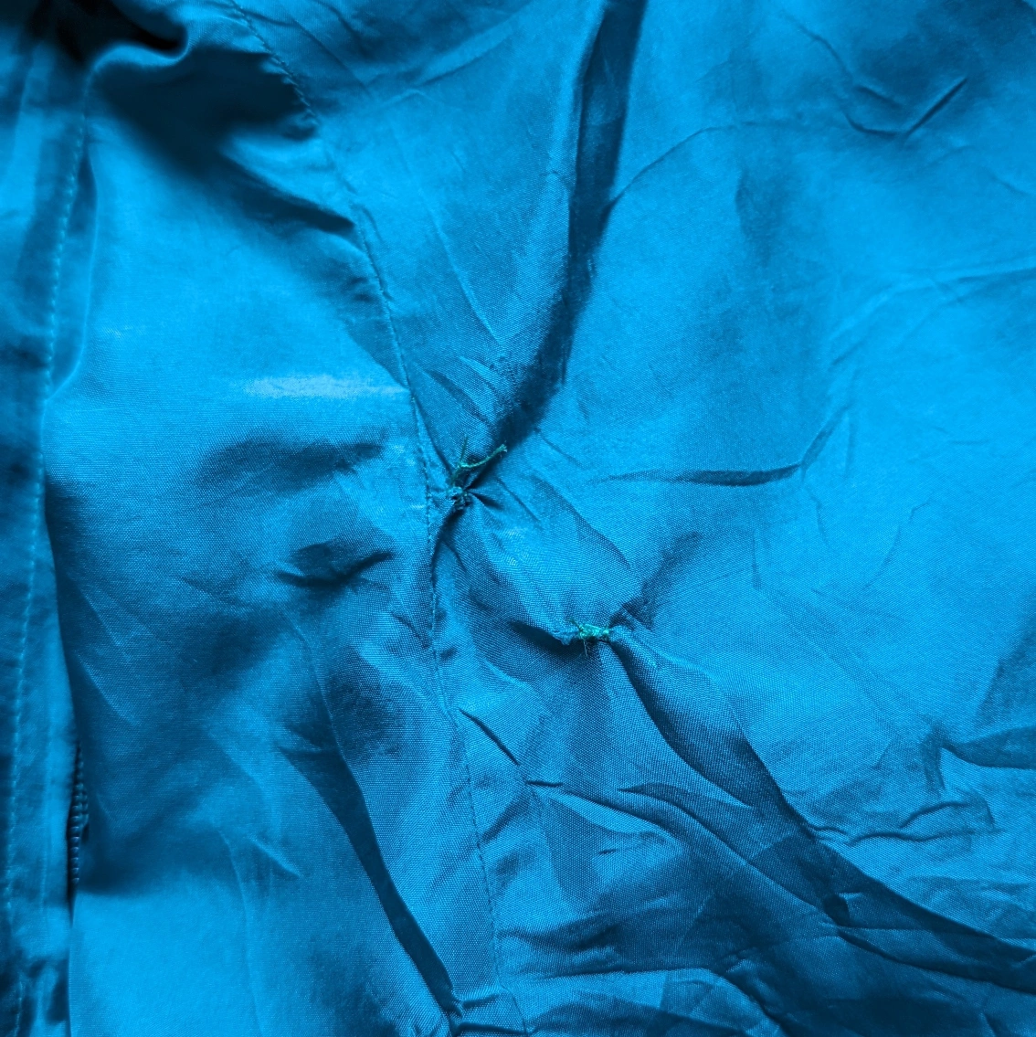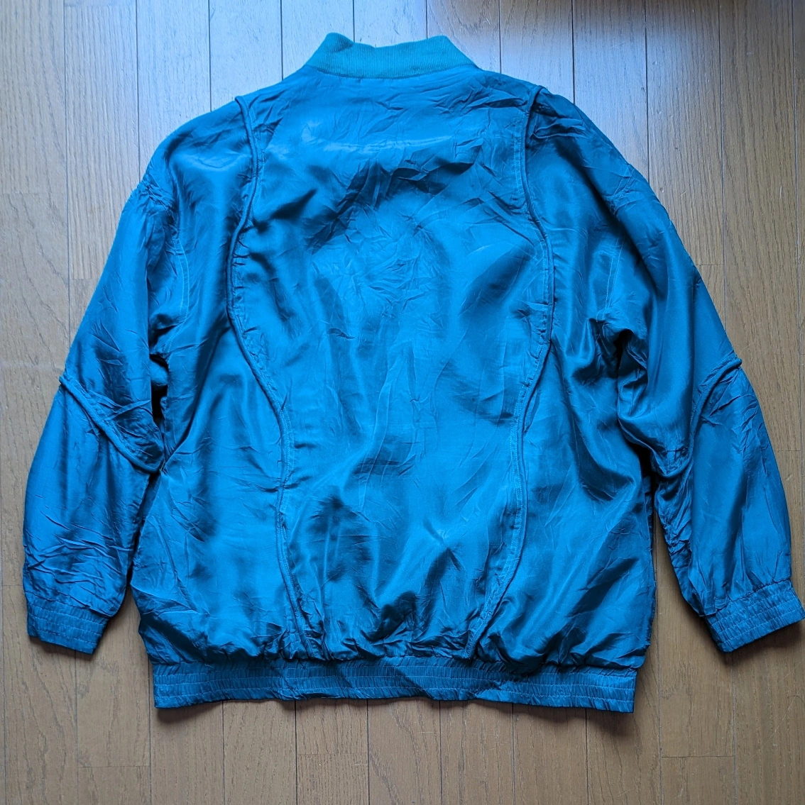 古着店で購入したUSビンテージのシルクブルゾンになります。 鮮やかなエメラルドグリーンと曲線の刺繍がおしゃれです。 軽く羽織れるので寒暖差ある時期に一着あると便利です。 左胸、脇に穴がありましたので簡単に縫って補修しております。 ブランド名∶Jennys CALIFORNIA 肩幅...53cm 身幅...52cm 袖丈...48cm 着丈...66cm カラー...グリーン