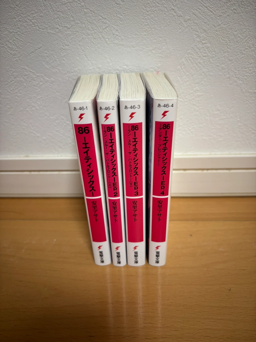 86-エイティシックス-の文庫本1巻から4巻のセットです。 【情報】 シリーズ:86-エイティシックス- 巻数:1巻~4巻 著者:安里アサト 出版社:電撃文庫 【状態】 使用感少なめ、全体的にきれい 中古品であることご了承ください 菊名池公園か妙蓮寺駅でお時間あわせてお願いいたします