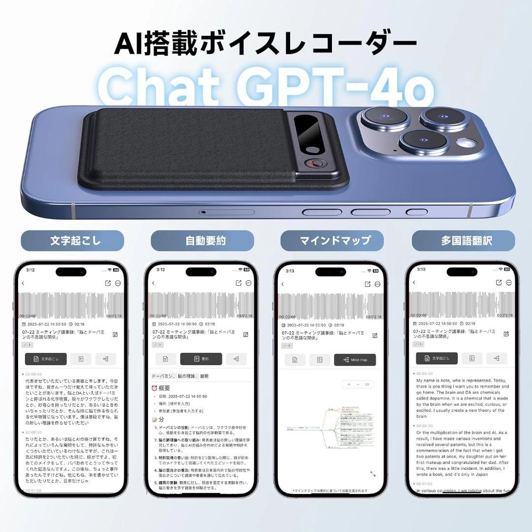 ご覧いただきありがとうございます✨ 対応デバイス: パソコン ハードウェアインターフェイス: ブルートゥース マイク波形率: 内蔵 フォーマット: MP3オーディオ 電池の個数: 1 単3形 電池(付属) 商品の寸法: 5奥行き x 9高さ mm メモリストレージ容量: 64 GB 商品の重量: 30 グラム 【AI搭載高精度録音機】kebrumaのボイスレコーダーは、録音、自動文字起こし、要約、マインドマップ作成機能まで統合しており、80種以上の言語で迅速かつ正確な書き起こしを実現します。(アプリを最新バージョンにアップグレードする必要があります。) GPT-4oモデルに基づいて、ユーザーはアプリで要約と会議録を作成し、日々の作業効率を向上させることができます。 【自動要約と自動文字起こし】AIボイスレコーダーがあれば、「録音->文字起こし->要約」の一連作業がワンタッチ操作だけで即座に完了できます。 会議、通話、セミナー、インタビューや創造的なひらめきの記録など様々なシーンに合わせて、異なる形式で効率的に要約とマインドマップを作成できます。このAIツールで複雑な情報を洗練して可視化し、日々の作業の大幅な効率化に貢献します。 【2つ高感度録音モード】文字起こし機能付きボイスレコーダーには通話録音と会議録音の2つのモードがあります。ダブルクリックで簡単に「通話録音」と「会議録音」モードを切替にします。会議に必要な高品質の周囲音をキャプチャするために2つの高精度空気センサーが使用され、携帯電話の通話音をキャプチャするために1つの振動センサーが使用され、クリアな通話録音が保証されます。電話、ビジネスレポート、講義、会議、セミナー、コース、面接練習などに幅広く使用できます。 64GBの大容量ストレージで約1000時間の録音を保存でき、最大5時間までの録音を1つのデータに集約できるため、長い会議や講義でも安心してご利用いただけます。バッテリー残量はLEDスクリーンで表示されるので、充電の不安はありません。 ご希望の方はお気軽にご連絡ください。
