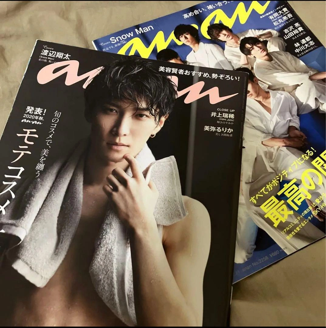 SnowMan表紙、渡辺翔太くん表紙の雑誌2冊セットです。 スノがデビューした年にananで翔太くんの特集が掲載された2020年のもの。 全員表紙は2021年のものです。 特集ページ数が多いため写真は一部です。 保存用に購入し、そのまま保管していました。古い雑誌ですので、ご了承下さい(^ ^)