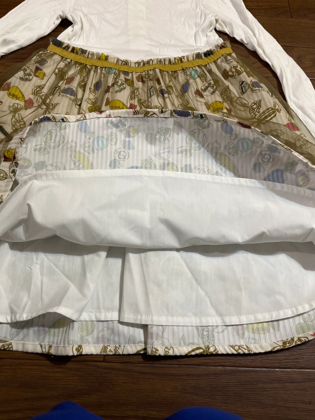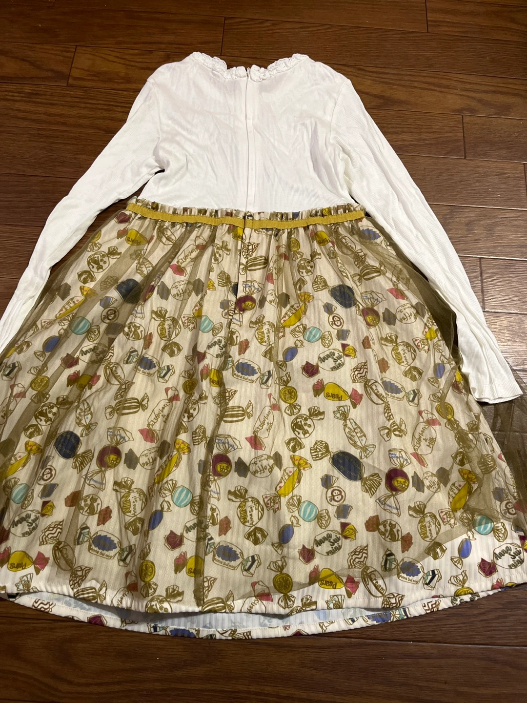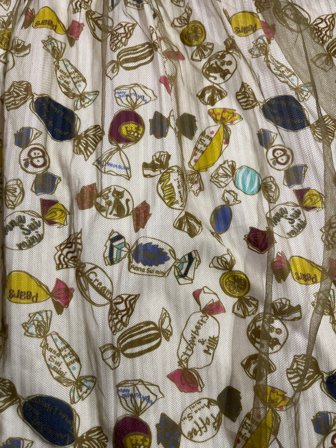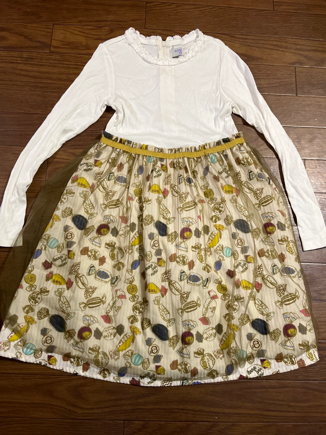 ANNA SUImini スカート キャンディ ボンボン 柄 アナスイミニ・チュールワンピース ◻️サイズ140 ◻️定価18800円 ポップなキャンディー柄のスカートにチュールがかかっています。 生地もチュールもしっかりした素材ですので、フォーマルにもお使い頂けます。 スカート部分には白色の裏地も付いて程よいボリュームがでて可愛いですよ♪ 上半身は細リブの柔らかいカットソーに、ANNA SUIのメタルパーツ付き 短時間着用のみで未使用に近い状態です。 裏にペチコートがついていますので1枚でも安心してお使いいただけます。 後ろはファスナー付きです。 落ち着いた色合いが秋冬コーディネートにもピッタリですよ。
