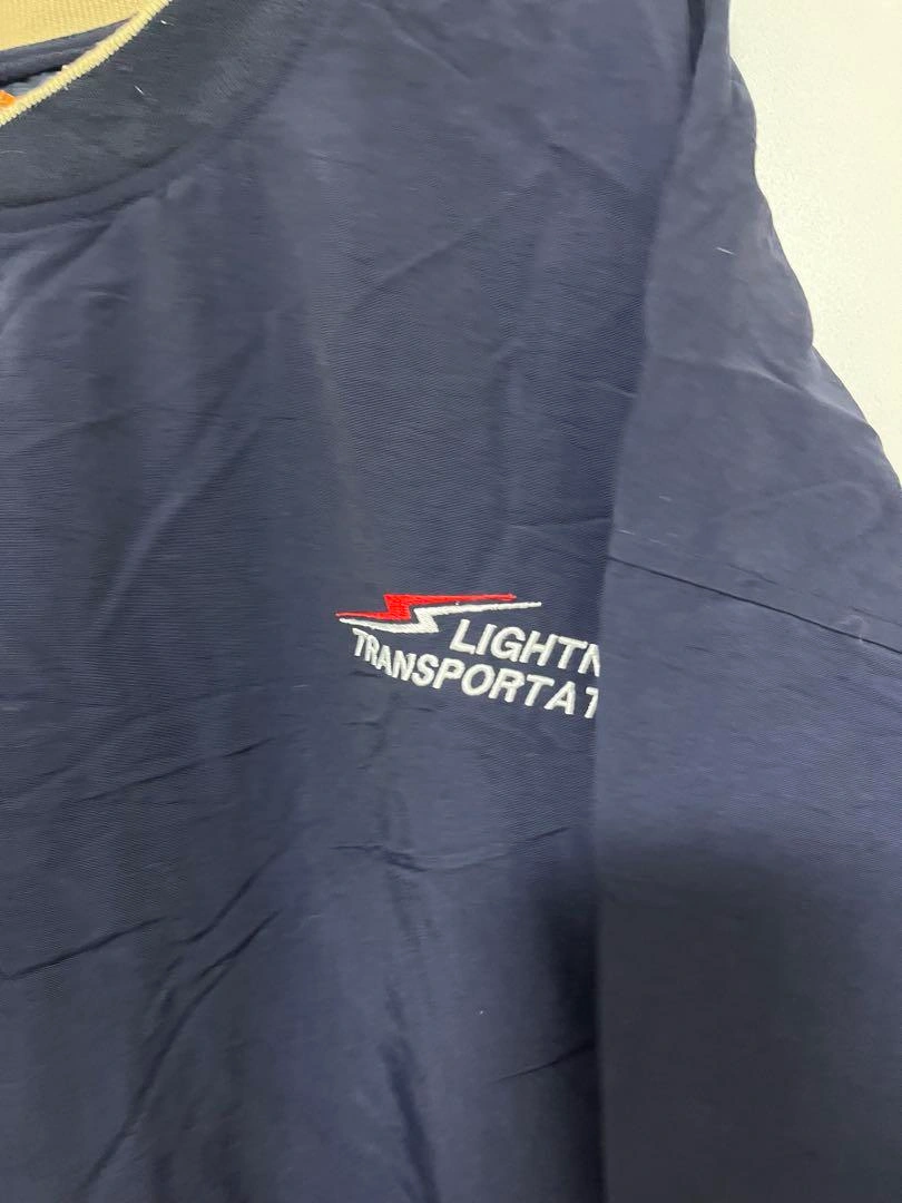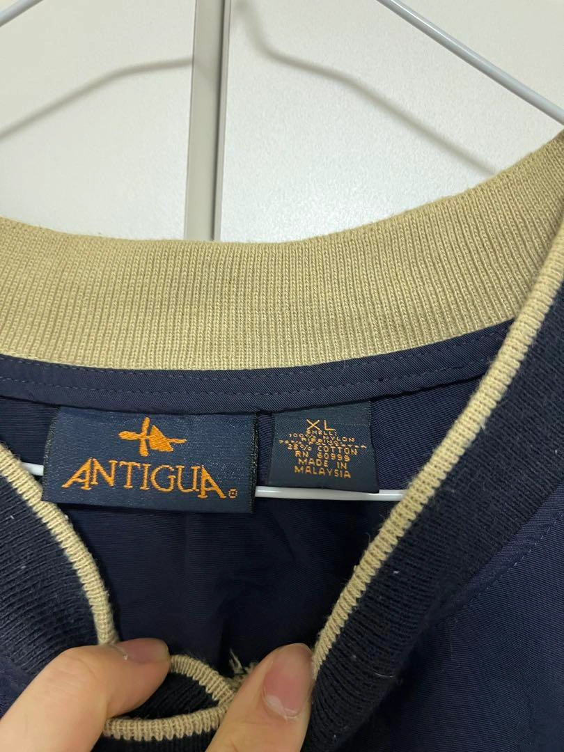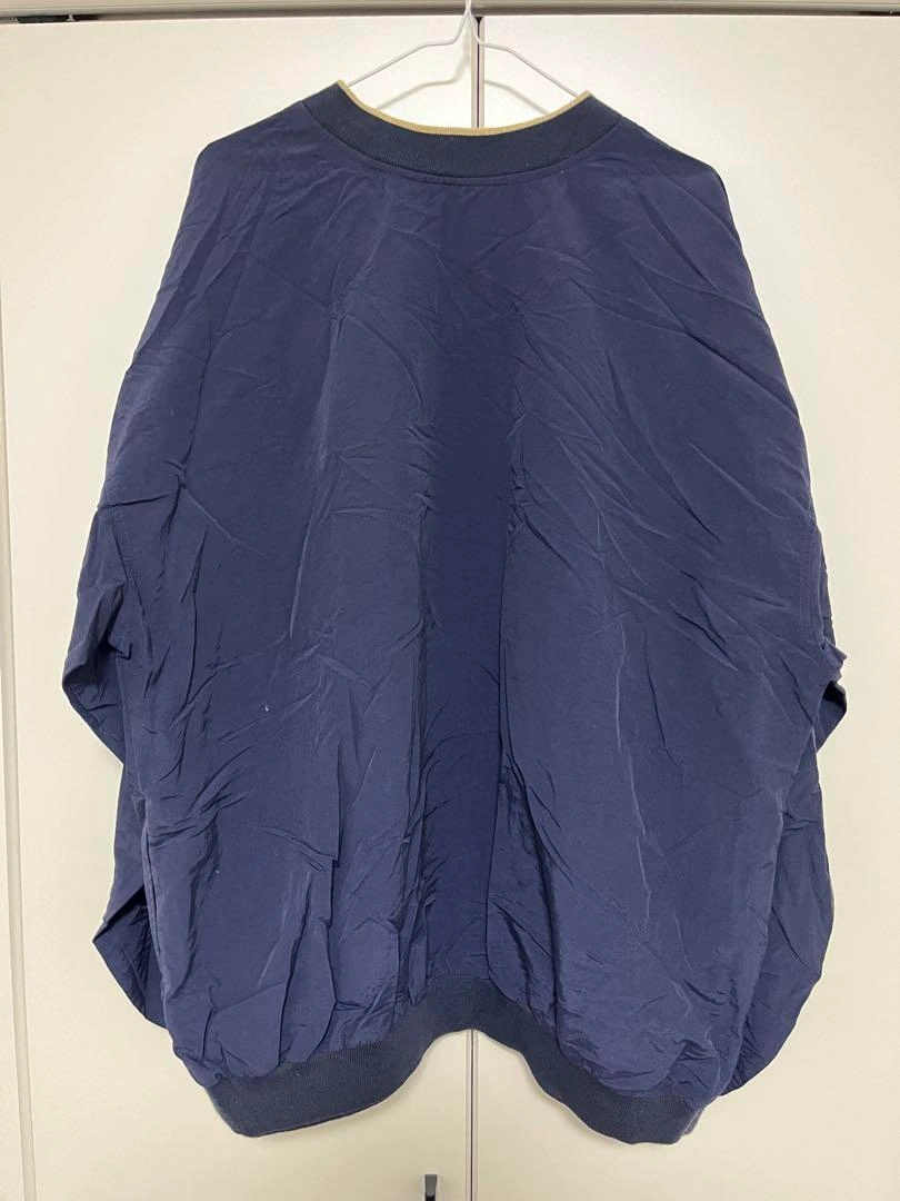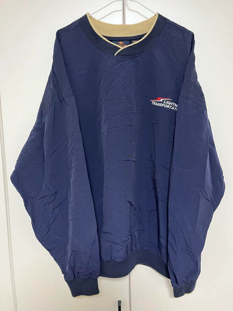 ANTIGUA(アンティグア)のプルオーバーナイロンジャケットです。企業モノ・刺繍ロゴの希少モデル。\肩がドロップし、身幅が広く取られたビッグシルエットです。\ボディはダークネイビー(濃紺)。襟元のベージュの切替リブがアクセントになっています。\胸元に「LIGHTNING TRANSPORTATION」の企業ロゴ刺繍があります。\軽やかなナイロン素材で、これからの季節にライトアウターとして活躍します。\実寸: 肩幅: 58cm 身幅: 76cm 着丈: 73cm 袖丈: 59cm ご希望の方はお気軽にご連絡ください。