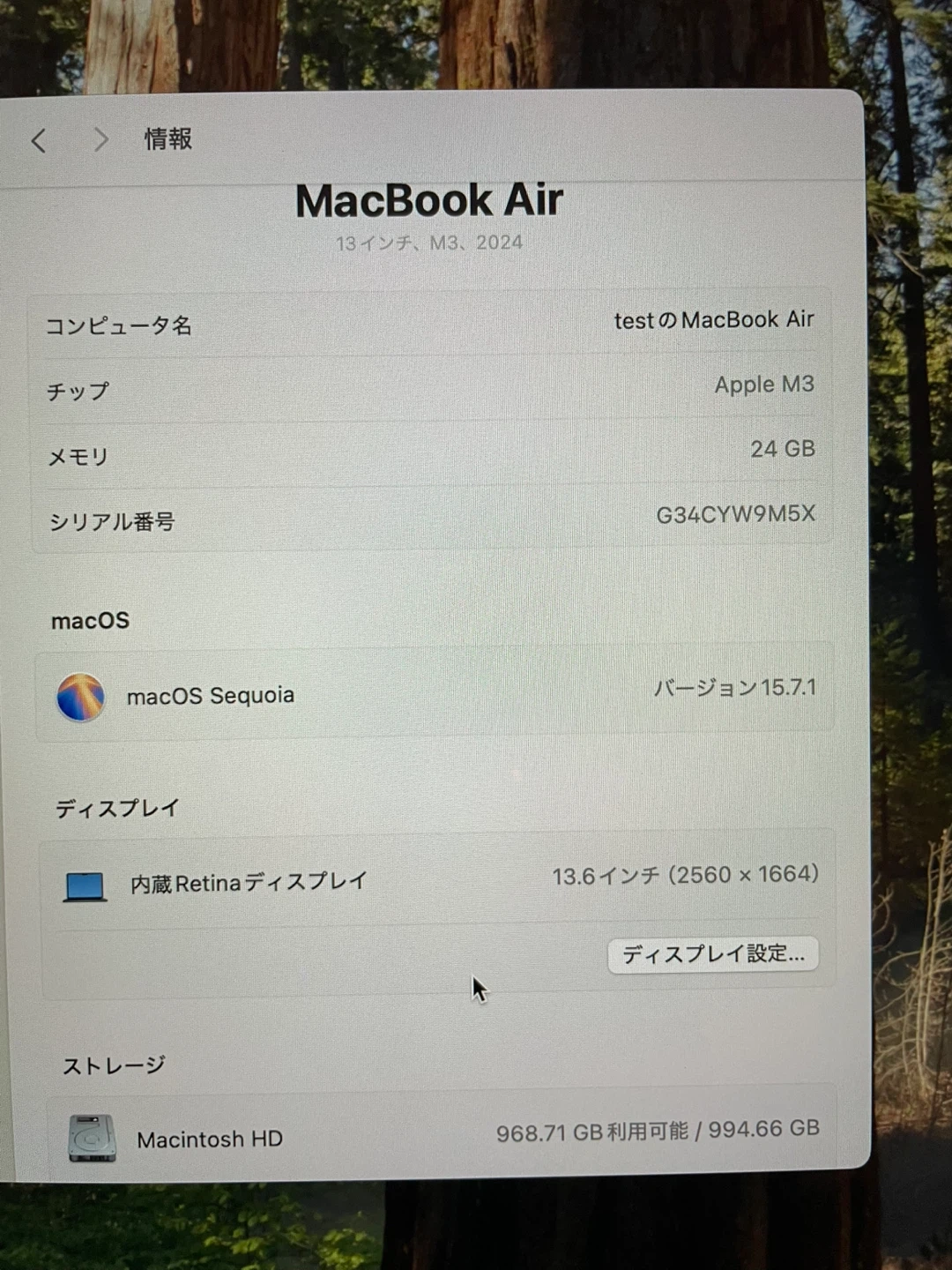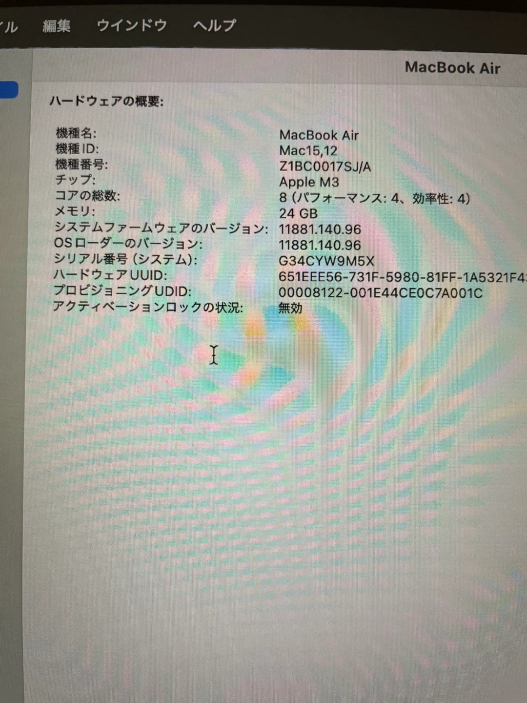 【状態について】 英字キーボードのお品物でございます。 キーボードにテカリがございます。 利用には影響せず、通常使用に支障ないレベルです。 【動作について】 下記項目の動作確認済みです。 ・通電 ・充電 ・キーボード ・トラックパッド ・USBポート ・Wi-Fi ・カメラ ・サウンド OS再インストール済みとなりますので 届いてすぐに、安心してご使用頂くことができます。 【付属品】 ・箱、ACアダプタ ※ケーブルは付属しておりません。ご使用の際には別途必要となりますので、ご注意ください。 【おすすめポイント】 ・人気のMacBook Air M3 2024年モデル ・M3チップと24GBの大容量メモリが組み合わさり、 複数のアプリ・高画質画像・動画編集やAI処理もスムーズにこなします。 ※複数の販売サイトにて出品しております。販売状況や手数料などの条件により、出品価格が変動する場合がございます。 また、他サイトで先に販売された場合は、こちらの出品を停止することがございます。 あらかじめご了承くどさい。