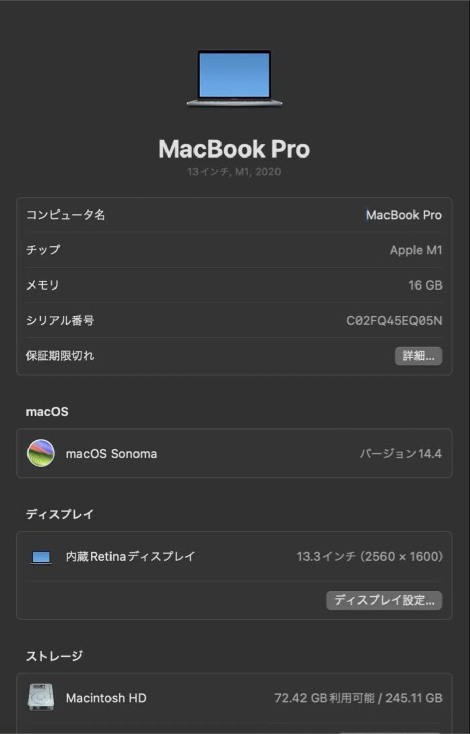 【状態について】 全体的に綺麗です。 スクリーンの色味も変なところは見受けられません。 【動作について】 ・初期化後に最終チェックとして一旦セットアップしてあるので、動作も確認済みです。 【付属品】 ・付属品は写真に写っているもので全てとなります。 【おすすめポイント】 ・人気のMacBook Pro M1 2020年モデル ・16GB RAMで快適にご利用いただけます。 ※複数の販売サイトにて出品しております。販売状況や手数料などの条件により、出品価格が変動する場合がございます。 また、他サイトで先に販売された場合は、こちらの出品を停止することがございます。 あらかじめご了承くどさい。 ※発送まで最大7日かかることご了承お願いいたします。