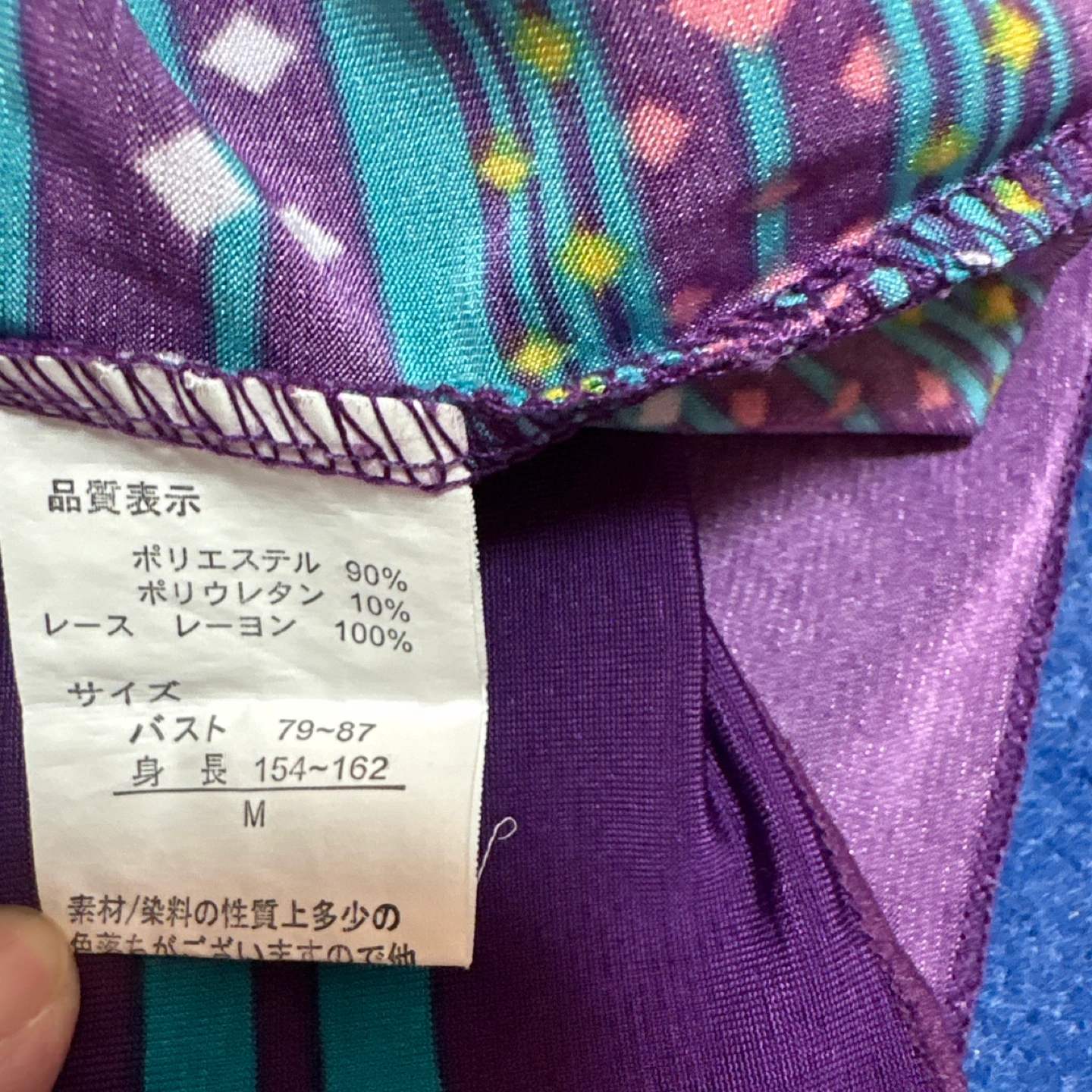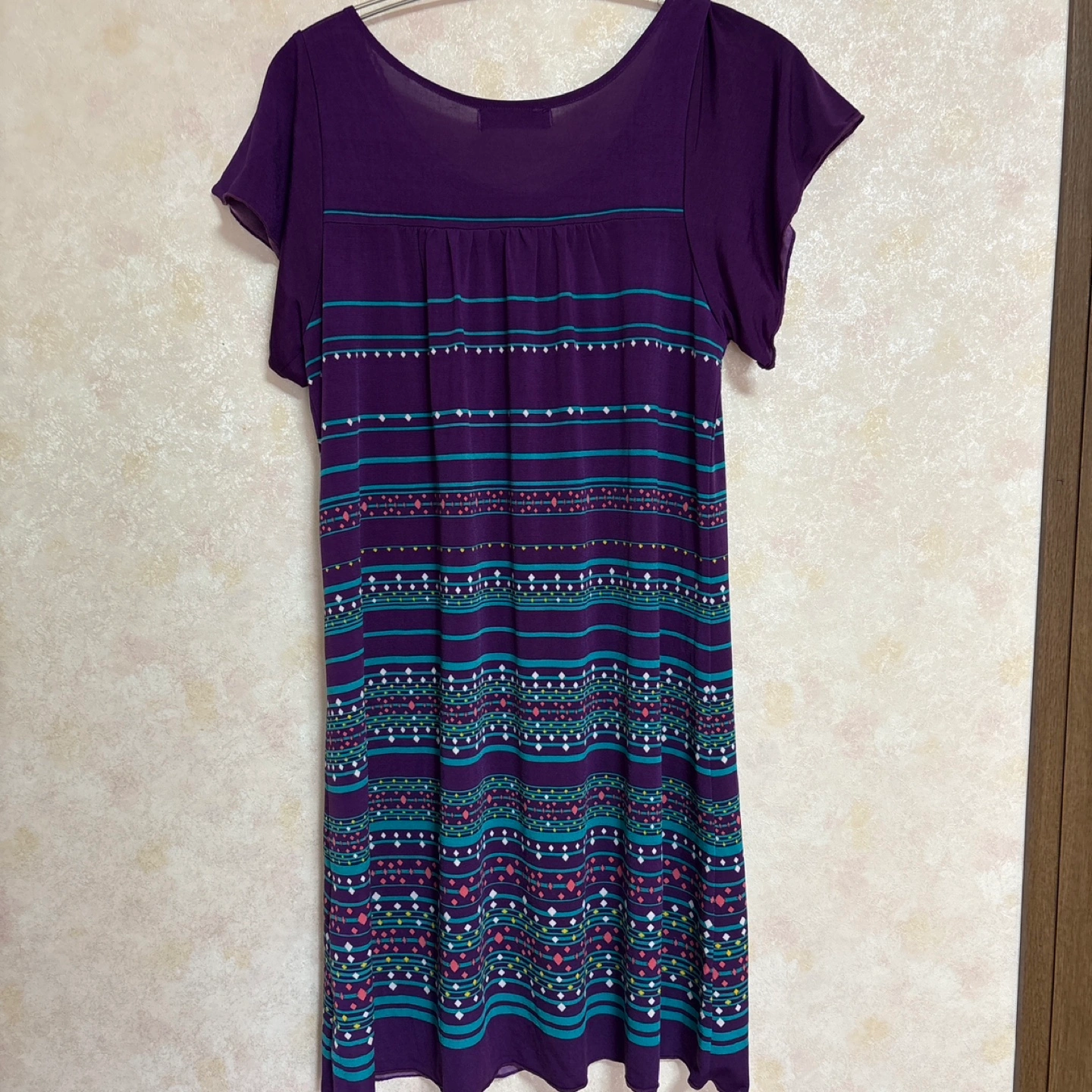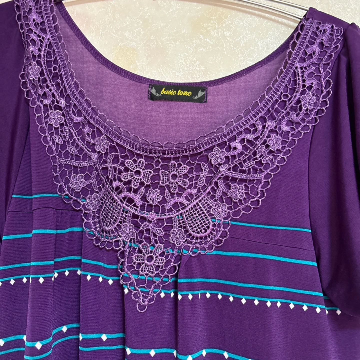 ・ブランド:basic tone ・カラー:紫 ・サイズ:M(バスト79~87cm、身長154~162cm) ・デザイン:レース、柄入り ・素材:ポリエステル、ポリウレタン、レーヨン レースのネックラインが特徴的な紫のストライプチュニック。 3回ほど着用 洗ってもアイロン掛け不要で暑い夏場に活用します。 - カラー: 紫 - デ ザイン: レースのネックライン - スタイル: チュニック - 袖のスタイル: 半袖 - パターン: ストライプとドットのデザイン