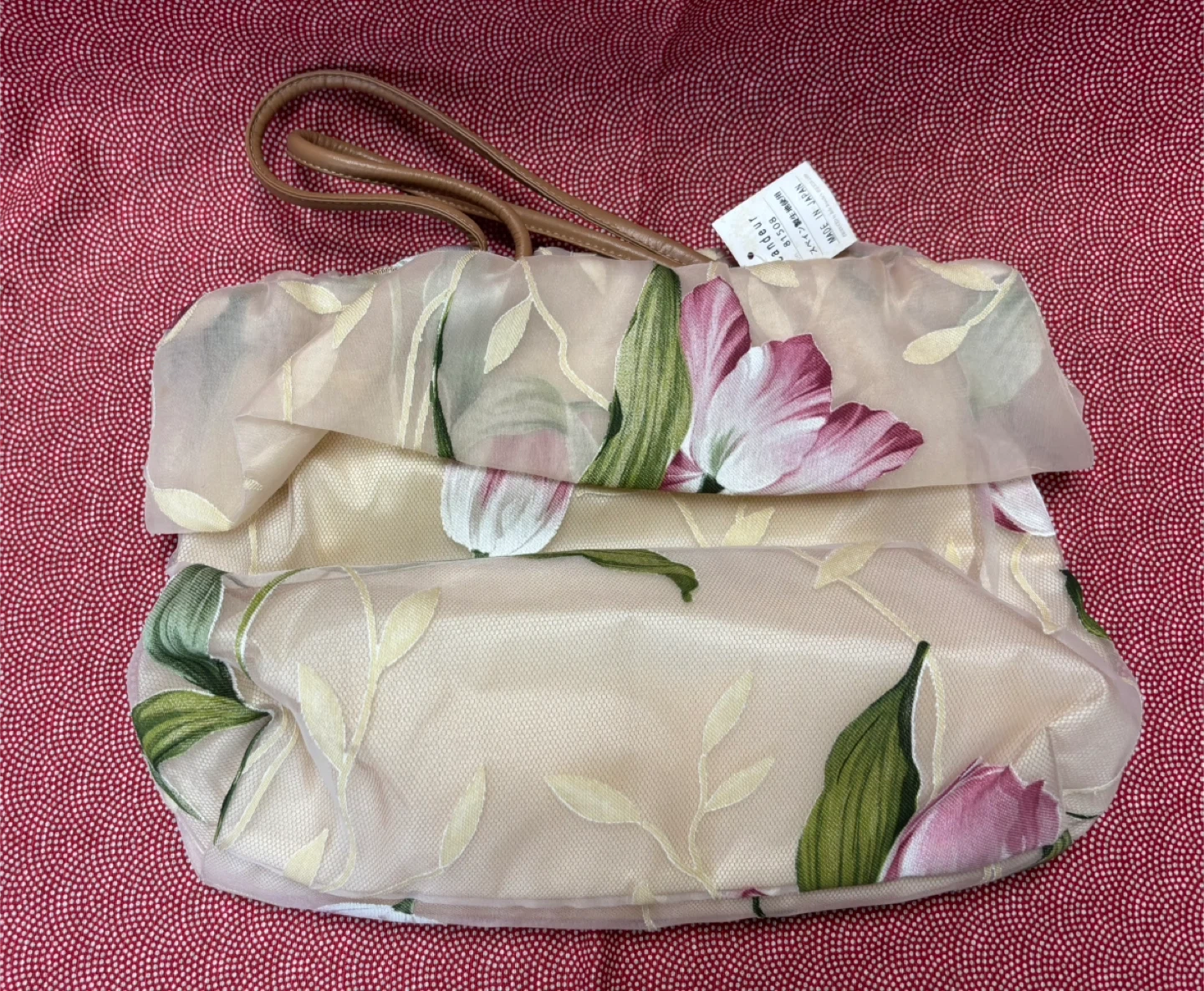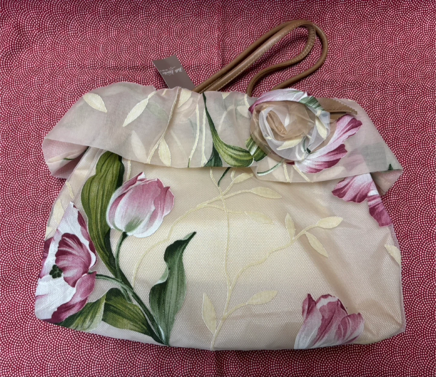 Belle Brancheの可愛らしい花柄ハンドバッグです。 不織布の袋に入れてクローゼットで保管していました。 【情報】 ブランド:Belle Branche カラー:ベージュ系、花柄 サイズ:底面幅30cm、持ち手側幅28cm、高さ23cm、奥行10cm 【状態】 未使用 ご不明点があればお気軽にご連絡ください 素人採寸のため誤差があることをご了承ください