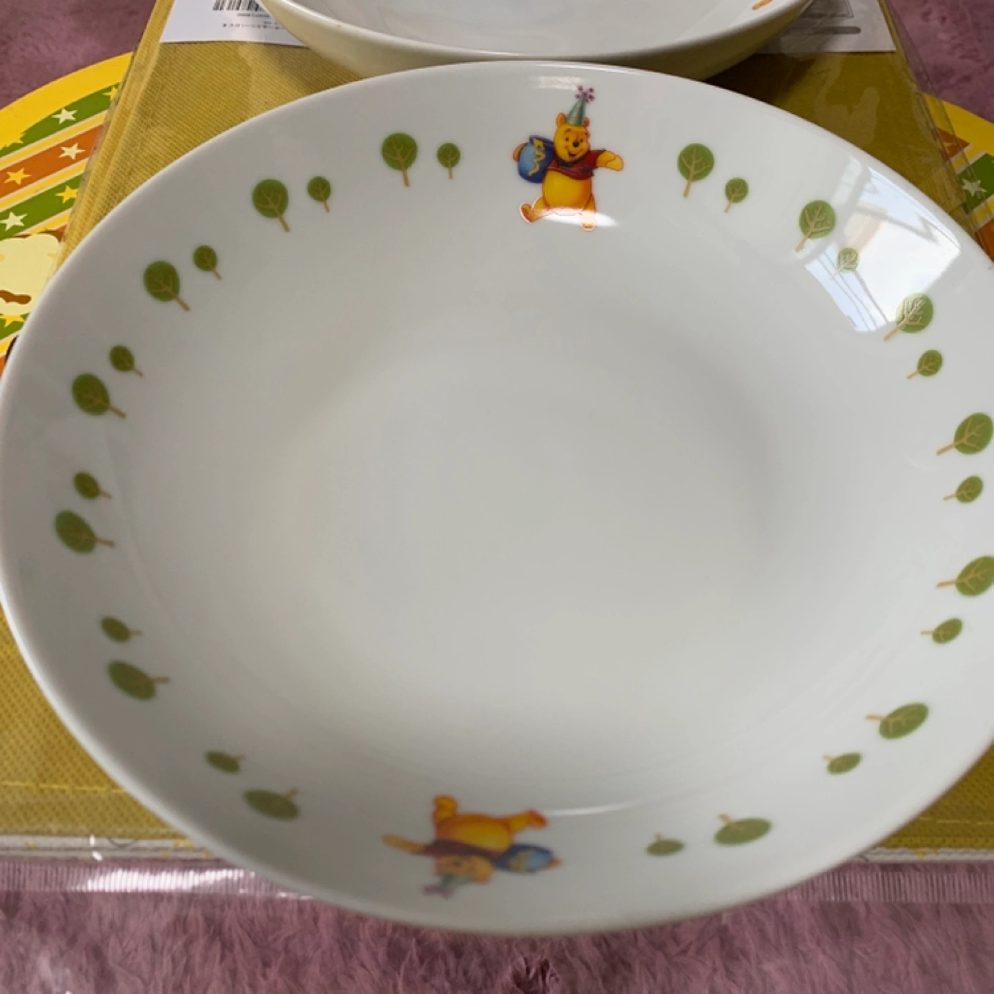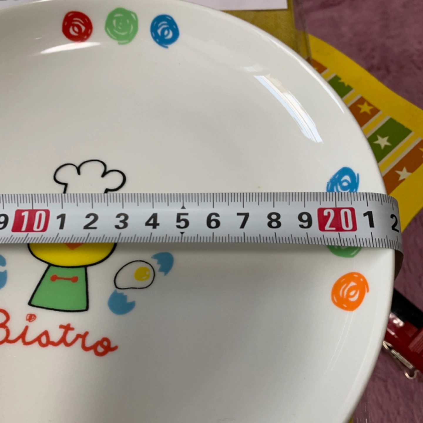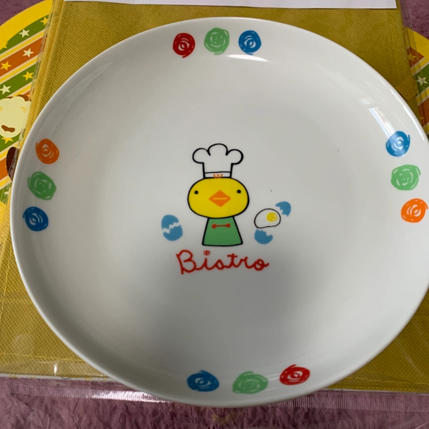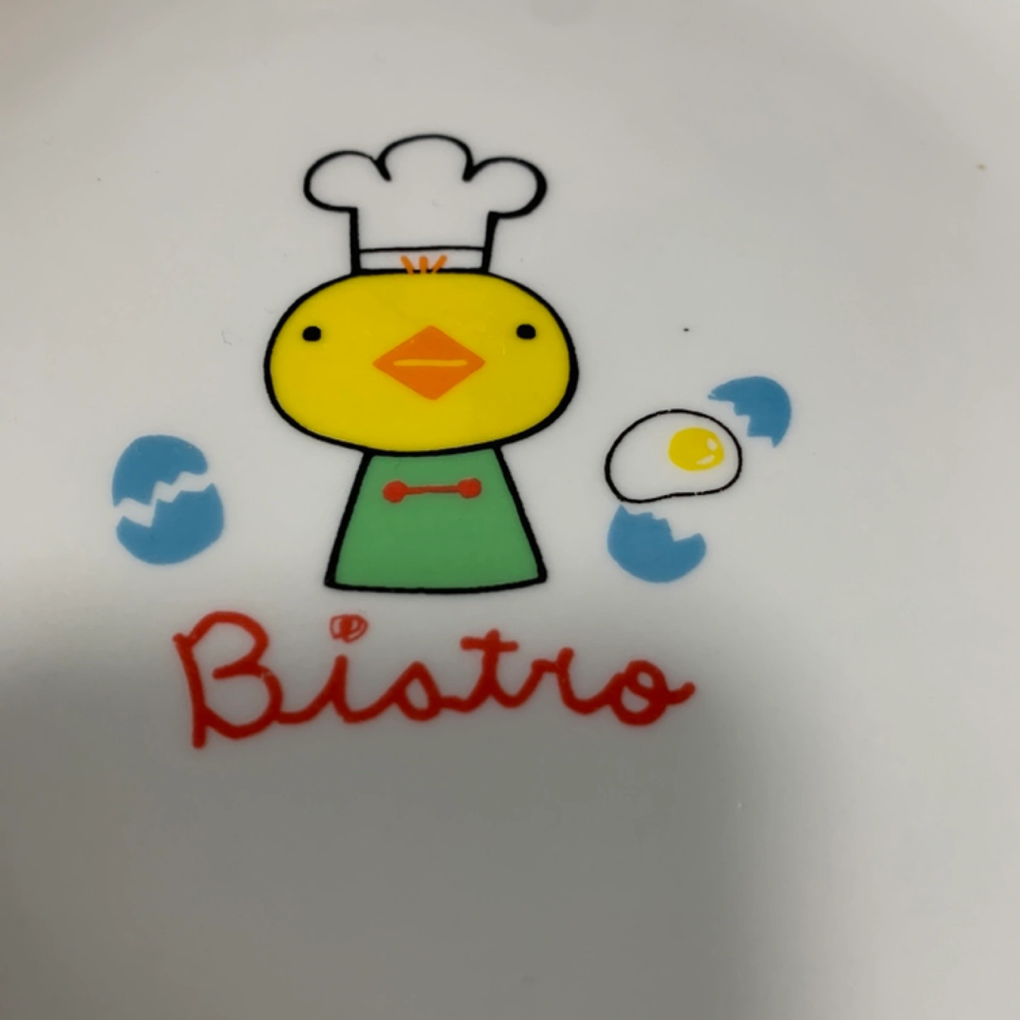 シェフのアヒルが描かれたカラフルな子ども用皿 - デザイン: シェフの帽子をかぶった黄色いアヒルのキャラクターと卵のイラスト - 色: 白、緑、黄色、青、オレンジ、赤 - 文字: Bistroの文字が赤色で描かれている - 裏面: 滑らかな白色の底面 箱はないのですが、一度も使用していません。 22㎝ほどあります。 他のお皿とおまとめ買いの場合は、お安くいたします。 ご覧いただきありがとうございます。