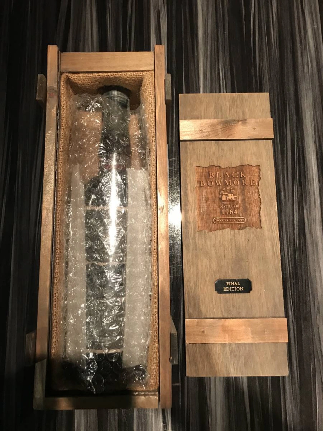 ・BLACK BOWMORE ウイスキー ・DISTILLED 1964 ・Final Edition ・木箱入り ボウモアは1779年創業のスコッチ最古の蒸留所の一つです。 1963年にスタンリーモリソン社に買収され新しい蒸留器で初めて蒸留されたシングルモルトその中で最も希少価値の高いウィスキーです。 シェリー樽で31年の長期熟成されたファイナルエディションがボトリングされたのは1995年、出荷本数は約1800本 ファースト、セカンドよりも少ない本数です。 ファイナルがボトリングされてから12年後、同年に仕込まれた樽が発見され『ブラックボウモア42』として827本出荷されていますが、いずれにせよ現在している約60年前に仕込まれたブラックボウモアは残りが少なく希少だということです 最近の海外オークションでファースト、セカンド、ファイナルの3本で5千万を超えました。 まだ何処かで飲めるかもしれない… 時間が経てば経つほど その機会は遠のいて夢物語となるでしょう ボウモアファンとして、 是非この機会に如何でしょうか 歴史の浅い国産ウィスキーよりコレクションとして希少性の上がる逸品です ワイン同様に冷暗所での保管 木箱に傷や変色無し液減りもいっさい無いものと思います。(何れも画像を参照してください) こちらまで引き取りに来ていただける方のみ 値引き対応させていただきます。
