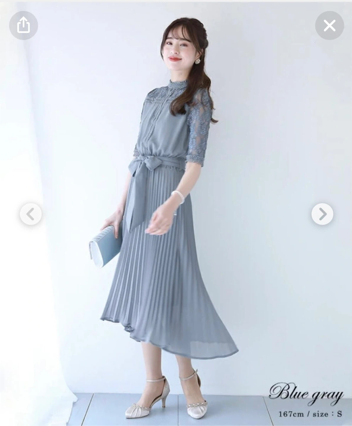 ブルーのプリーツスカートとレース袖が特徴のSサイズパーティードレスです。 - 色: ブルー - サイズ: S - デザイン: プリーツスカート、レース袖 - スタイル: ウエストリボン付き 未着用・タグ付きの新品です。
