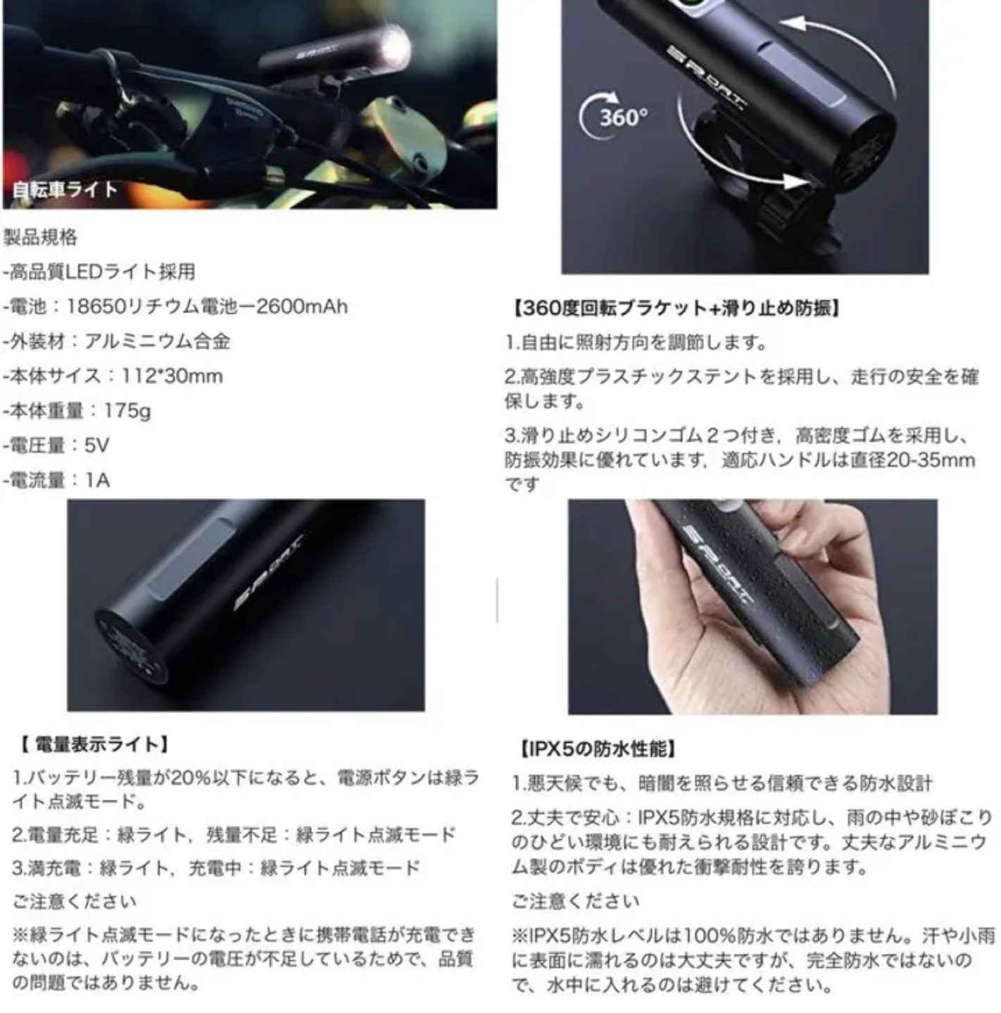BOSIWO 自転車 ライト 大容量2600mAh USB充電式 LED 800ルーメン モバイルバッテリー機能付 高輝度 IPX5防水 防振 アルミ合金製 PSE認証済 懐中電灯兼用 停電対応 地震対策 登山 夜釣り 動作確認済み(写真1番目参照) 【パッケージ内容】 1.自転車 ライト*1 2.USB充電用ケーブル*1 3.360度回転ブラケット*1 中古品ですので、ご理解の上ご購入をお願い致します。 神経質な方はご購入をお控えください。 #自転車ライト #ライト 新宿御苑前駅 新宿三丁目駅 新宿駅 新宿1丁目にて取引希望しております。 別の場所希望でも気軽くメッセージください。