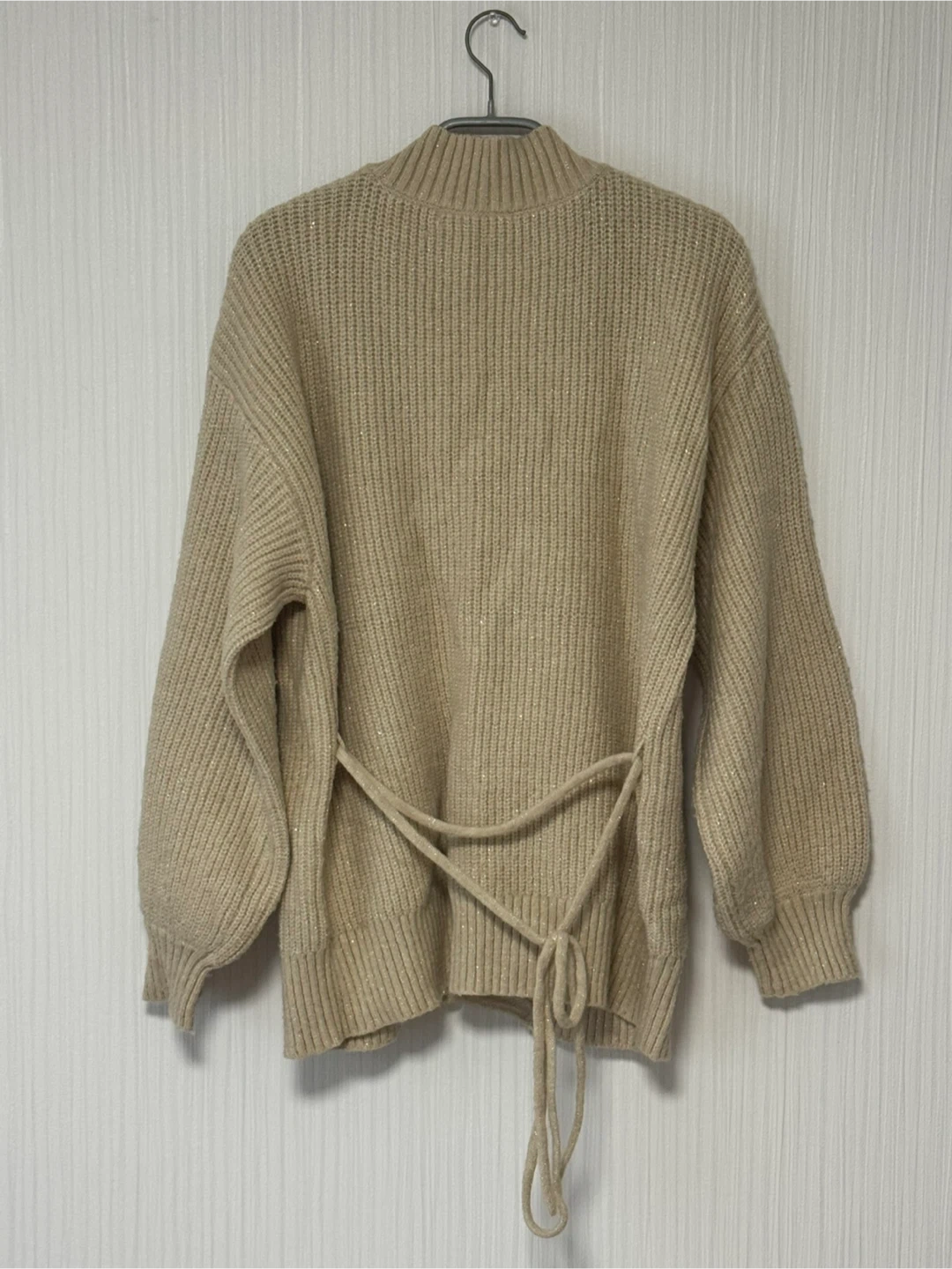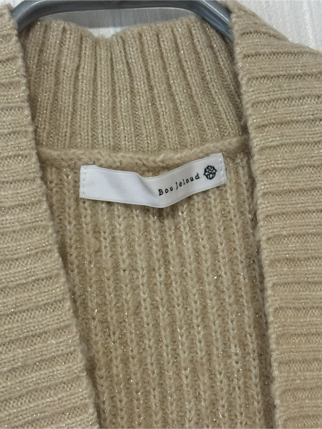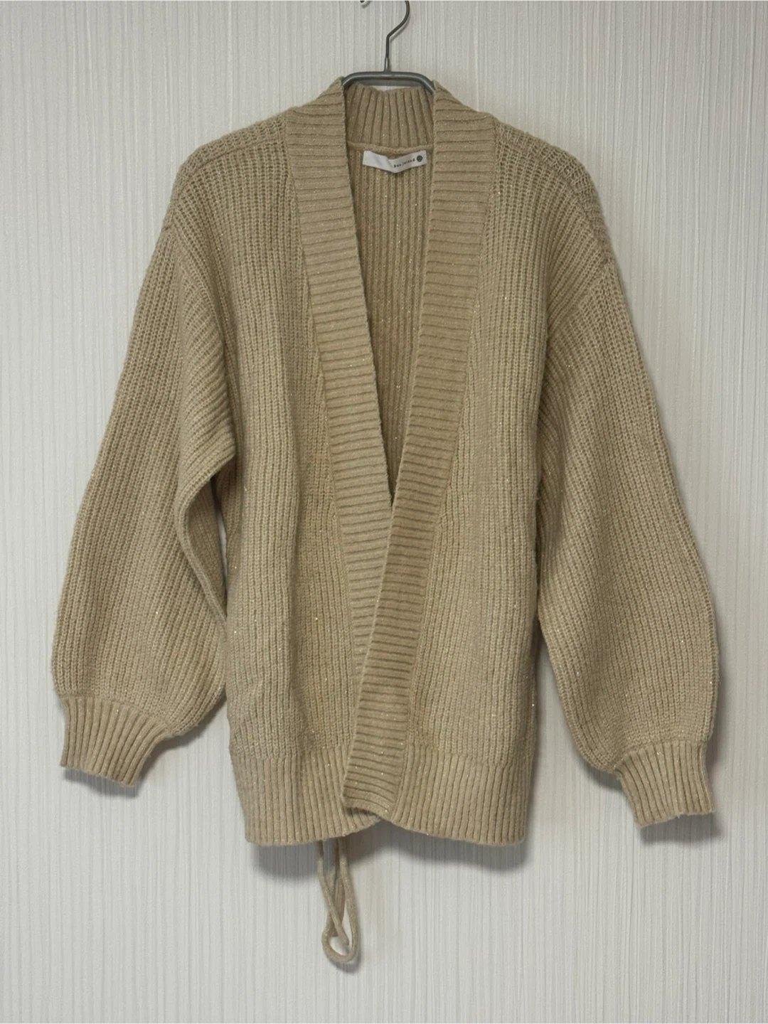 Bou Jeloud(ブージュルード)カーディガン 控えめなラメが織り込まれたカーディガンです。 紐が付いているので前で結んだコーデや後ろで結んだコーデなど変化が楽しめます。 10回程度の着用で、まだまだキレイだと思います。 着丈63cm