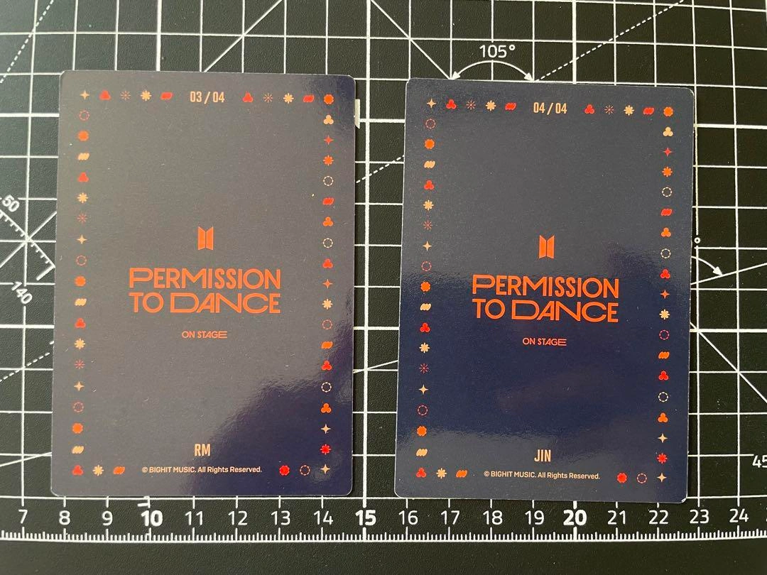 見ていただきありがとうございます! BTS Rm and Jin ♡︎ Permission To Dance ミ二トレカ セット販売/トレカ2枚 これは正式な製品です。 目立った傷や汚れ等はありませんが、初期スレ等はご理解頂ける方のみお願い致します。 包装 + 暗所に保管 梱包方法; バブルメーラー、トップローダー、ハードケース、防水加工 ご希望の方はお気軽にご連絡ください。