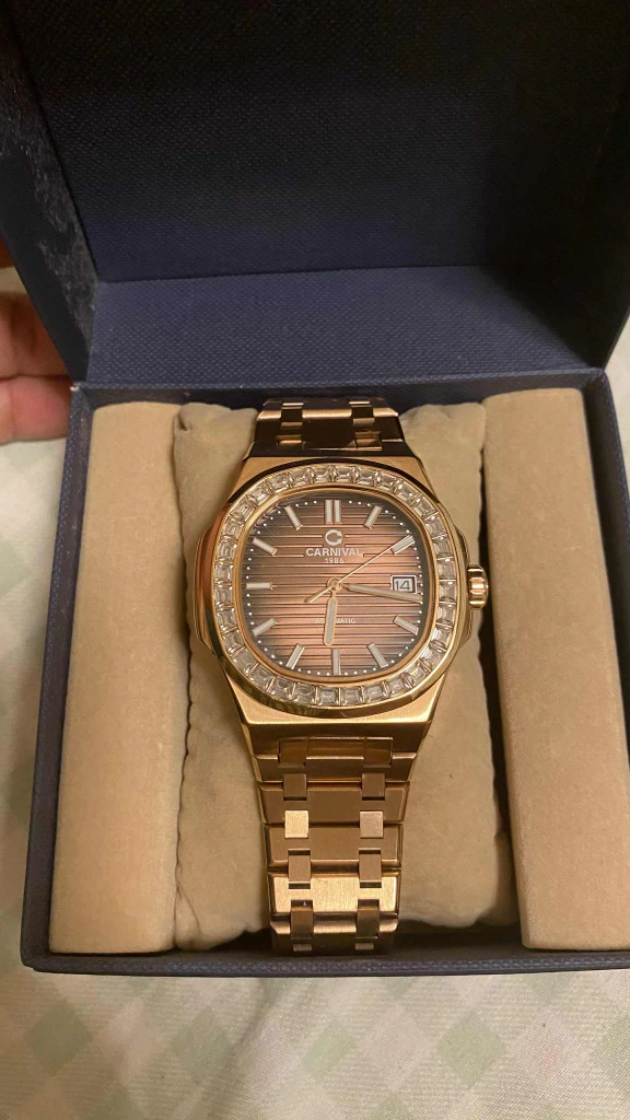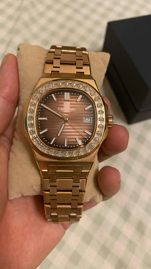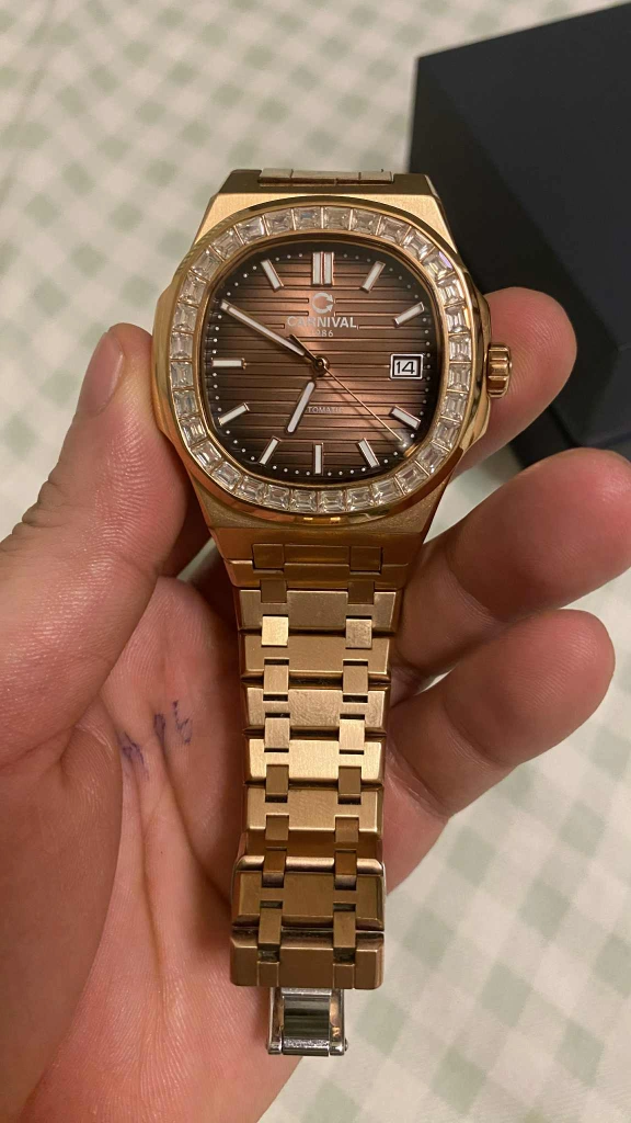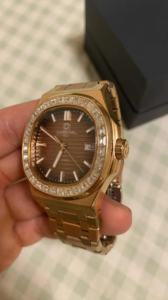 CARNIVAL 1986 オートマチック腕時計 ゴールドカラー × ブラウン文字盤 ベゼルにストーン装飾あり 動作良好、時間のズレもほとんどありません。 外観も綺麗で、目立った傷や汚れはありません。 自動巻きモデルで、日付表示付きです。 腕回り:約16〜18cmの方にちょうど良いサイズです。 おしゃれで高級感のあるデザインなので、 フォーマルにもカジュアルにも使えます。 付属品:純正ボックスあり。 即購入OK 商品状態 目立った傷や汚れなし ご覧いただきありがとうございます。