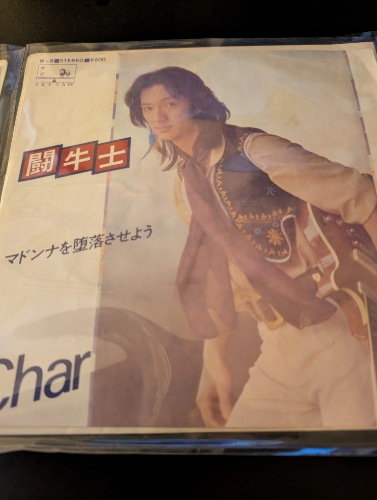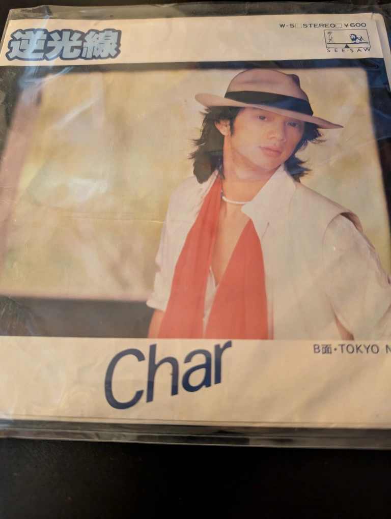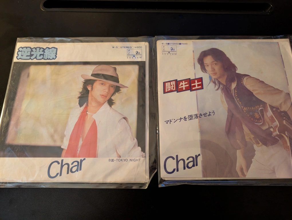 Charのシングル「逆光線」と「闘牛士」を収録したレコード。 - アーティスト名: Char - 曲名: 逆光線 - B面曲名: TOKYO NIGHT - 曲名: 闘牛士 - B面曲名: マドンナを堕落させよう