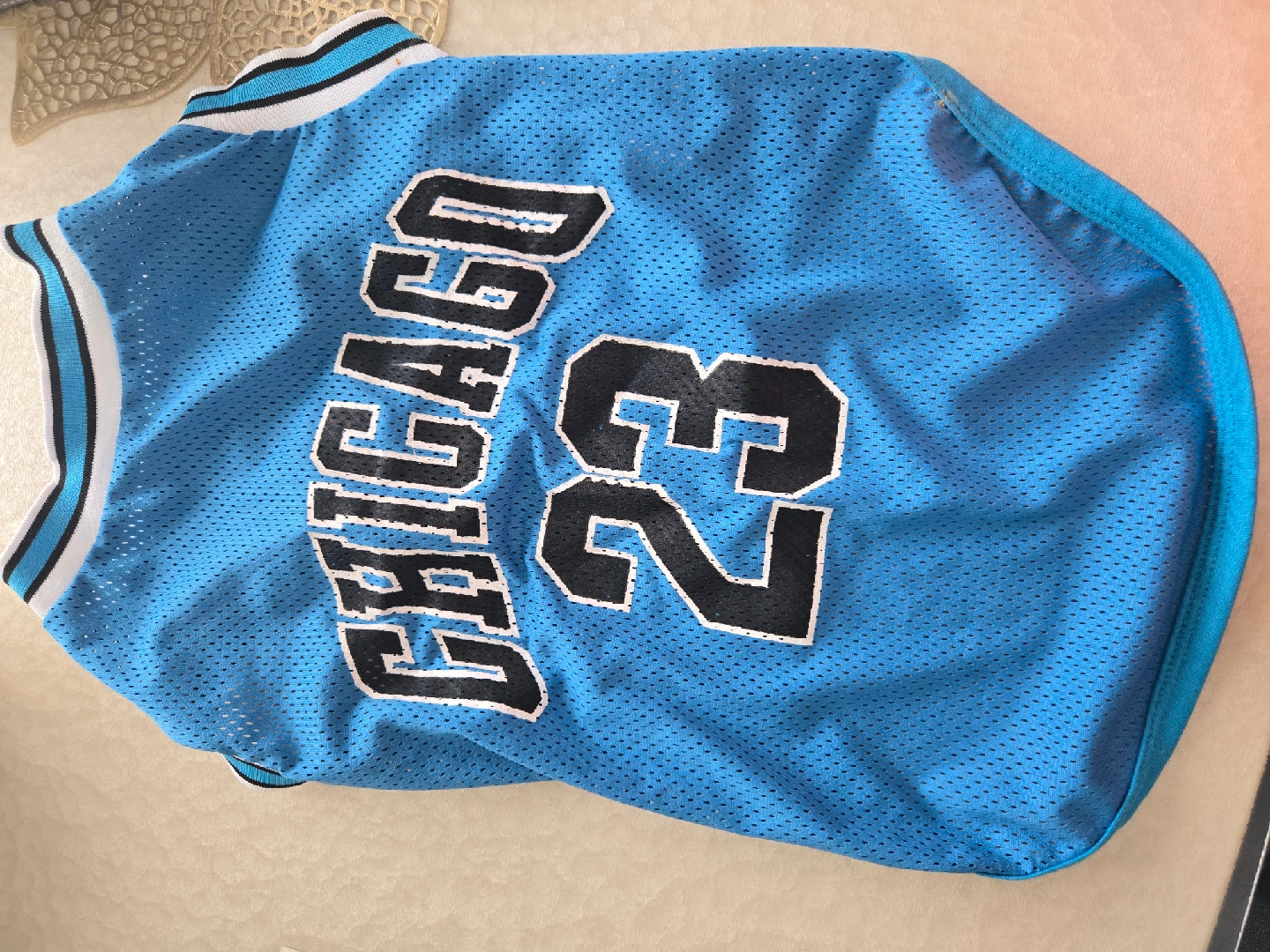 CHICAGO 23のドッグウェアです ・カラー:水色 ・サイズ:2XL ・素材:ポリエステル100% 中古品であることご了承ください (見た目と違ってサイズが小さすぎます。 家でサイズチェックを兼ねて2回着ました。 15キロで中型犬くらいは合うと思います。 うちの犬が20キロほどで購入しましたが、サイズが小さかったです。Amazon で1000円くらいで買いました)