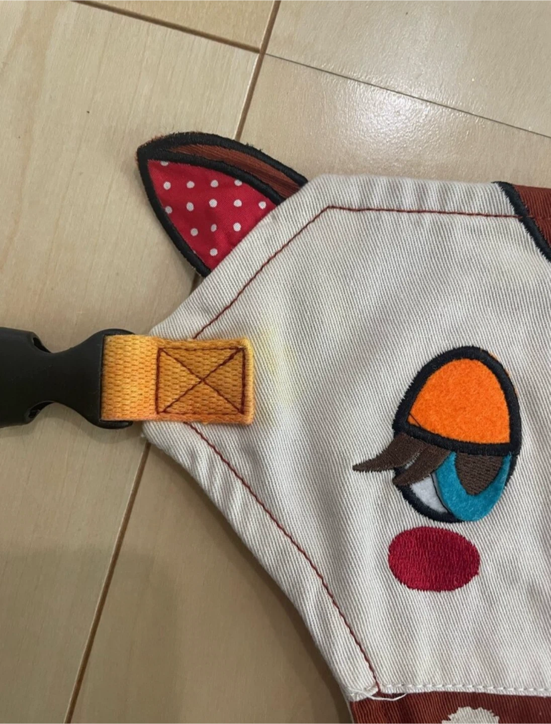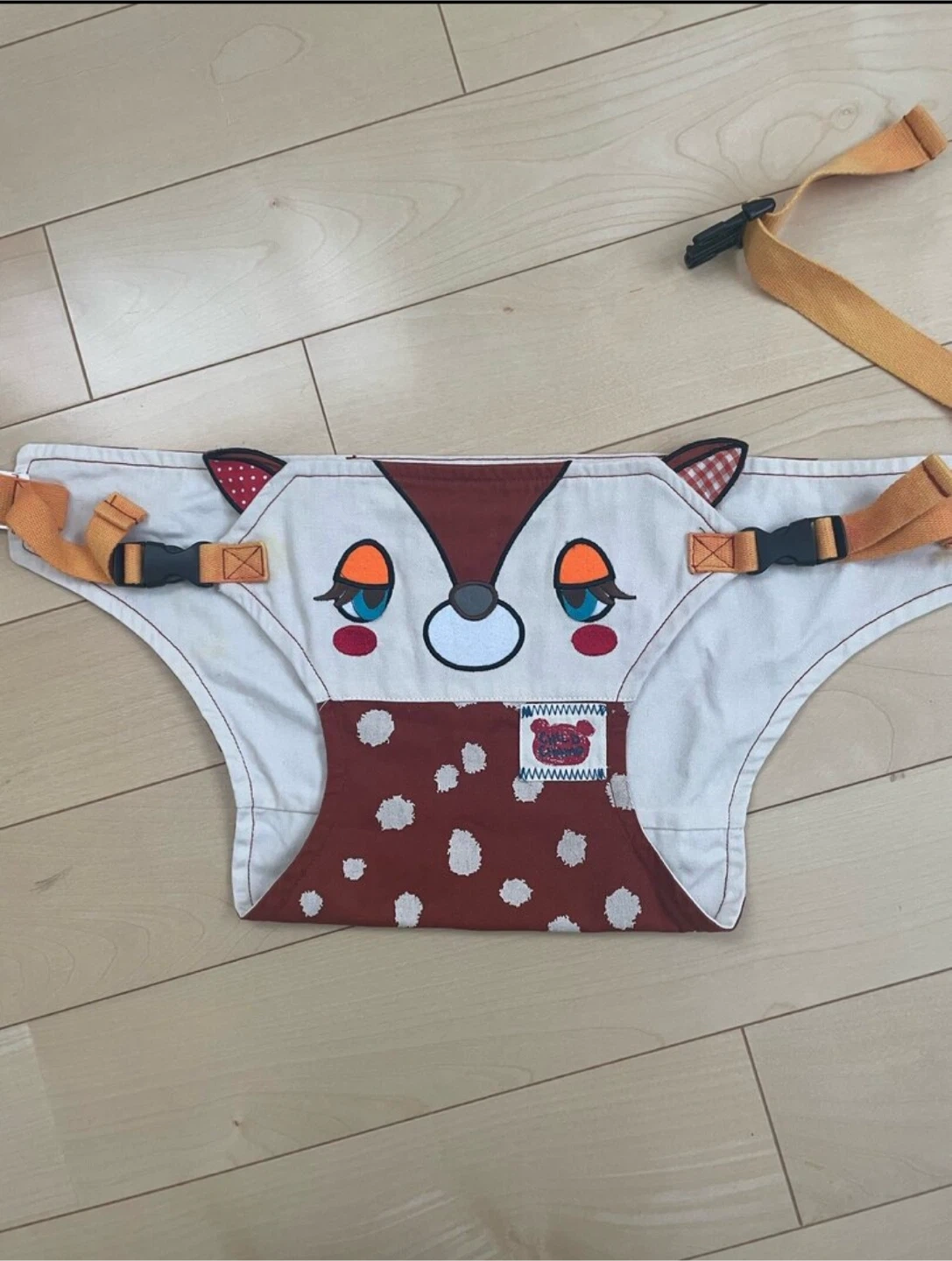 ベビーチェアシートです。 外出先でのレストランや帰省先などでベビーチェアがない場合に大活躍する補助チェアベルト。動物のキャラクターがとってもかわいい☆ 大人用のイスにベルトで留めるだけの簡単装着で、赤ちゃんを安全にひとりでおすわりさせることができます お腹から胸まで布地があるので、前のめりにならずしっかりと支えられるので安心です。 もし、椅子に座ることを嫌がるお子さまの場合は、椅子の代わりにママやパパの腰に付けることで、一緒の椅子に座りながらお食事ができます。 お出かけが多く、荷物をかさ張らせたくないママやパパにおすすめのアイテム ・色:ホワイト、ブラウン ・デザイン:鹿 ・状態:シミが数カ所あり、使用感あり 中古品であることご了承ください