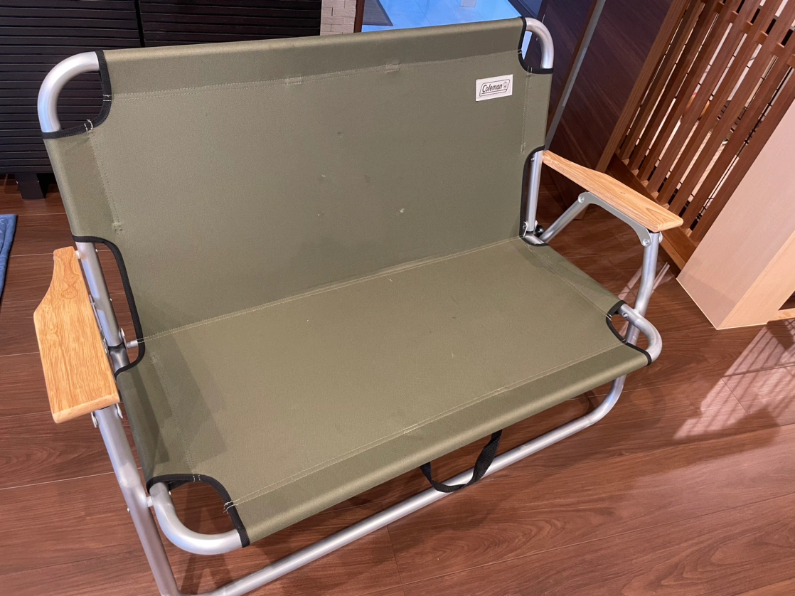 ご覧いただきありがとうございます。 こちらは、Colemanキャンプチェアです。 2人で座れて、低い設計で重心が安定しているため、お子様がいるご家庭では重宝するかと思います。 キャンプで使用したため、多少のキャンプ使用での汚れや擦れはございます。